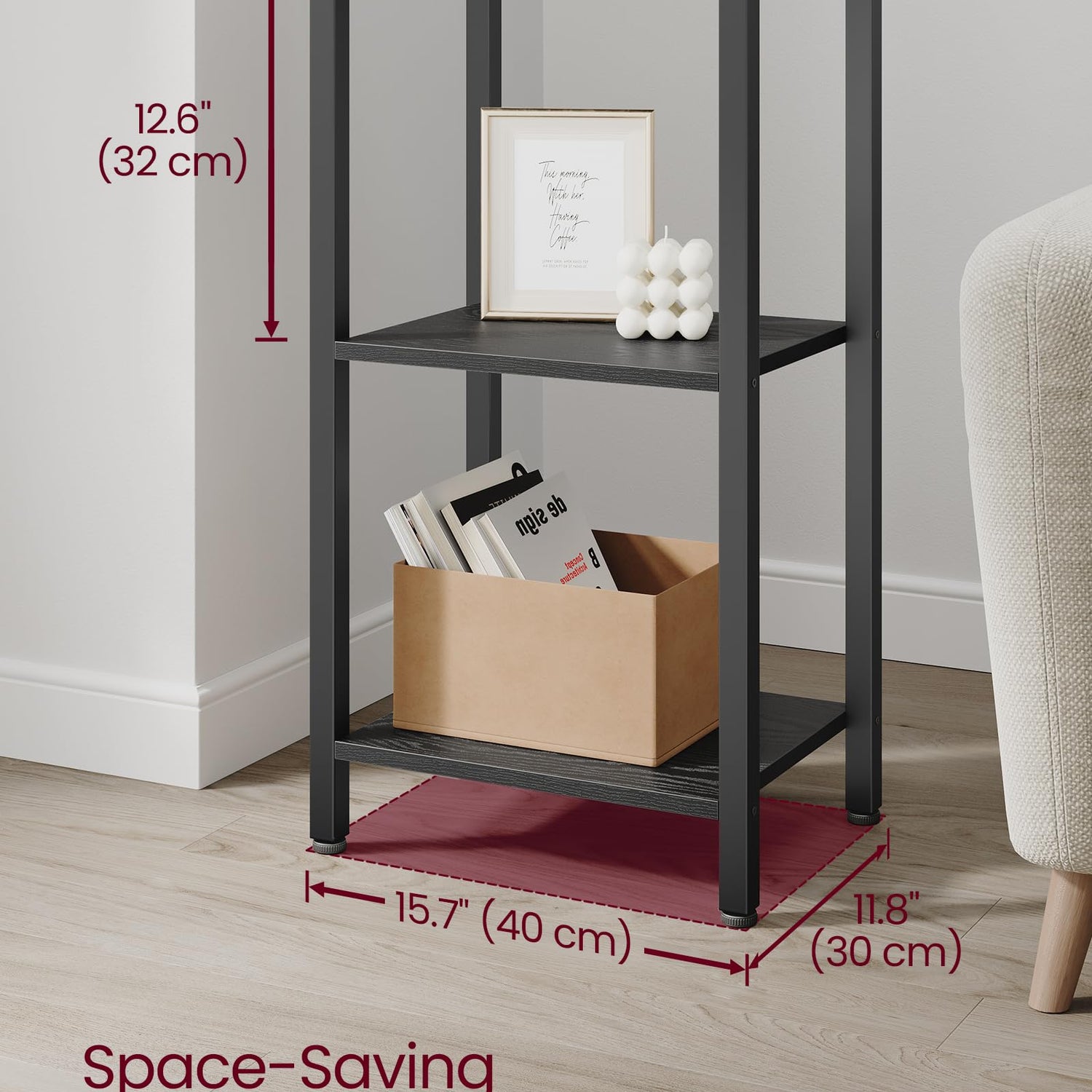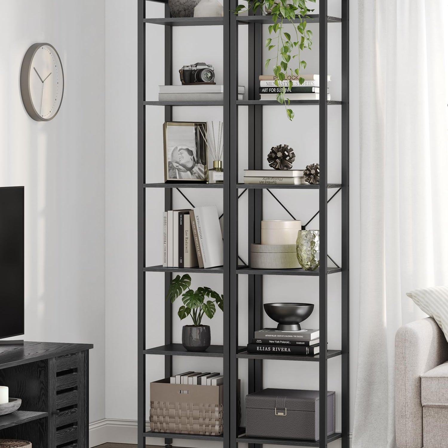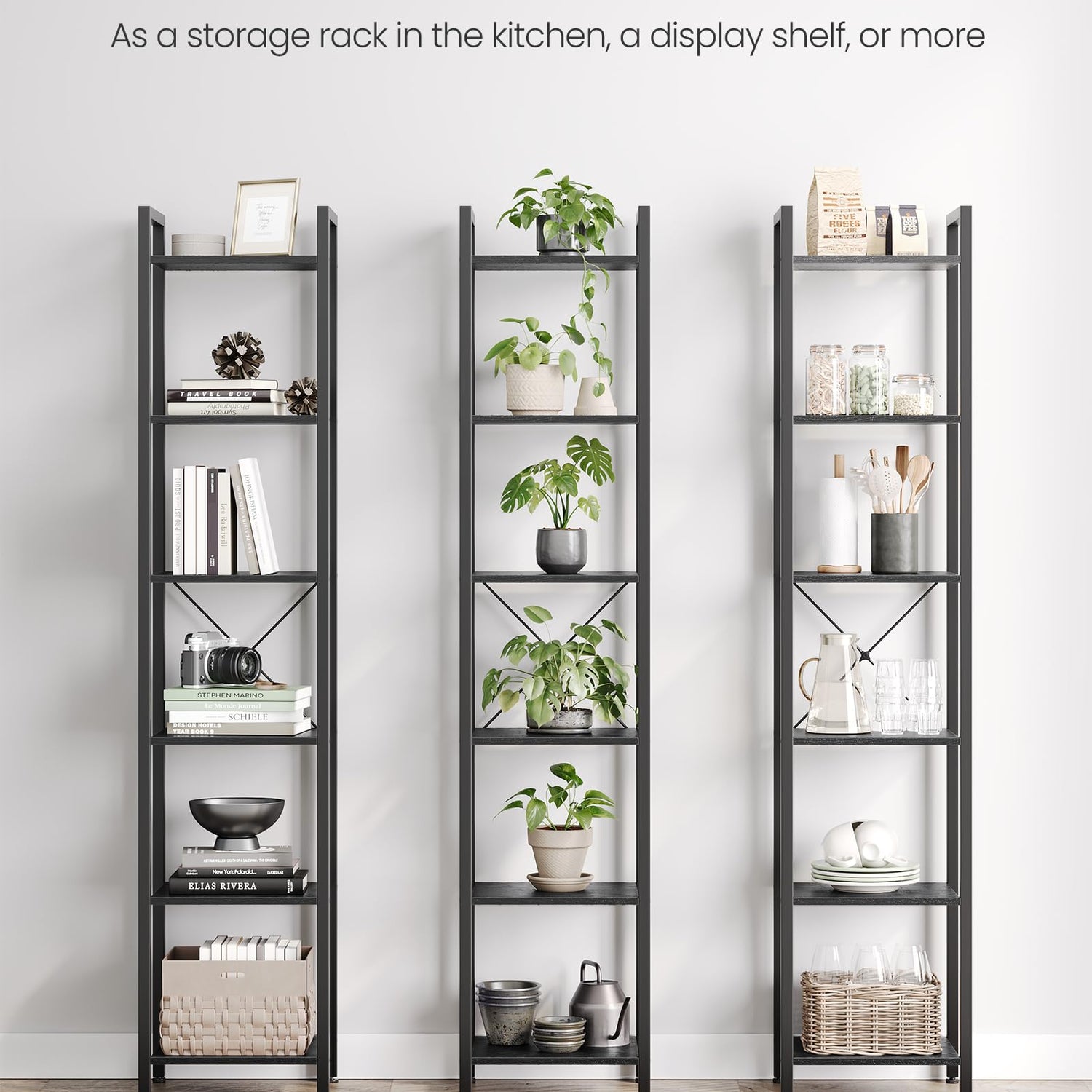 - [Embrace an Industrial Vibe] The ebony black shelves paired with a black steel frame create a stylish industrial look, allowing this freestanding shelf to fit seamlessly in with your home decor and give your space an instant update