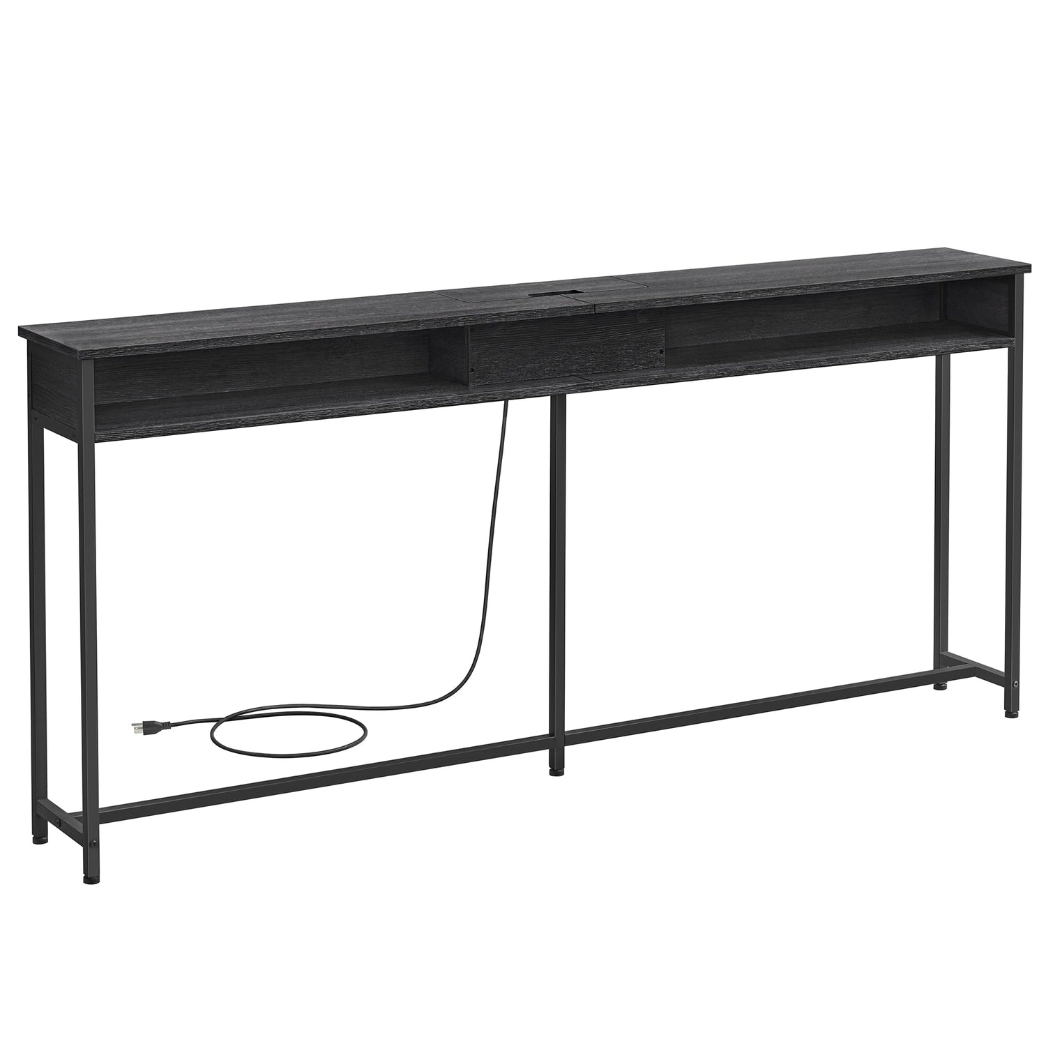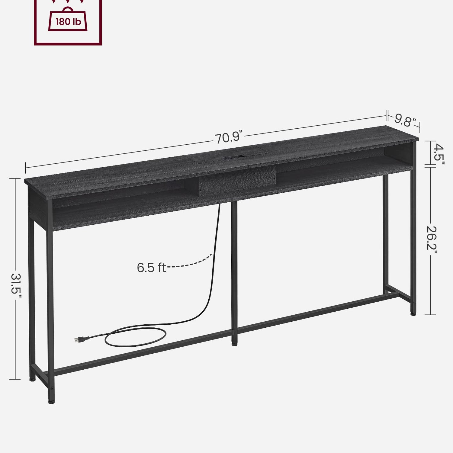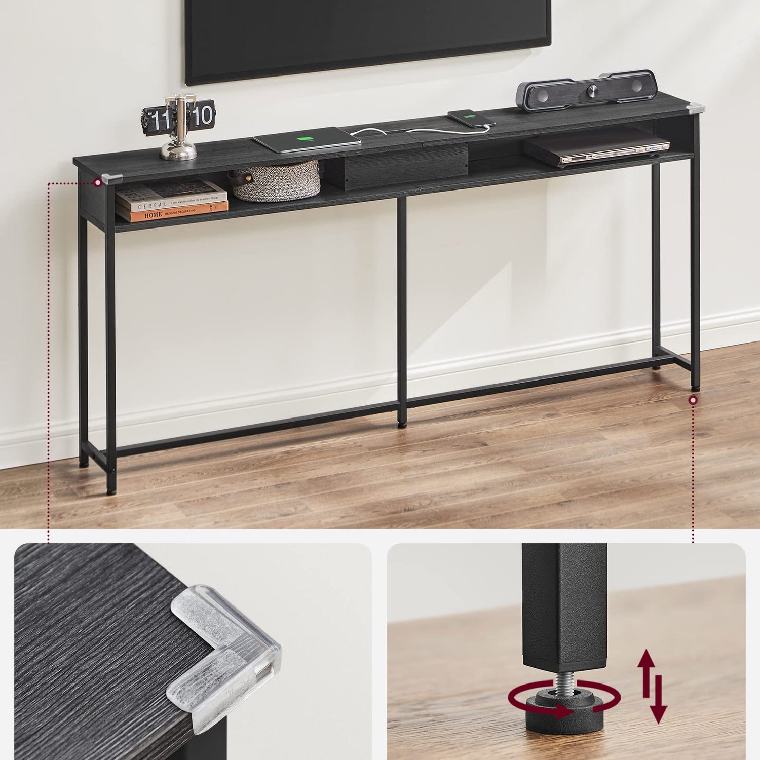VASAGLE 70.9-Inch Console Table with Outlet and Shelves, Sofa Table with Charging Station, Behind Couch Table Skinny, Entryway Table for Hallway, Living Room, Charcoal Gray and Ink Black ULNT118B22