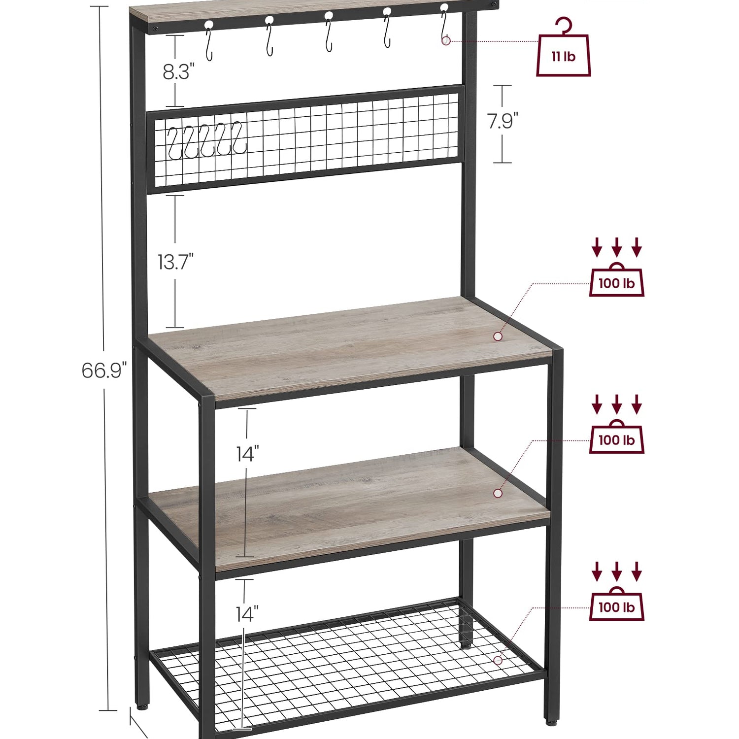 VASAGLE Bakers Rack, Coffee Bar, Kitchen Storage Shelf Rack with 10 Hooks, 3 Shelves, Adjustable Feet, for Microwave Oven, 15.7 x 33.1 x 66.9 Inches, Industrial, Greige and Black UKKS017B02