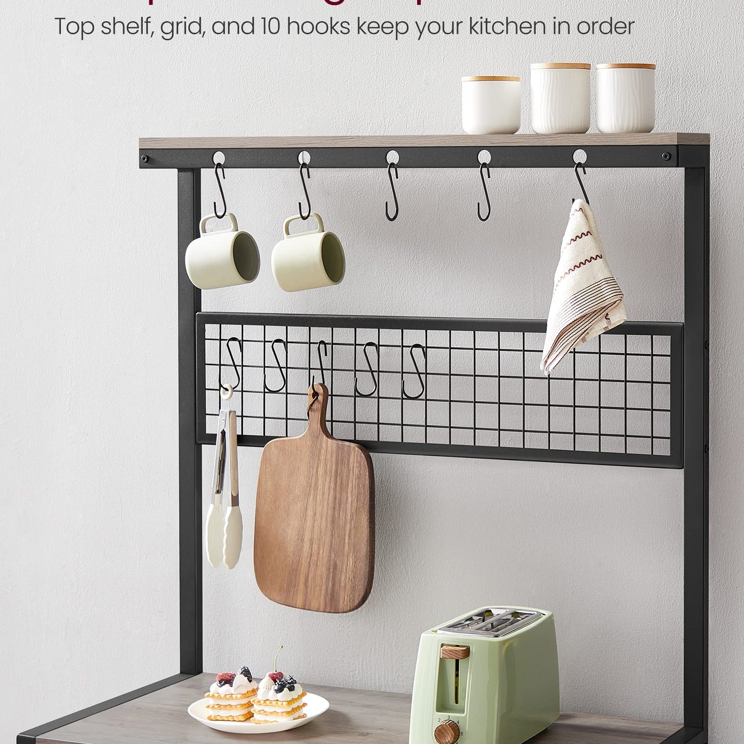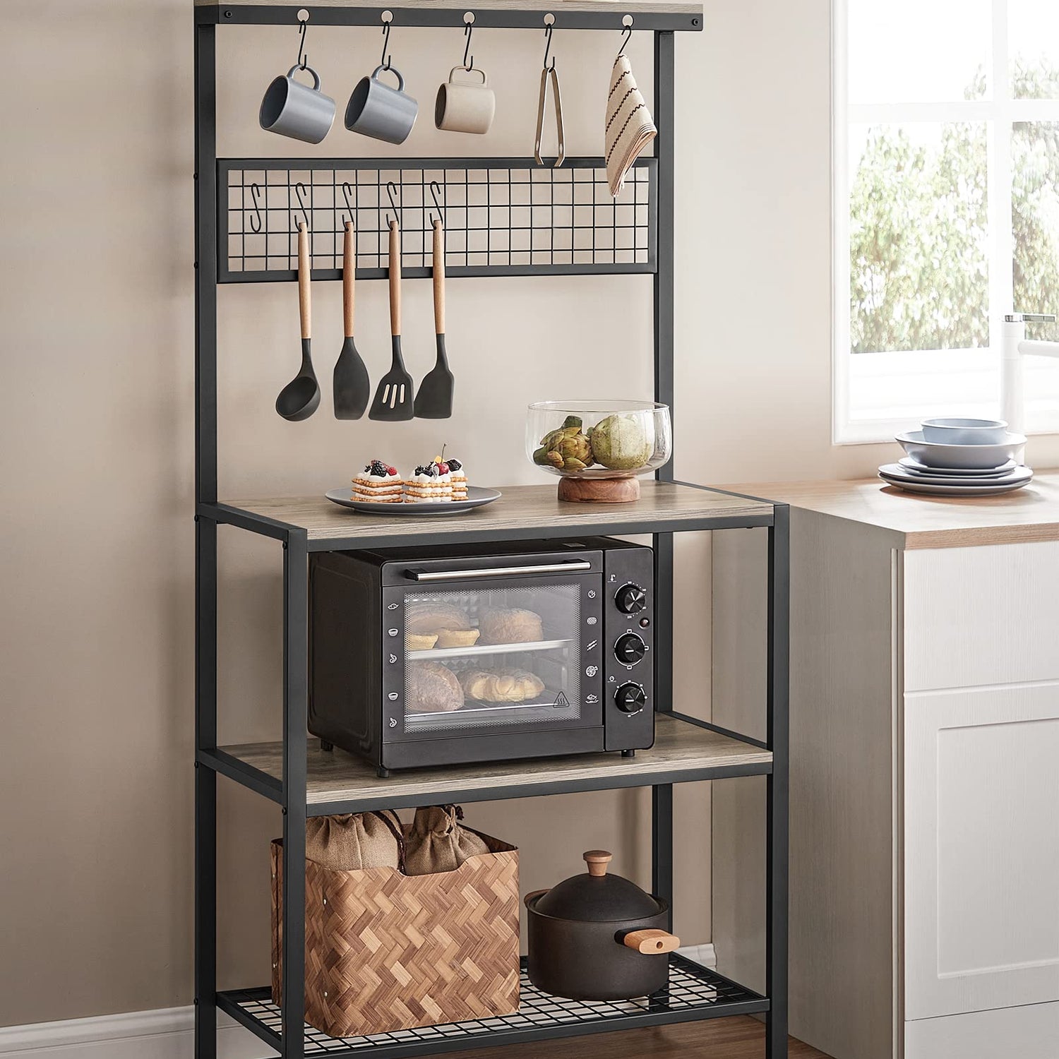 - Free Your Imagination: Place pots on the 3 shelves, customize the mesh panel by hanging cups and potholders, leave ladles and spatulas on the top hooks, and use the top narrow shelf for spice jars—now it's up to you!