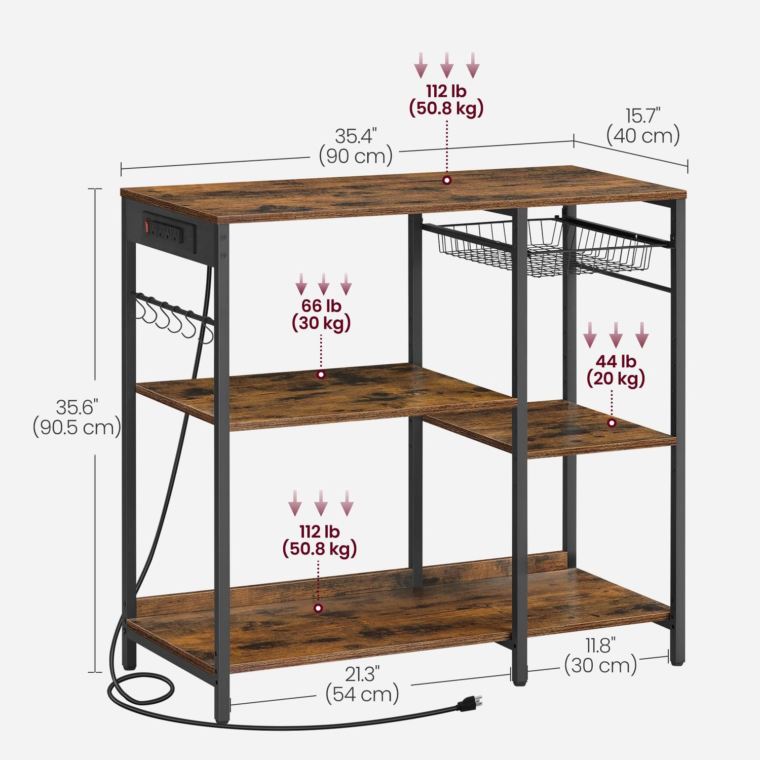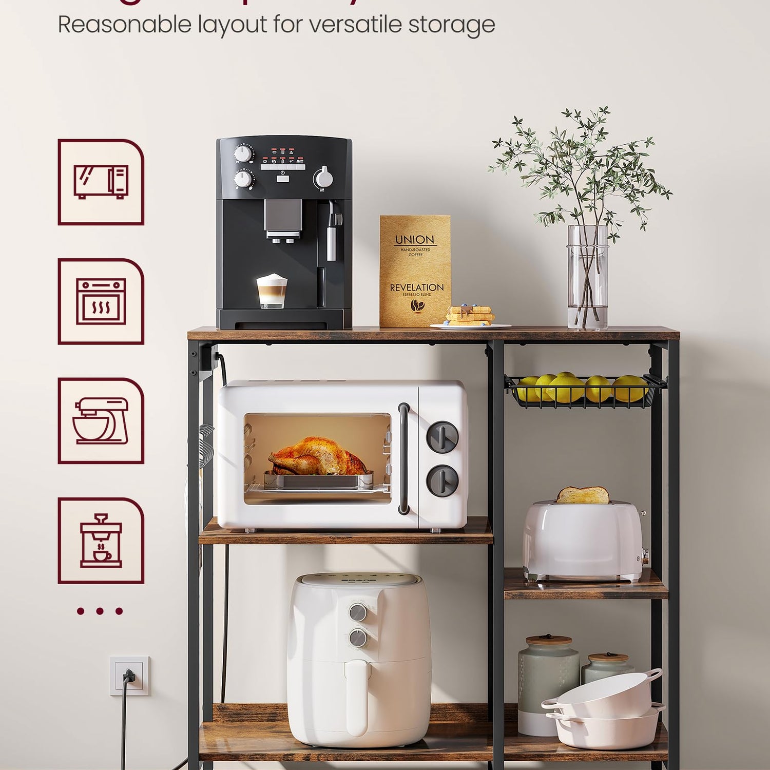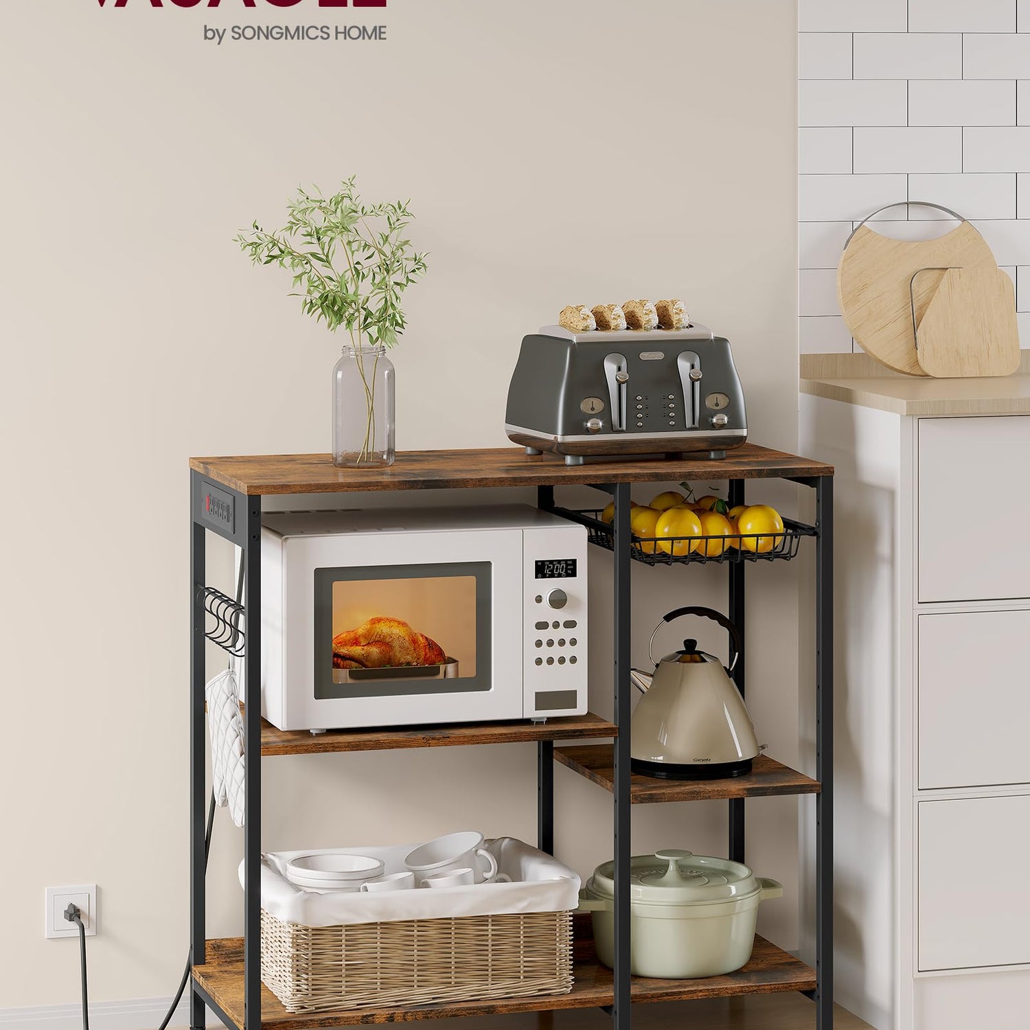 - [Baker’s Rack with Power Outlet] The power strip has 4 AC outlets to allow you to plug in multiple appliances, supporting up to 1875 watts. Its built-in design keeps the cord hidden for a tidy look