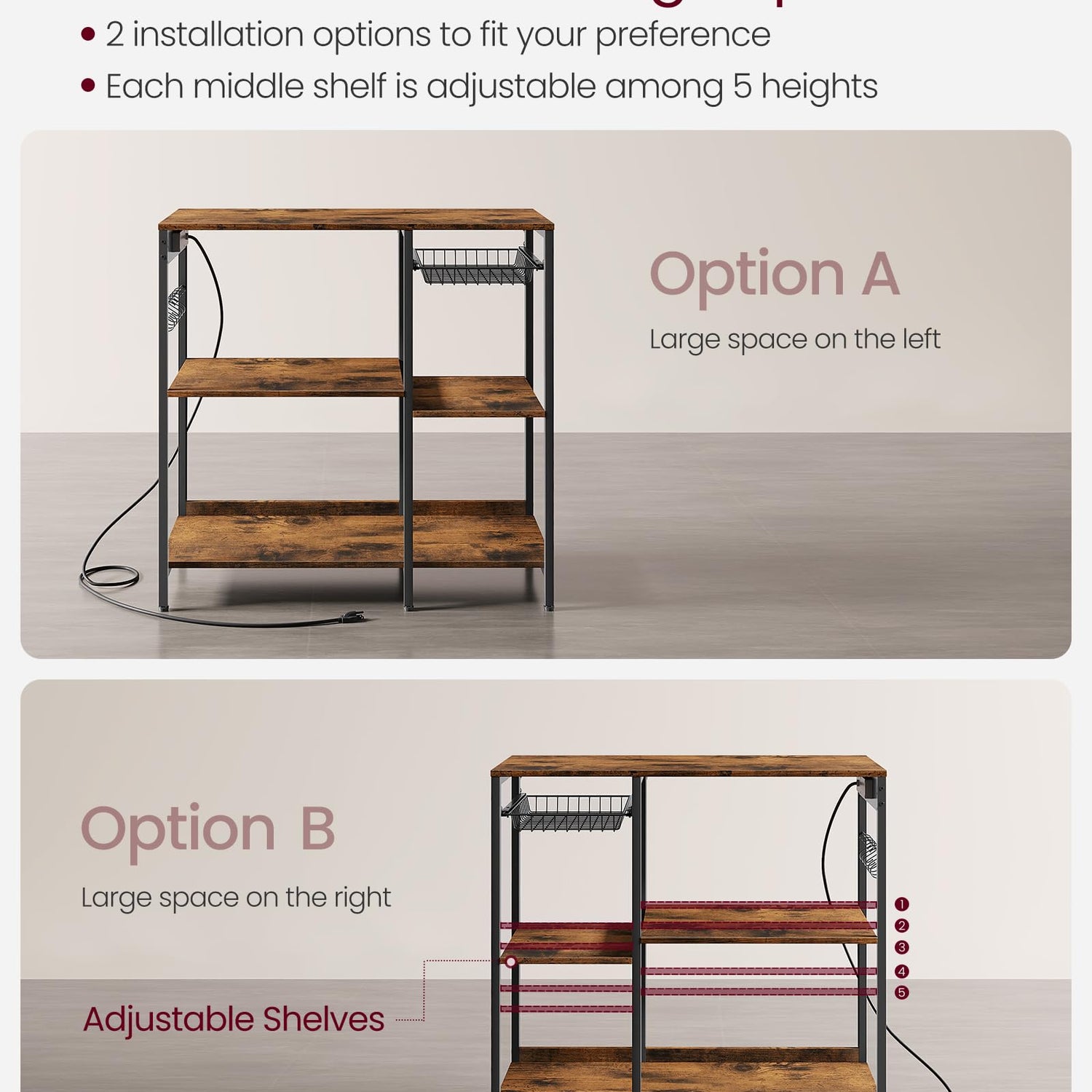 - [Adjustable and Flexible] Each of the two middle shelves on this kitchen rack can be adjusted among 6 heights to fit appliances of varying sizes. Additionally, the storage space provides two installation options, catering to your preferences