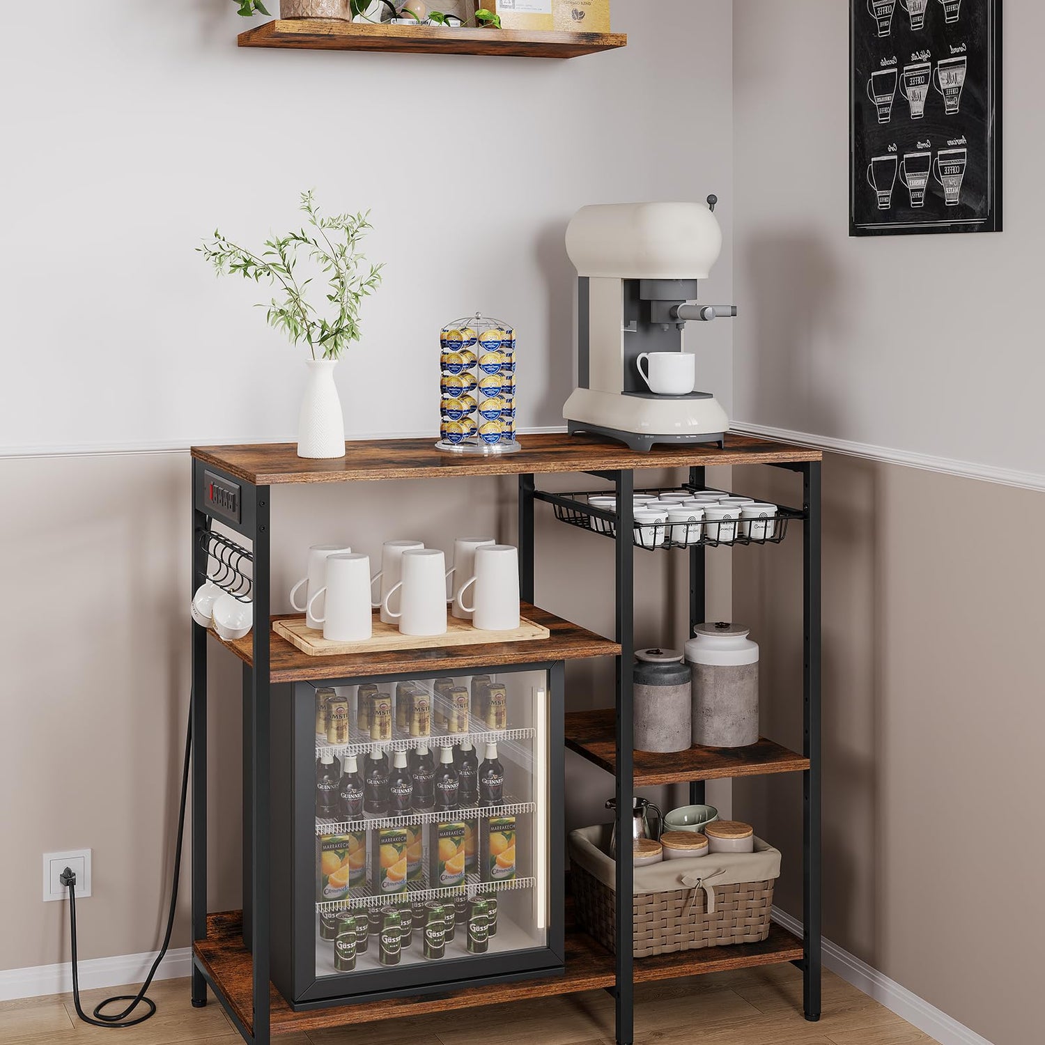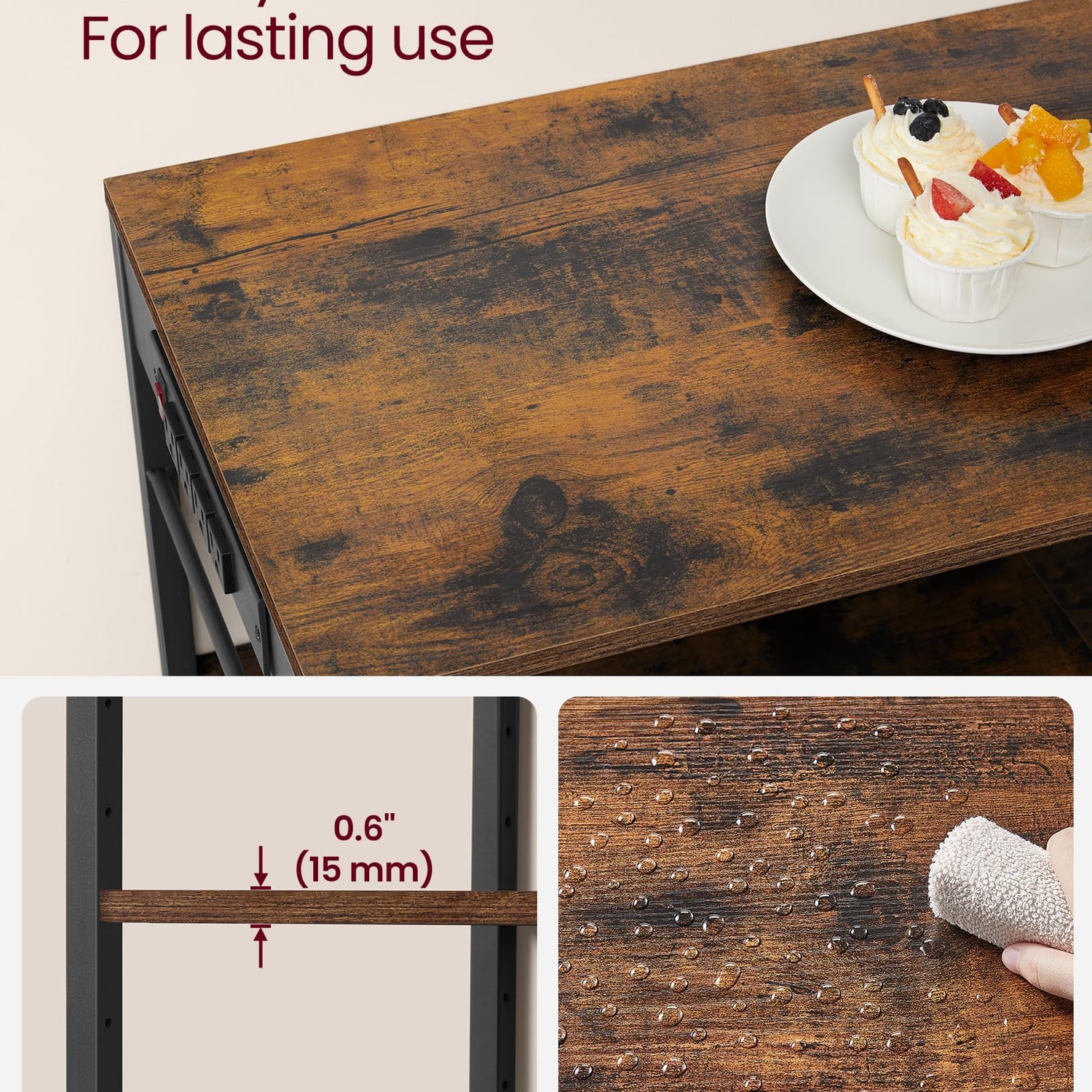 - [Stylish and Sturdy] With rustic brown particleboard and an ink black steel frame, this coffee bar table station is not only aesthetically appealing but also sturdy, boasting a total static load capacity of 400 lb