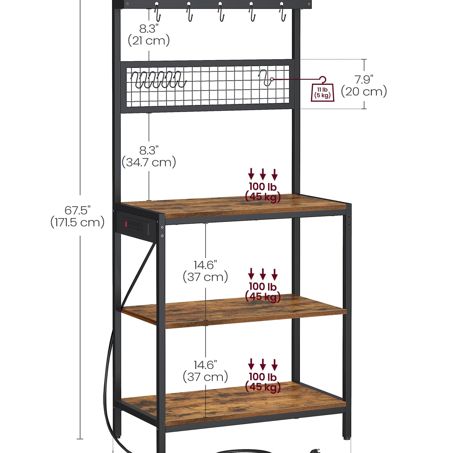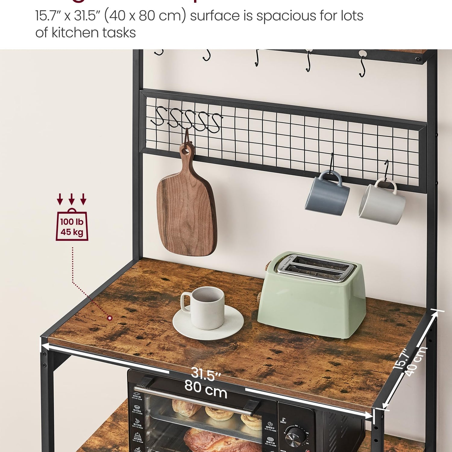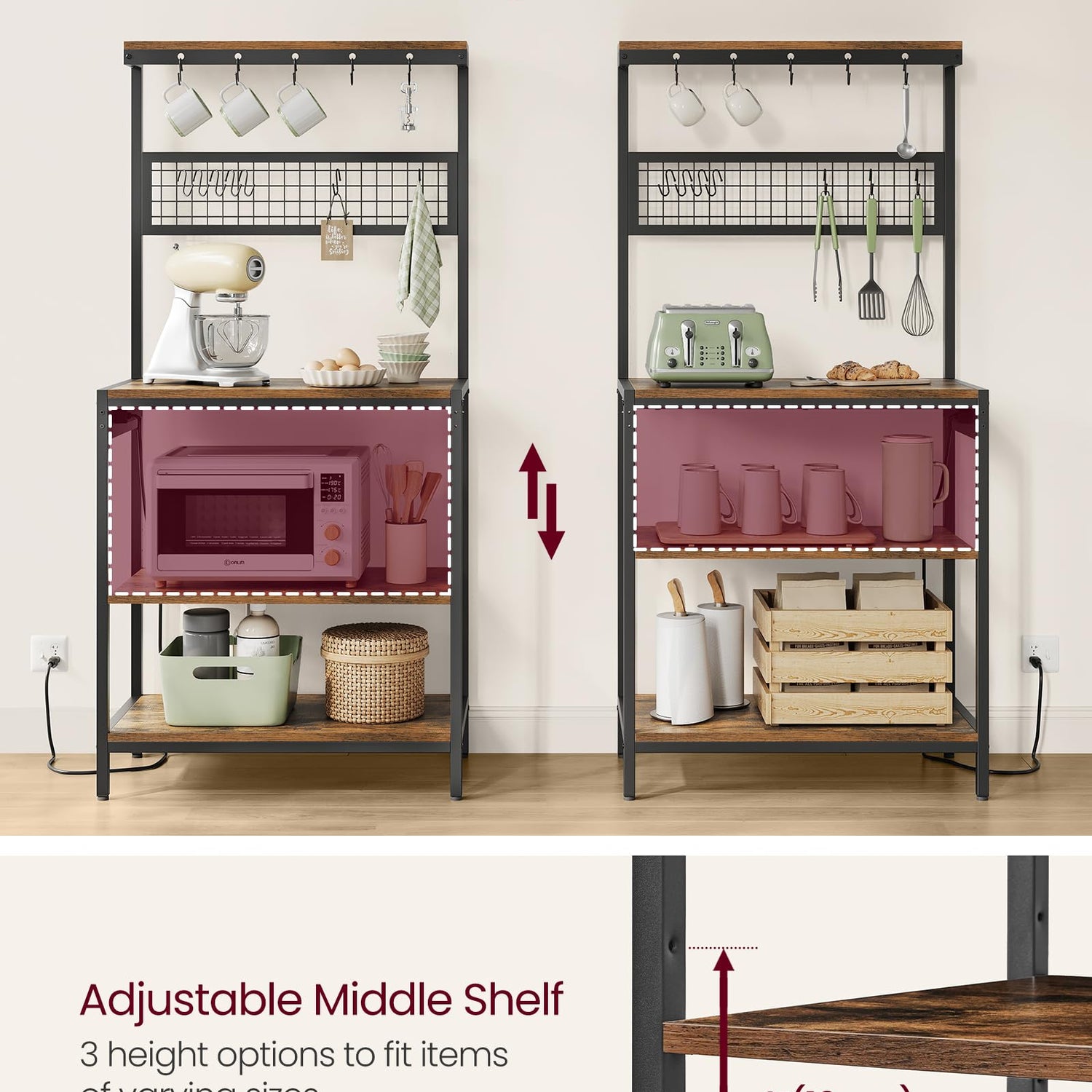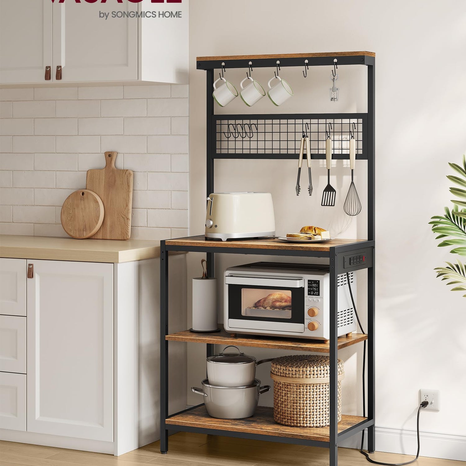 VASAGLE Bakers Rack with Charging Station, 31.5 Inches Coffee Bar Stand with Adjustable Storage Shelf, Grid Panel, 12 Hooks, Table for Microwave, Kitchen, Rustic Brown and Ink Black UKKS016K01