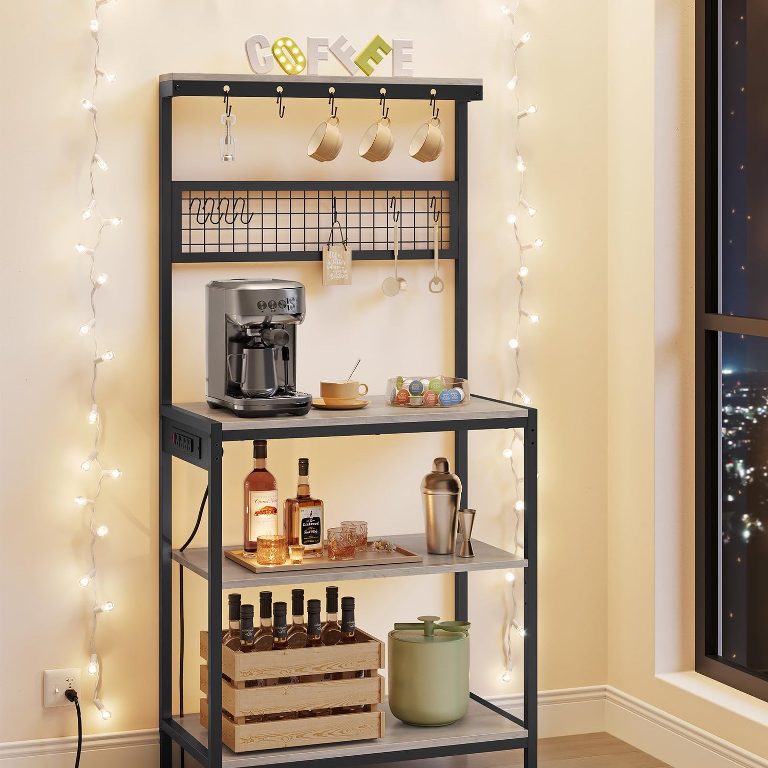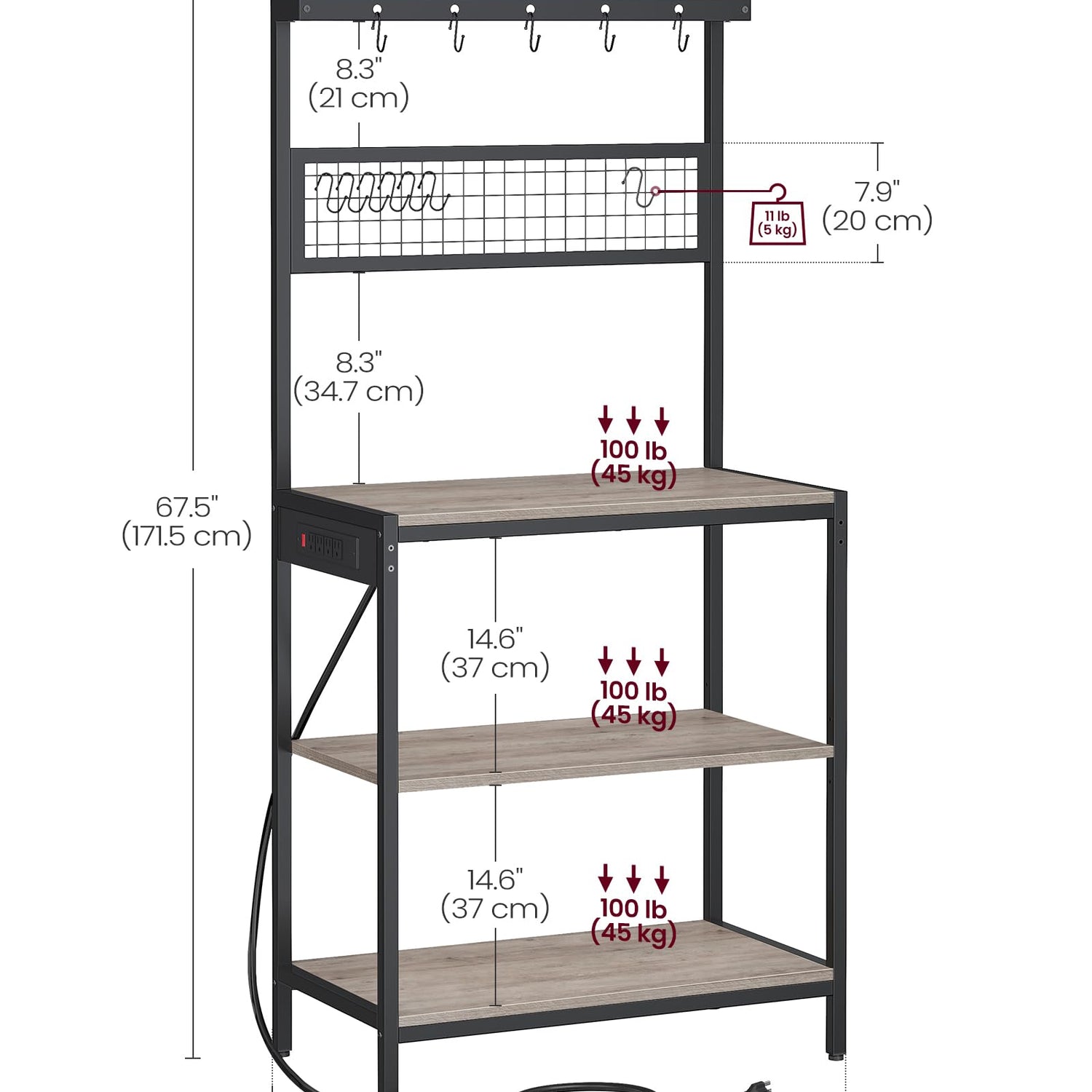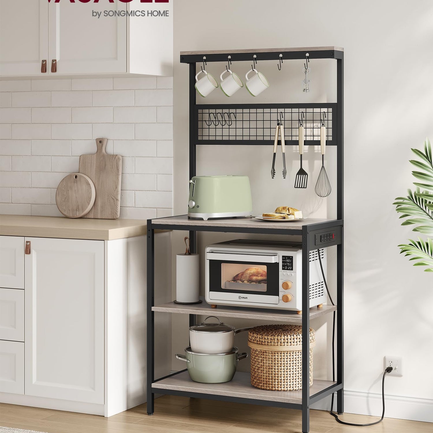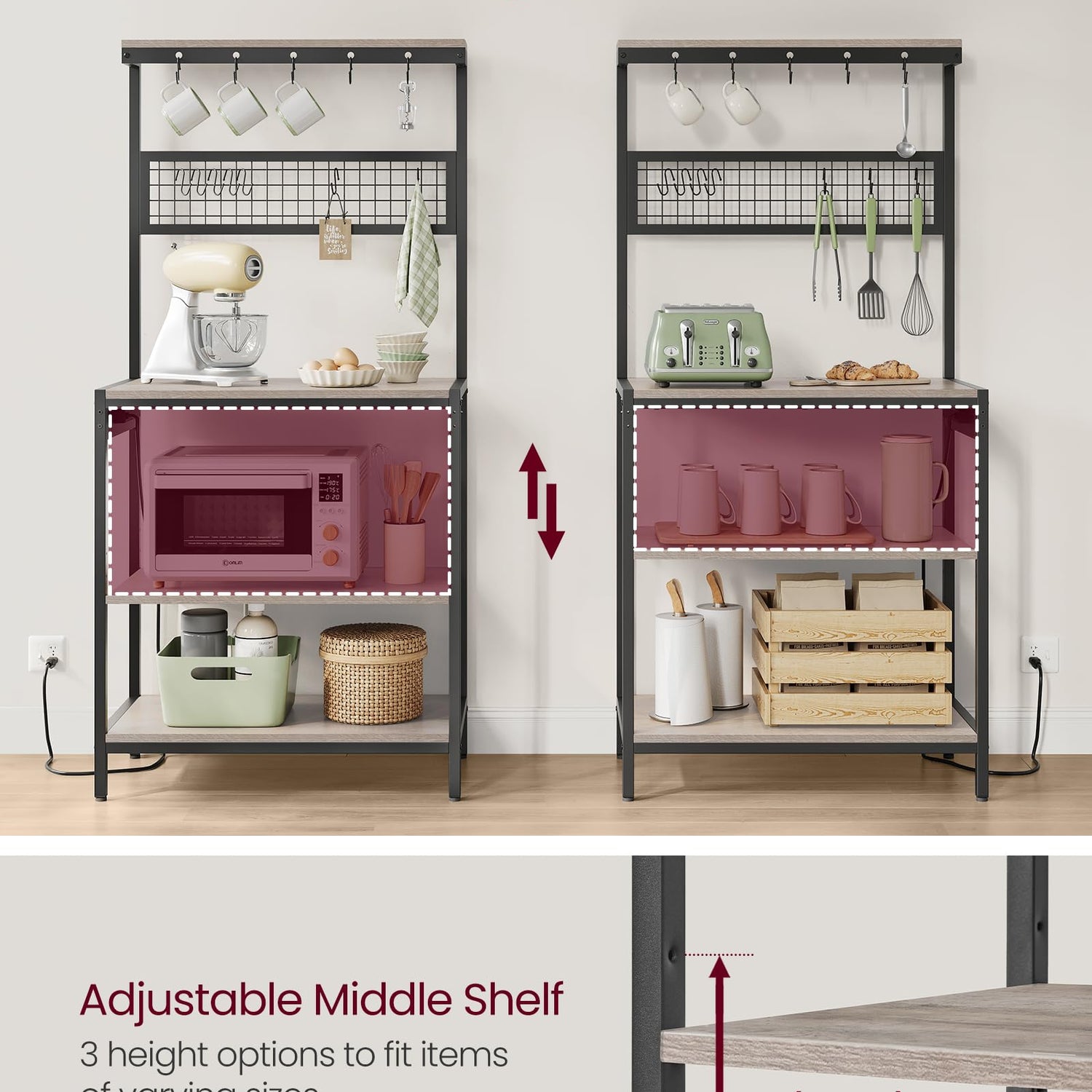VASAGLE Bakers Rack with Charging Station, 80 cm Coffee Bar with Adjustable Storage Shelf, Microwave Stand, Grid Panel, 12 Hooks, for Kitchen, Heather Greige and Ink Black UKKS016K02