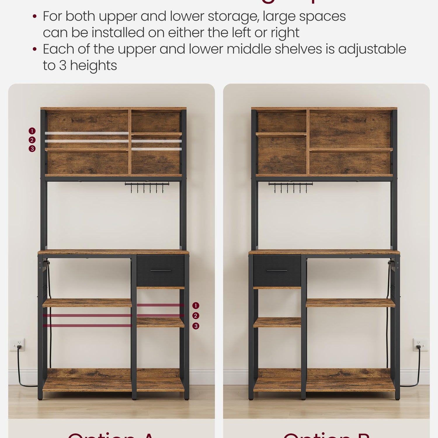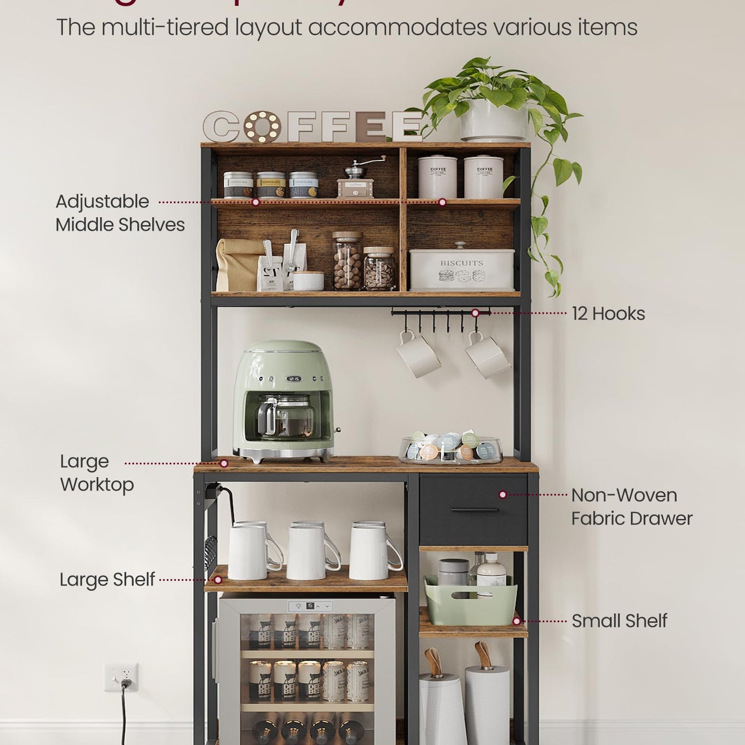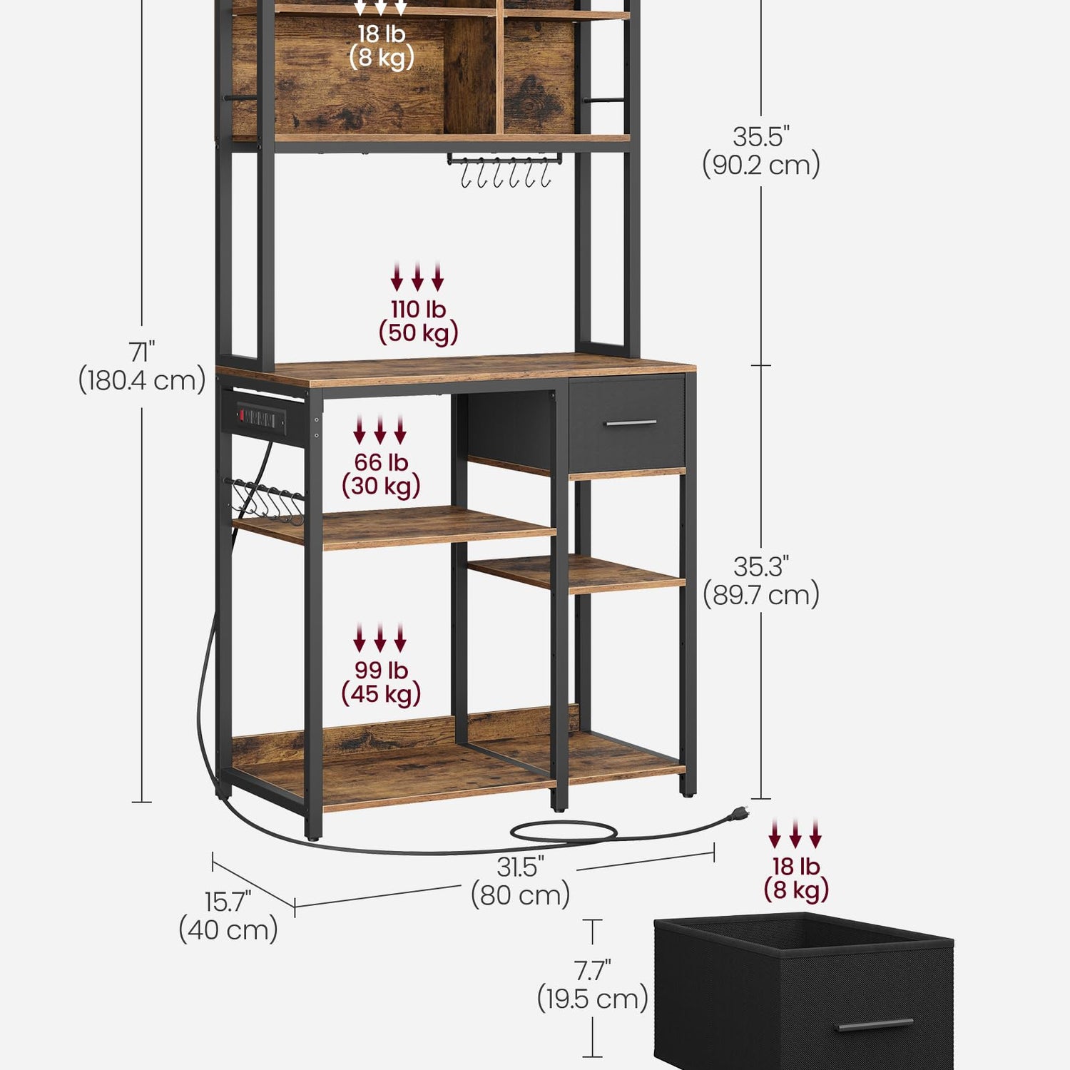 VASAGLE Bakers Rack with Charging Station, Coffee Bar with Adjustable Storage Shelves, Fabric Drawer, 12 Hooks, 15.7 x 31.5 x 71 Inches, Kitchen Microwave Stand, Rustic Brown and Ink Black UKKS015K01