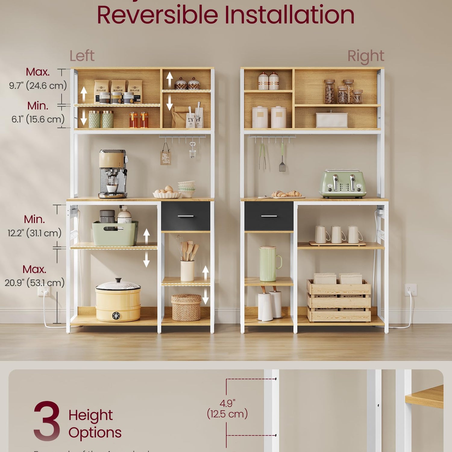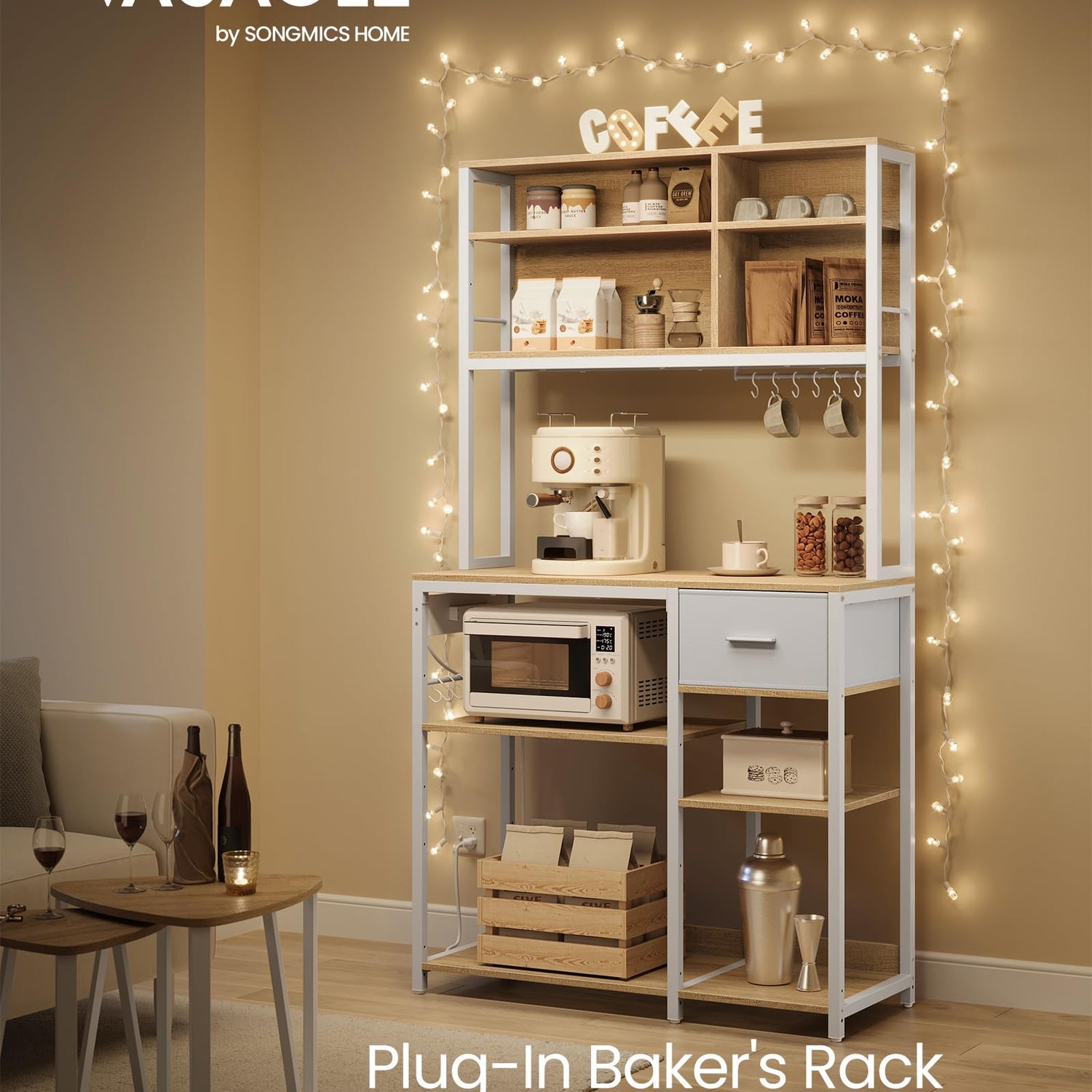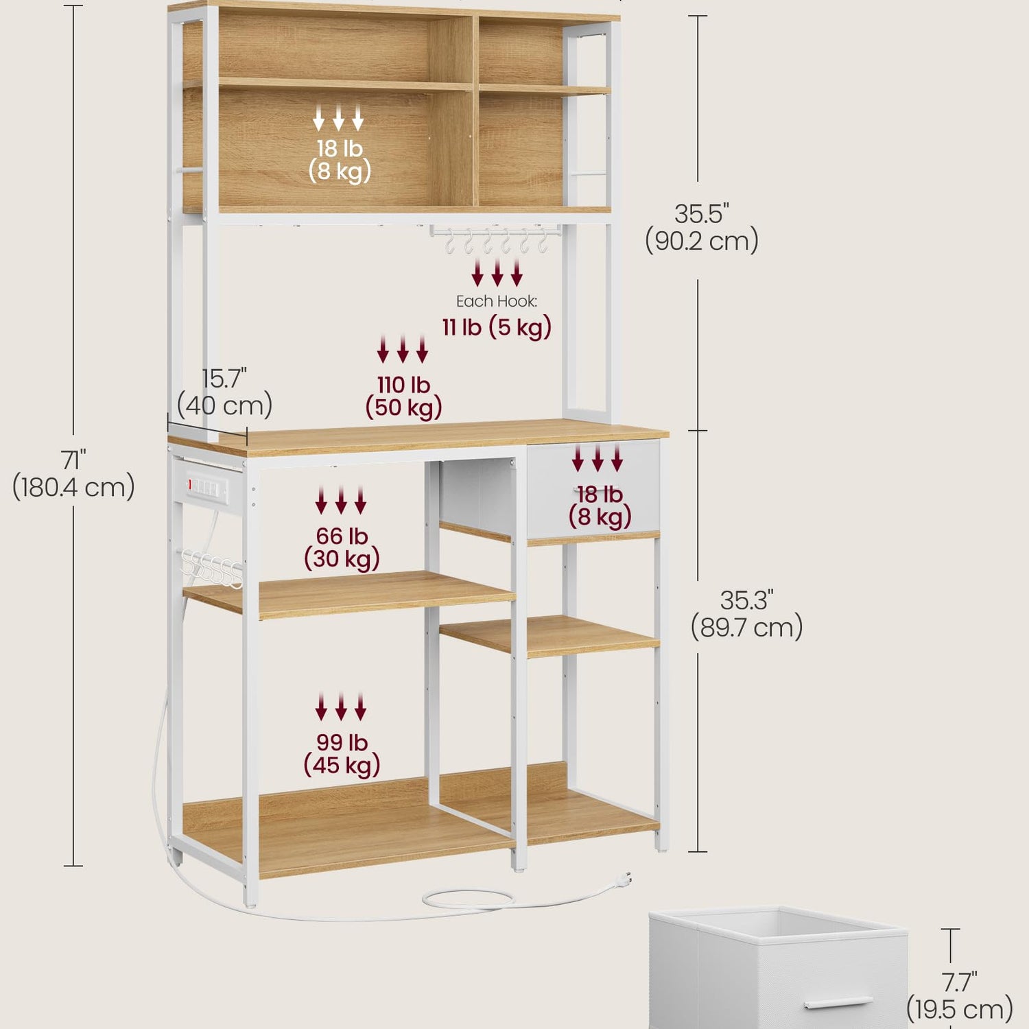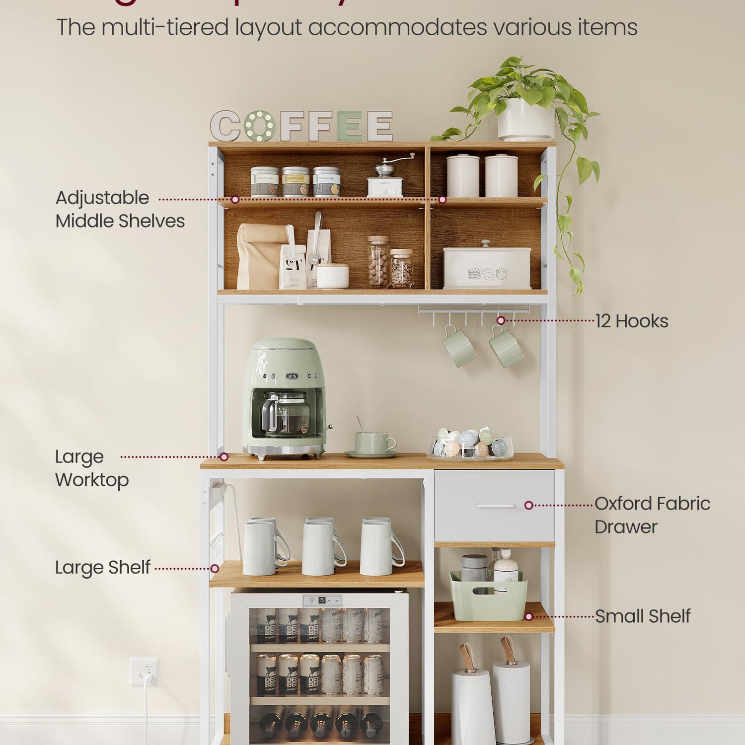 VASAGLE Bakers Rack with Charging Station, Coffee Bar with Adjustable Storage Shelves, Fabric Drawer, 12 Hooks, 15.7 x 39.4 x 71 Inches, Kitchen Microwave Stand, Golden Oak and Cloud White UKKS027Y01