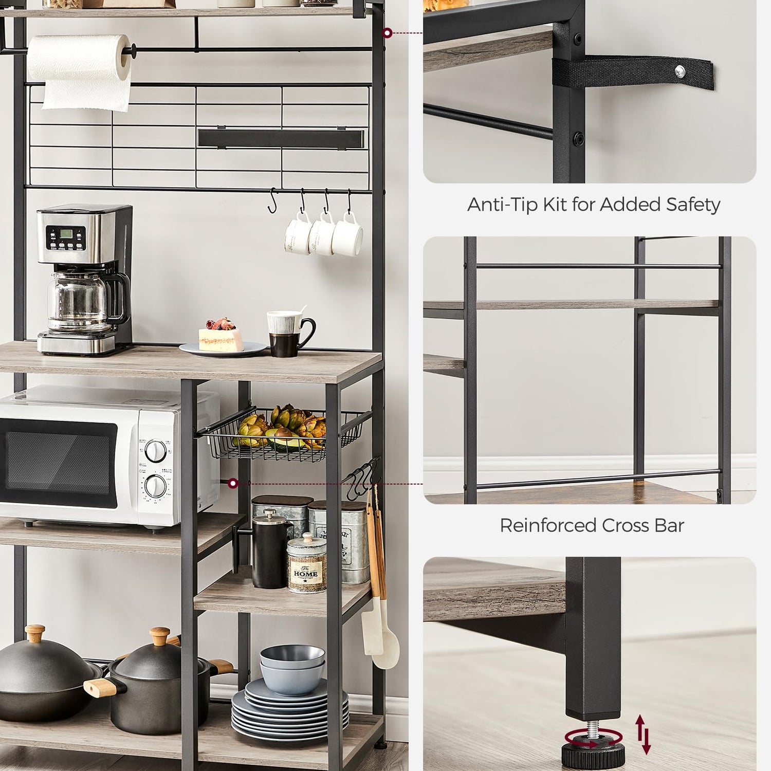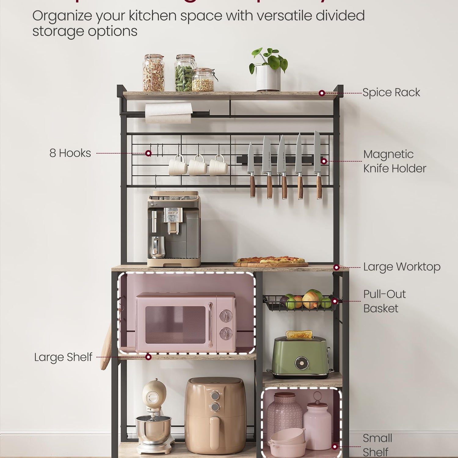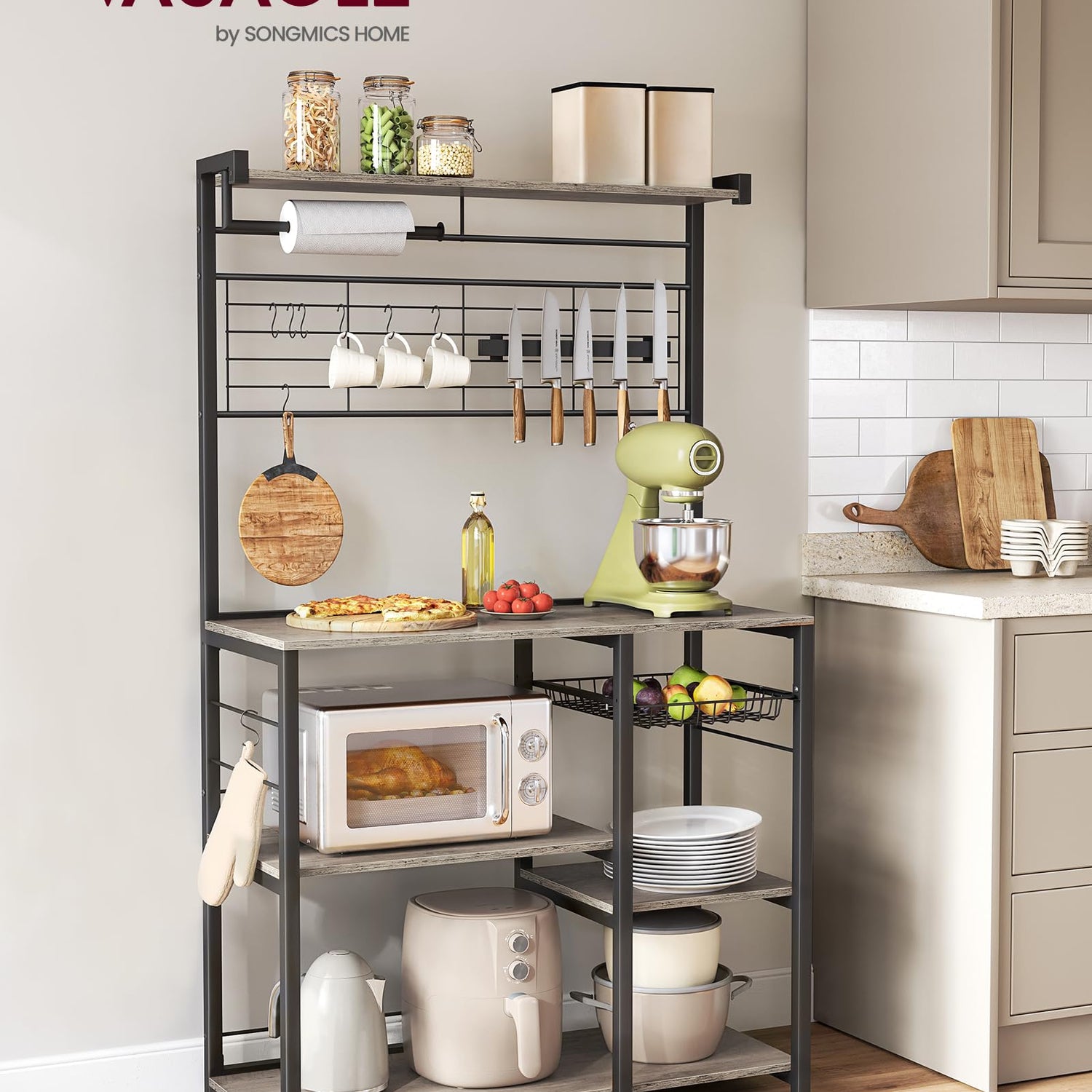VASAGLE Greige and Black Bakers Rack with Magnetic Knife Holder, Paper Towel Holder, Wire Basket, and 8 Hooks for Organised Kitchen Storage