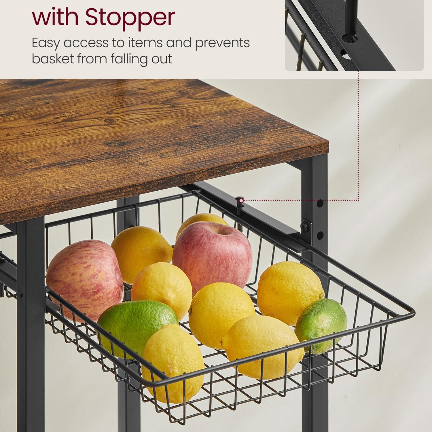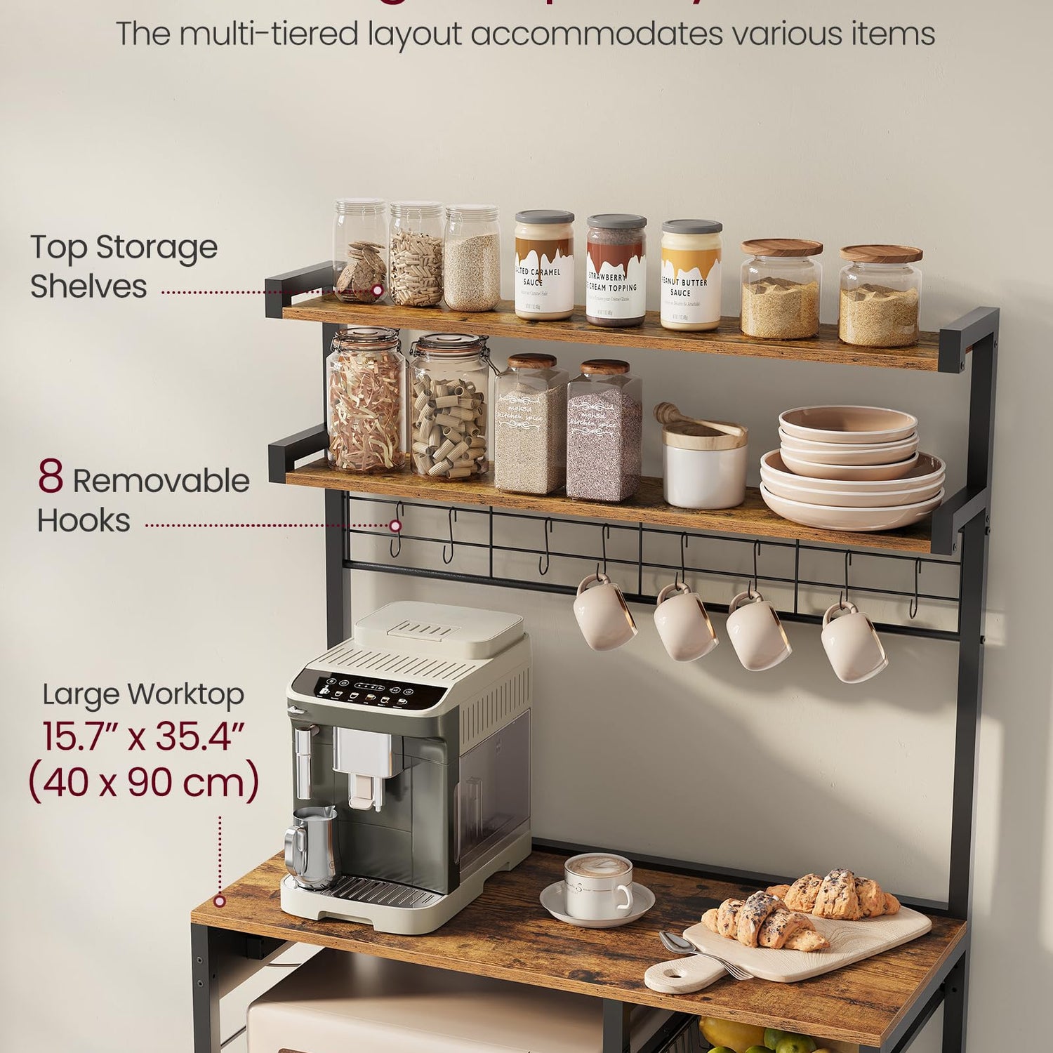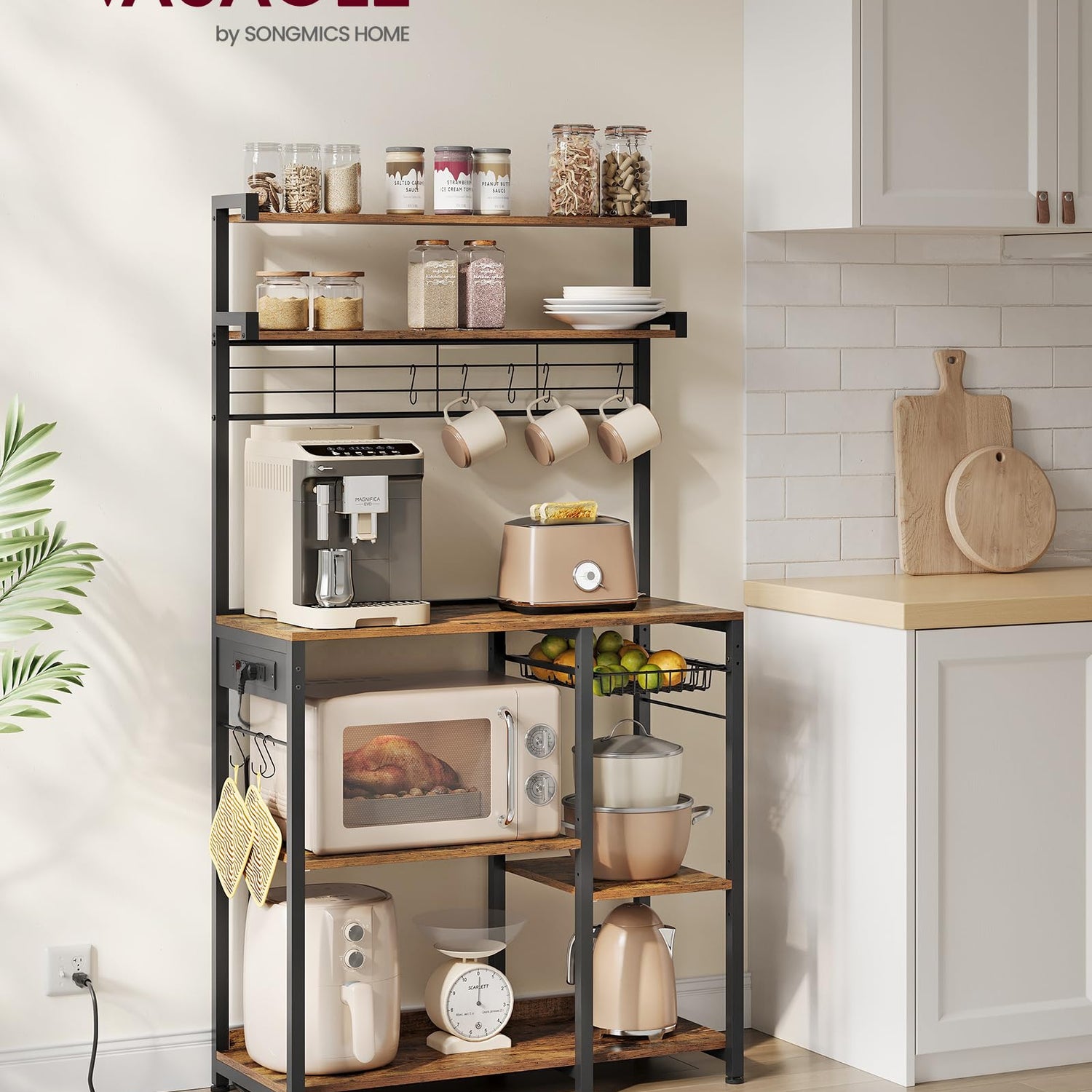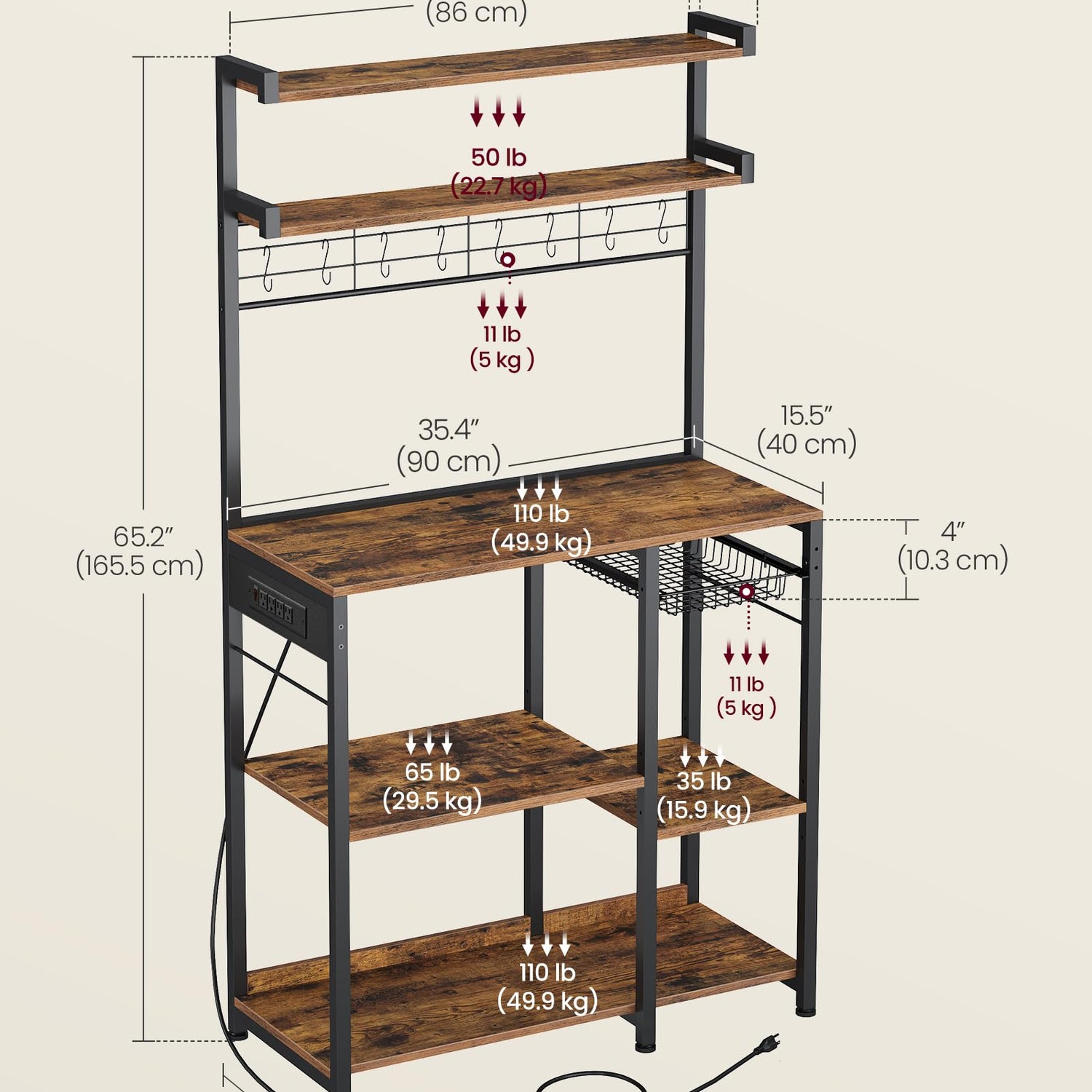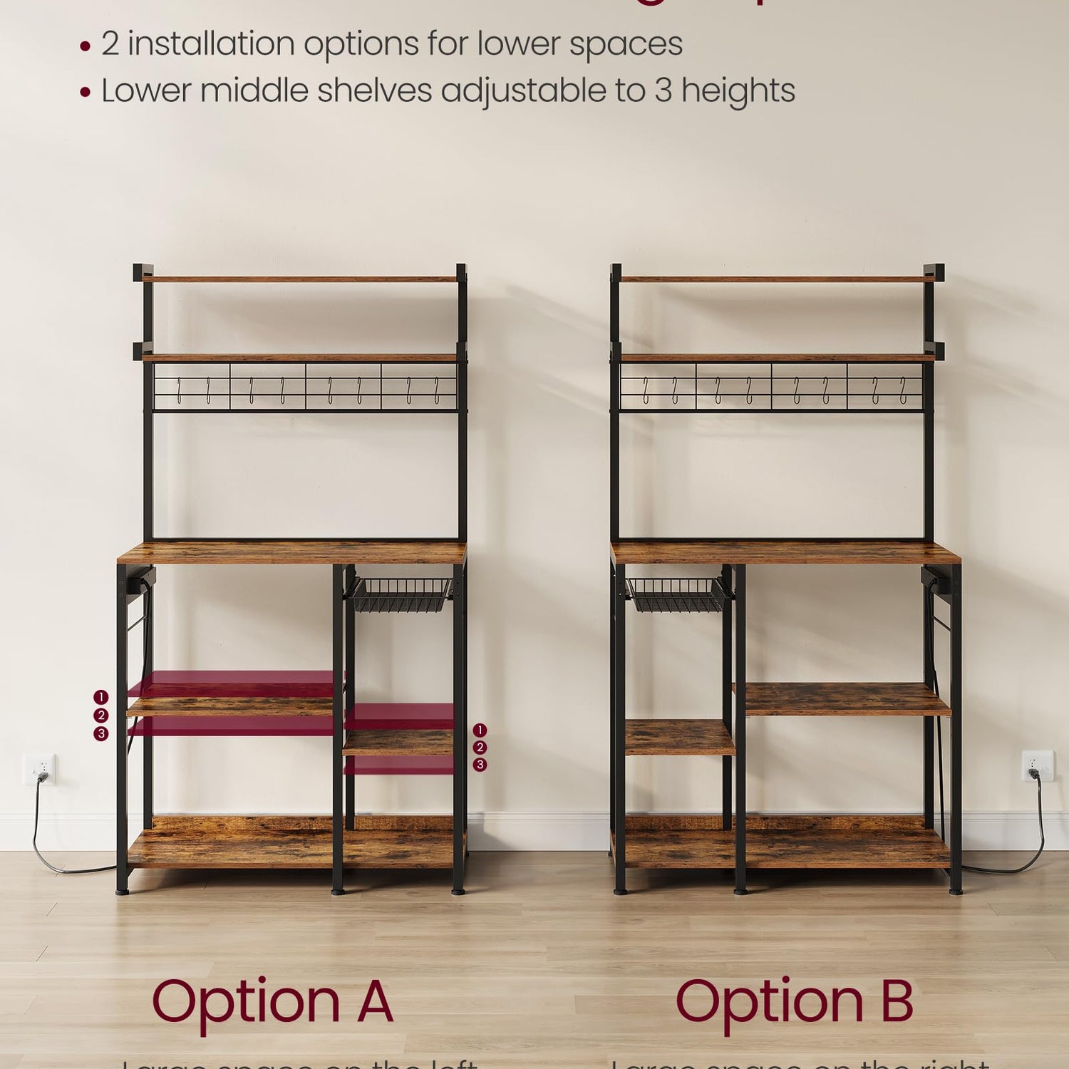 VASAGLE Bakers Rack with Power Outlet, 35.4 Inches Microwave Stand, Coffee Bar, 4 AC Outlets, with Adjustable Shelves, 8 S-Hooks, Basket, Spice Racks, Rustic Brown and Ink Black UKKS031K01
