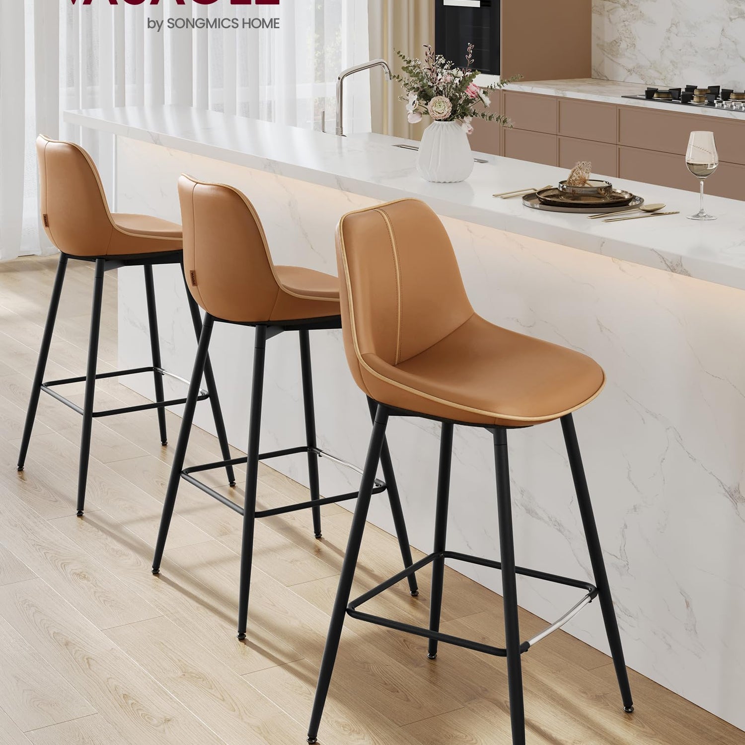 VASAGLE Bar Stools Set of 2, Bar Height Bar Stools with Back, Ergonomic Backrest, Synthetic Leather, Metal Legs, 28.7-Inch Tall Stools for Kitchen Island Home Bar, Caramel Brown ULBC888K01