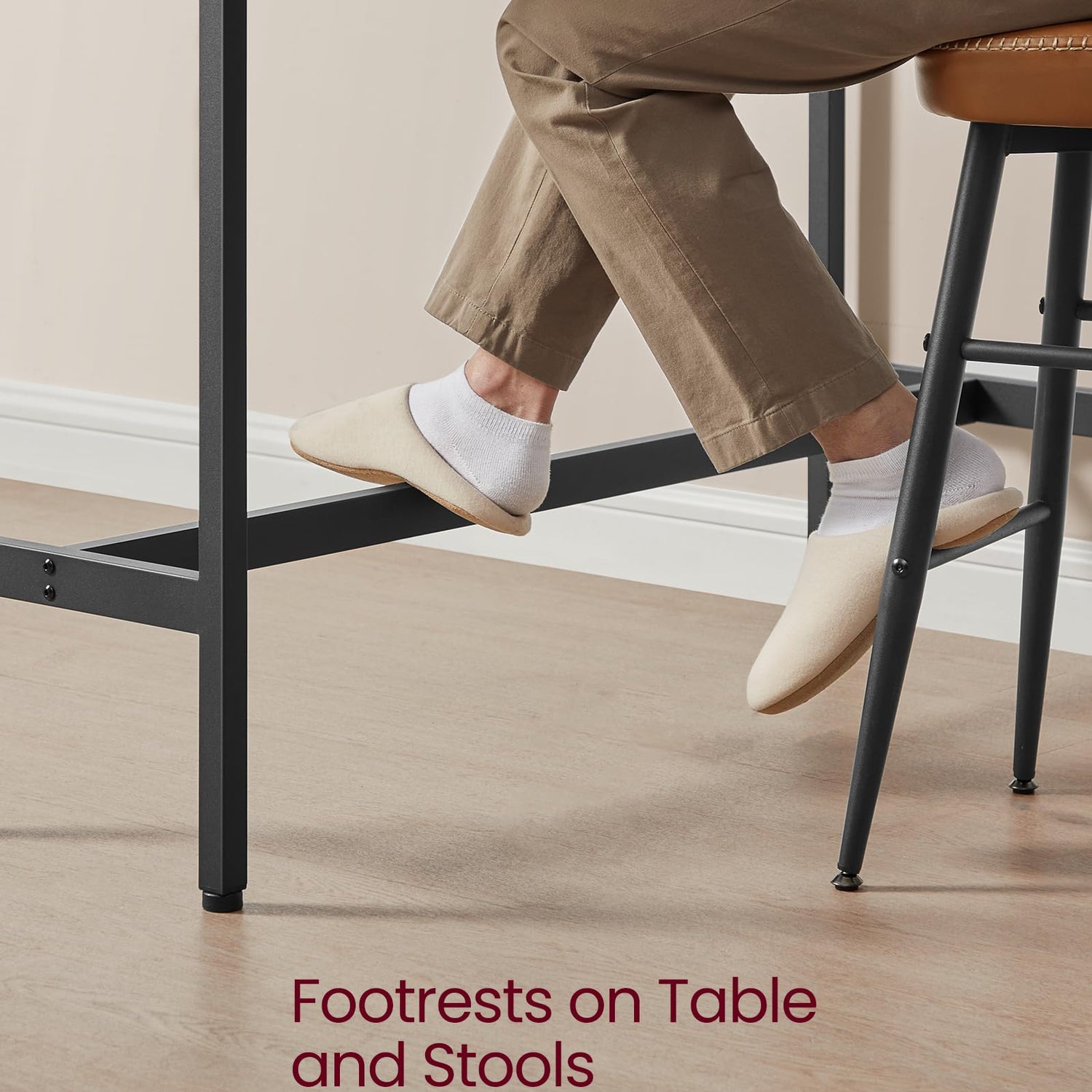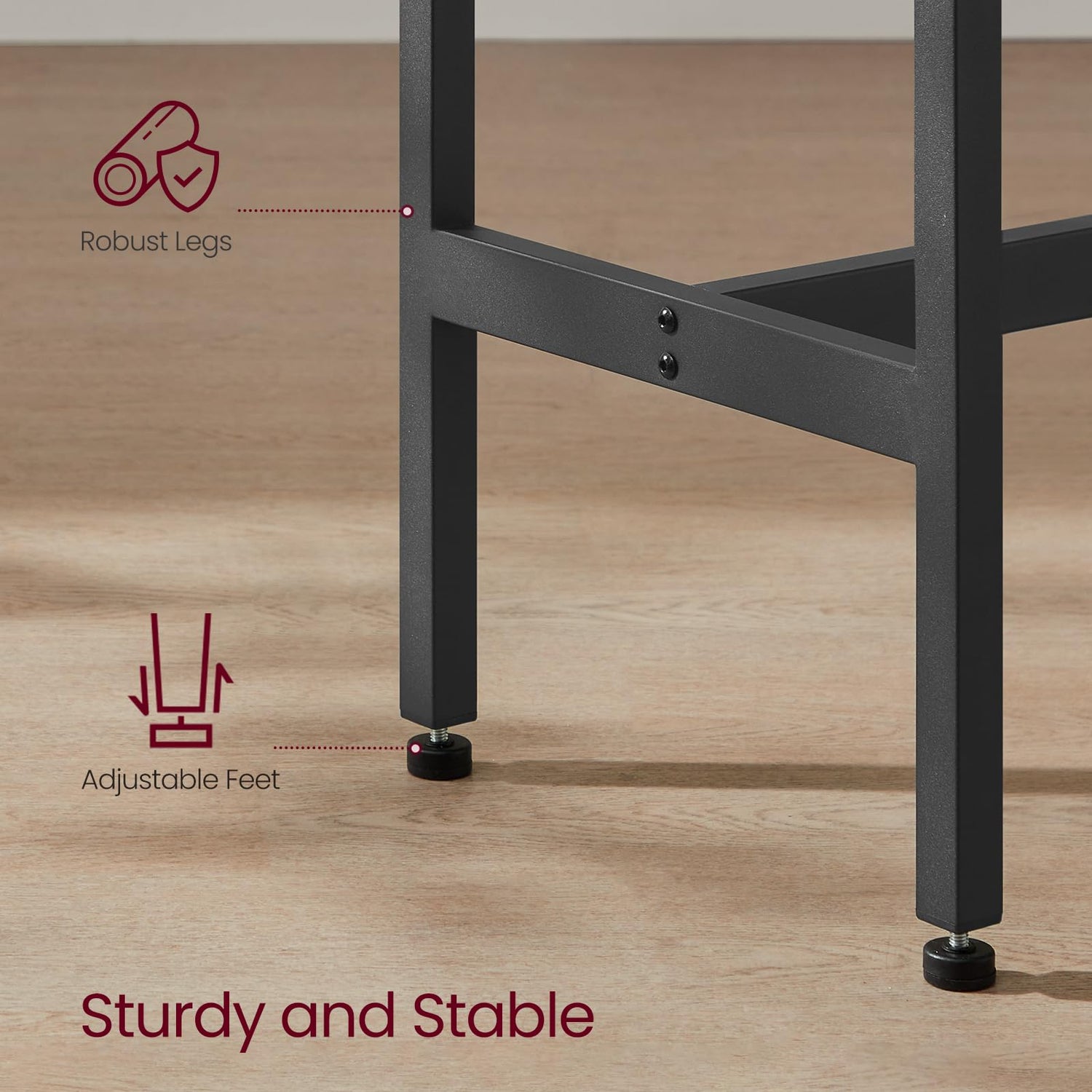 - [The Secret Behind Stability] This bar counter is supported by strong 1” x 1” thick metal legs and 0.8” x 1.6” thick stretcher bars; in addition, the adjustable feet make it stable on uneven floors, like your beautiful tiles