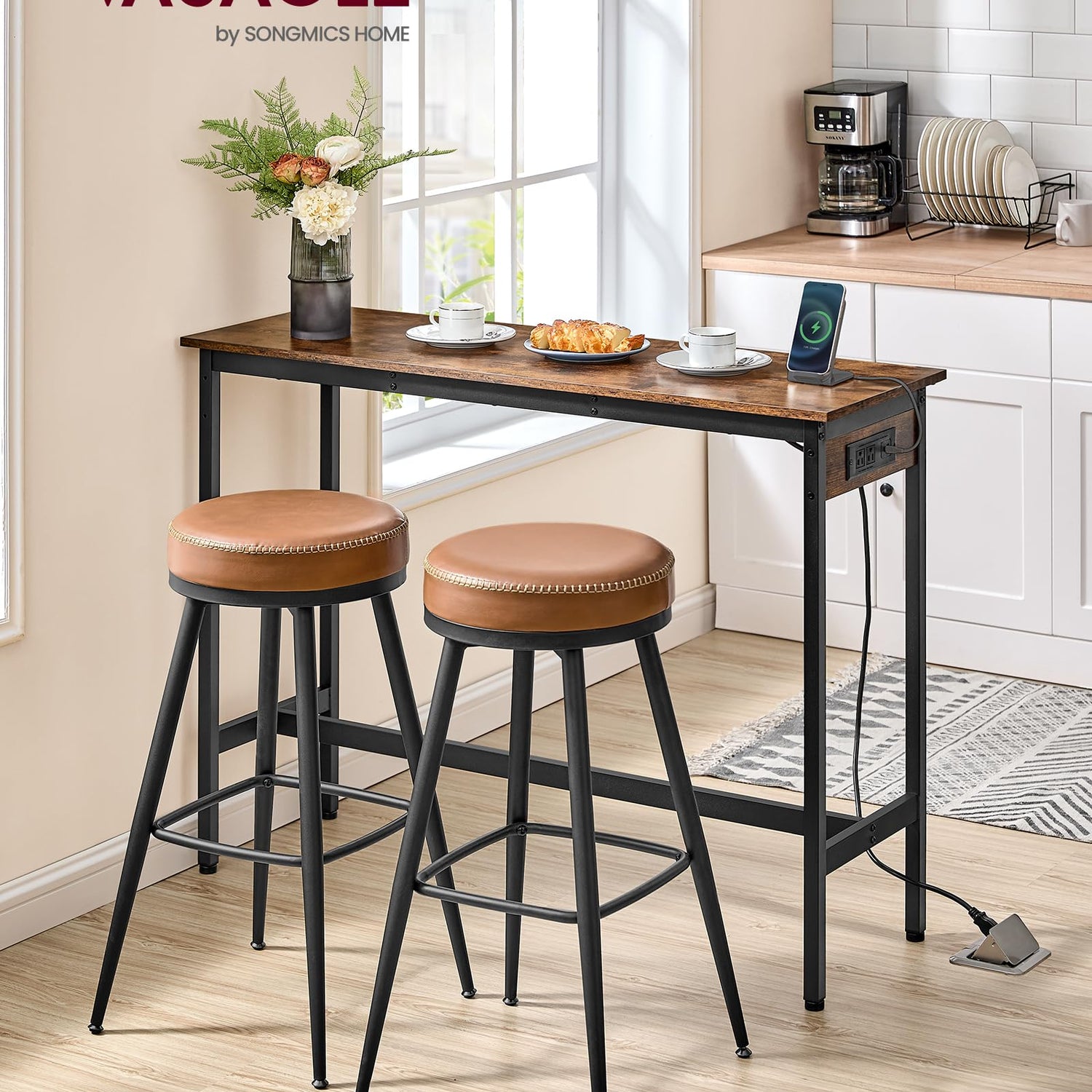 VASAGLE Bar Table, Narrow Long Kitchen Dining Table with Charging Station, Sturdy Metal Frame, Industrial, 15.7 x 47.2 x 35.4 Inches, Rustic Brown and Ink Black ULBT121K01