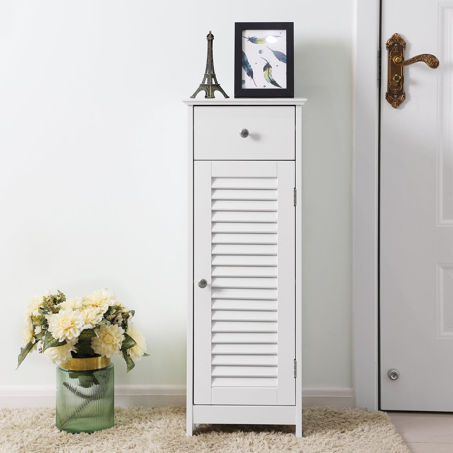- Utilize Your Space, to the Max: With a small footprint at 12.6"L x 11.8"W, the tall bathroom cabinet, featuring a drawer and a single shutter door cupboard with 2 compartments, offers more storage space while taking up little floor space