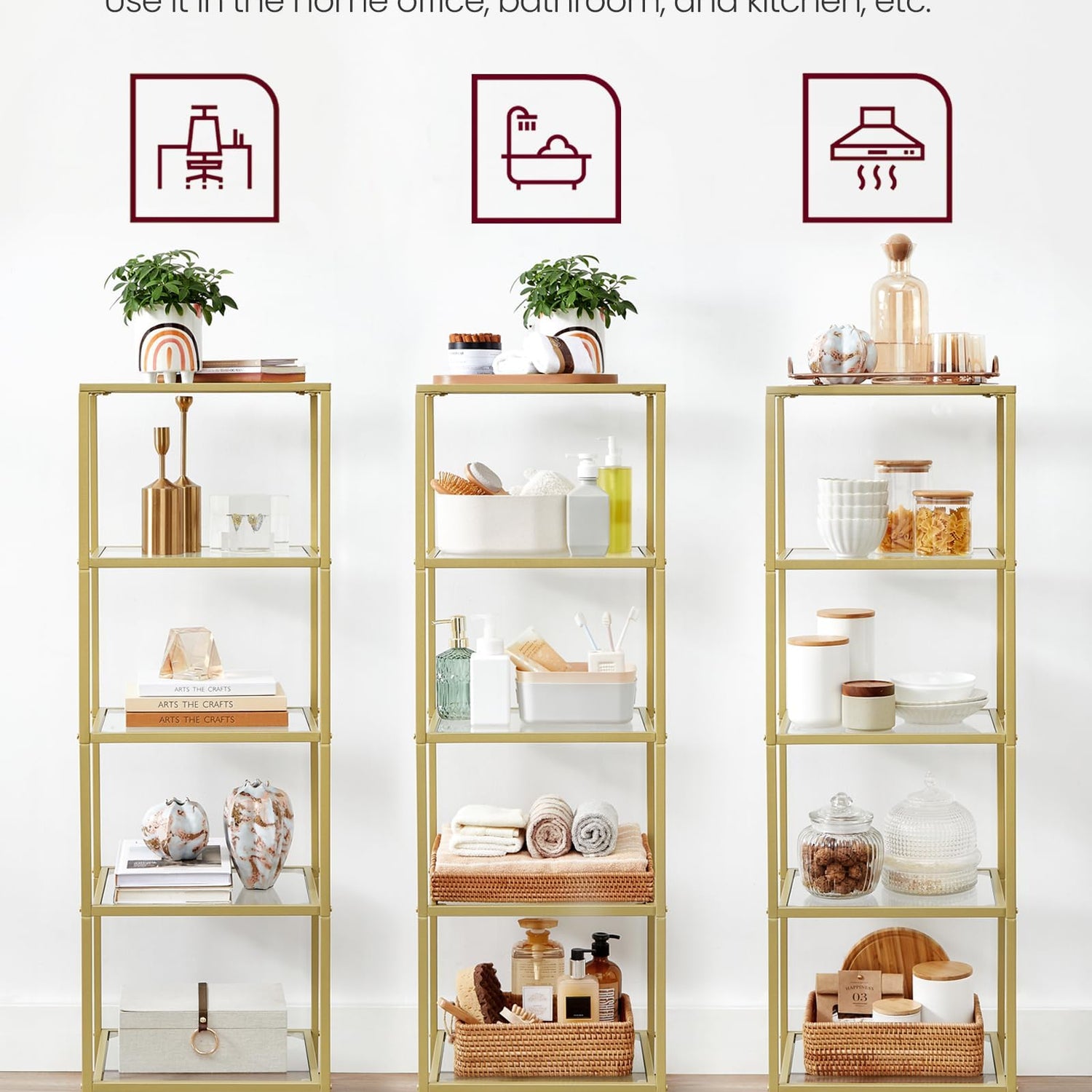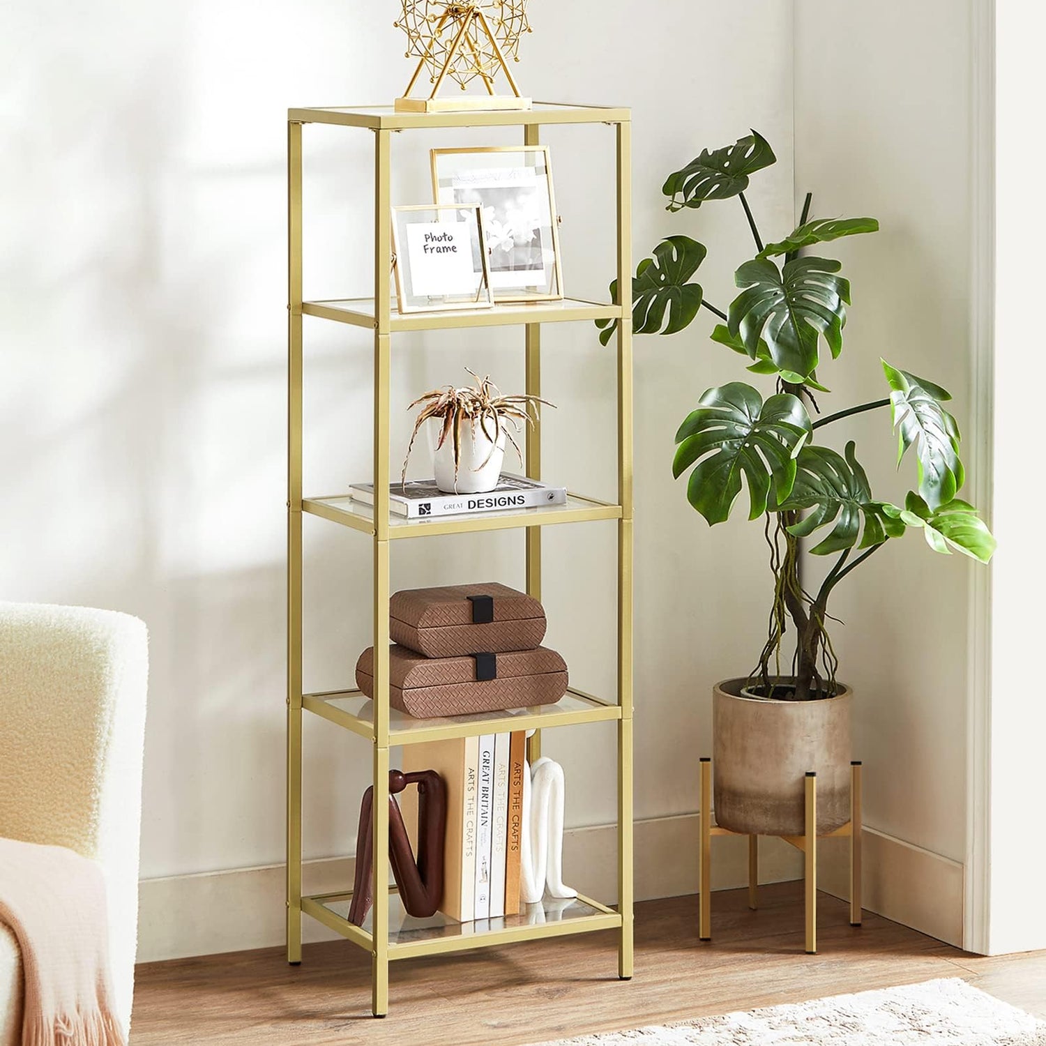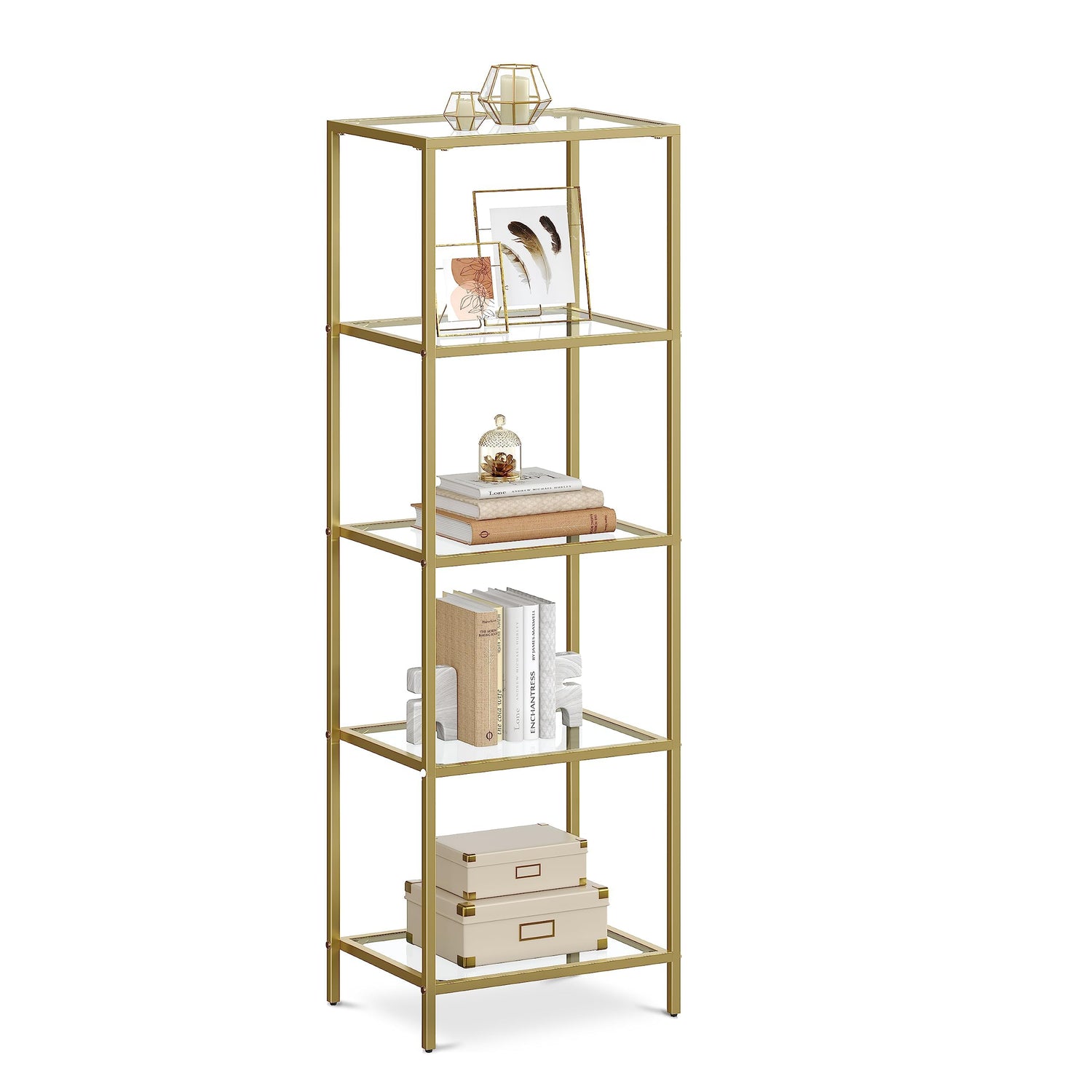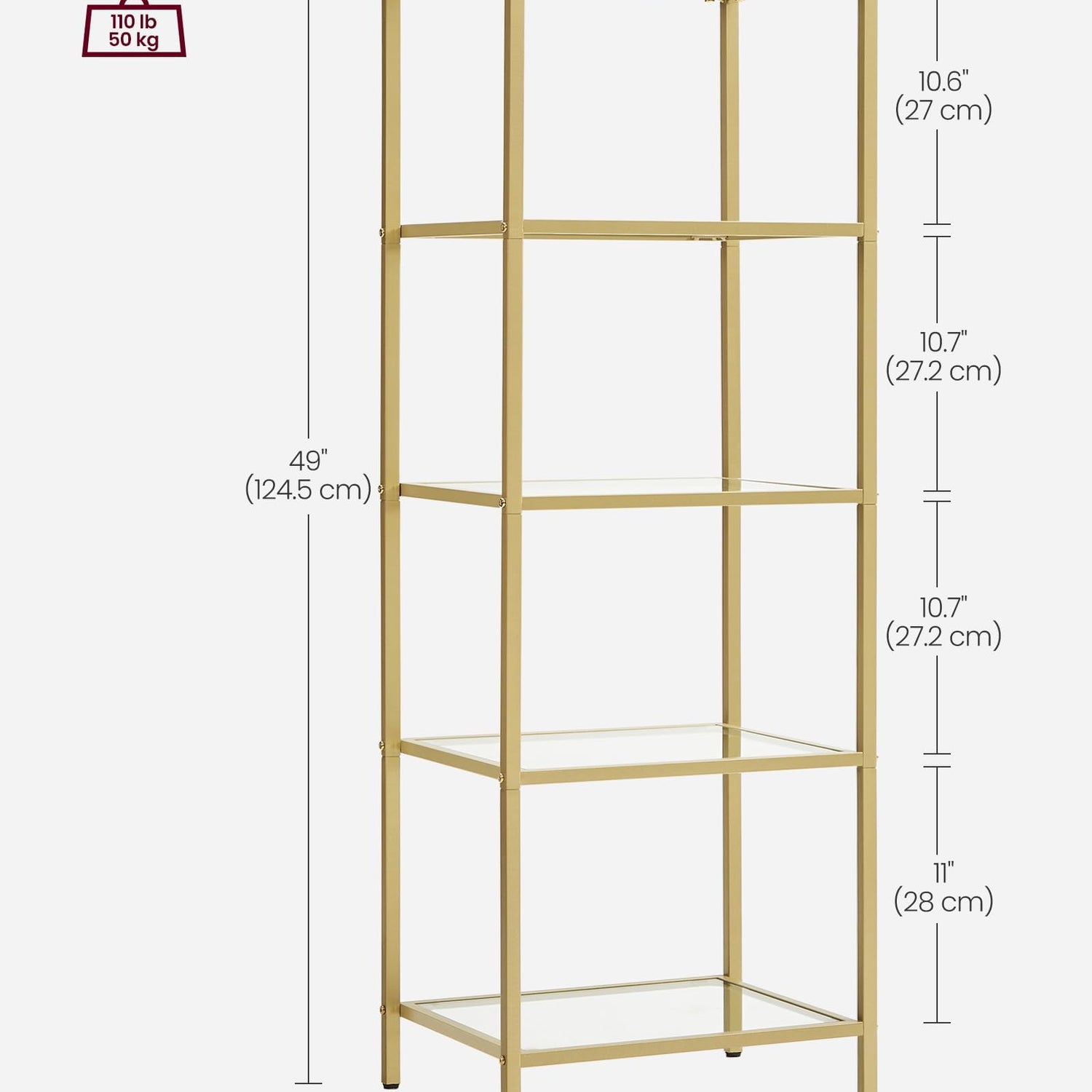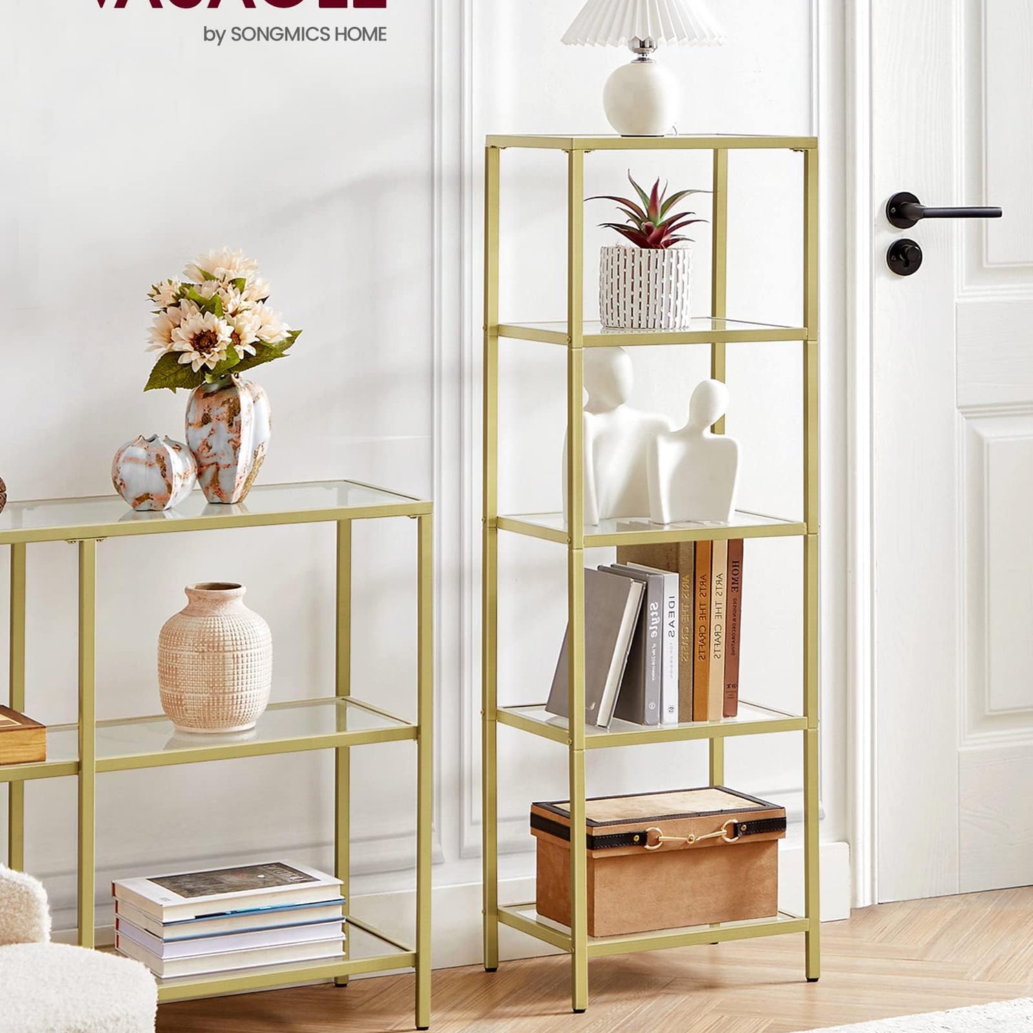 VASAGLE Bookcase, 5-Tier Bookshelf, Slim Shelving Unit for Bedroom, Bathroom, Home Office, Tempered Glass, Steel Frame, Metallic Gold ULGT029A01