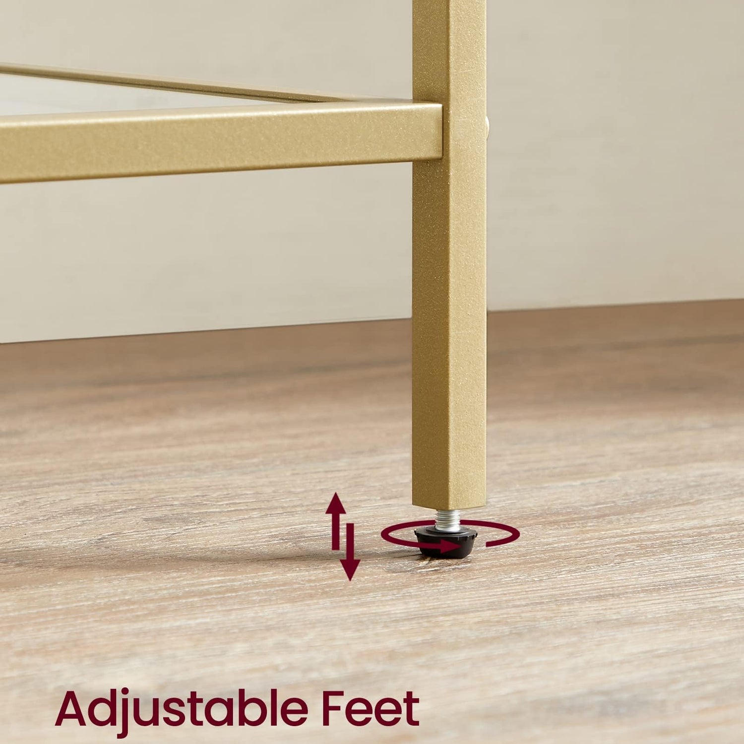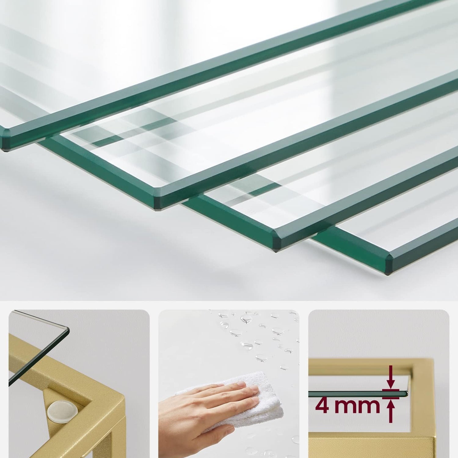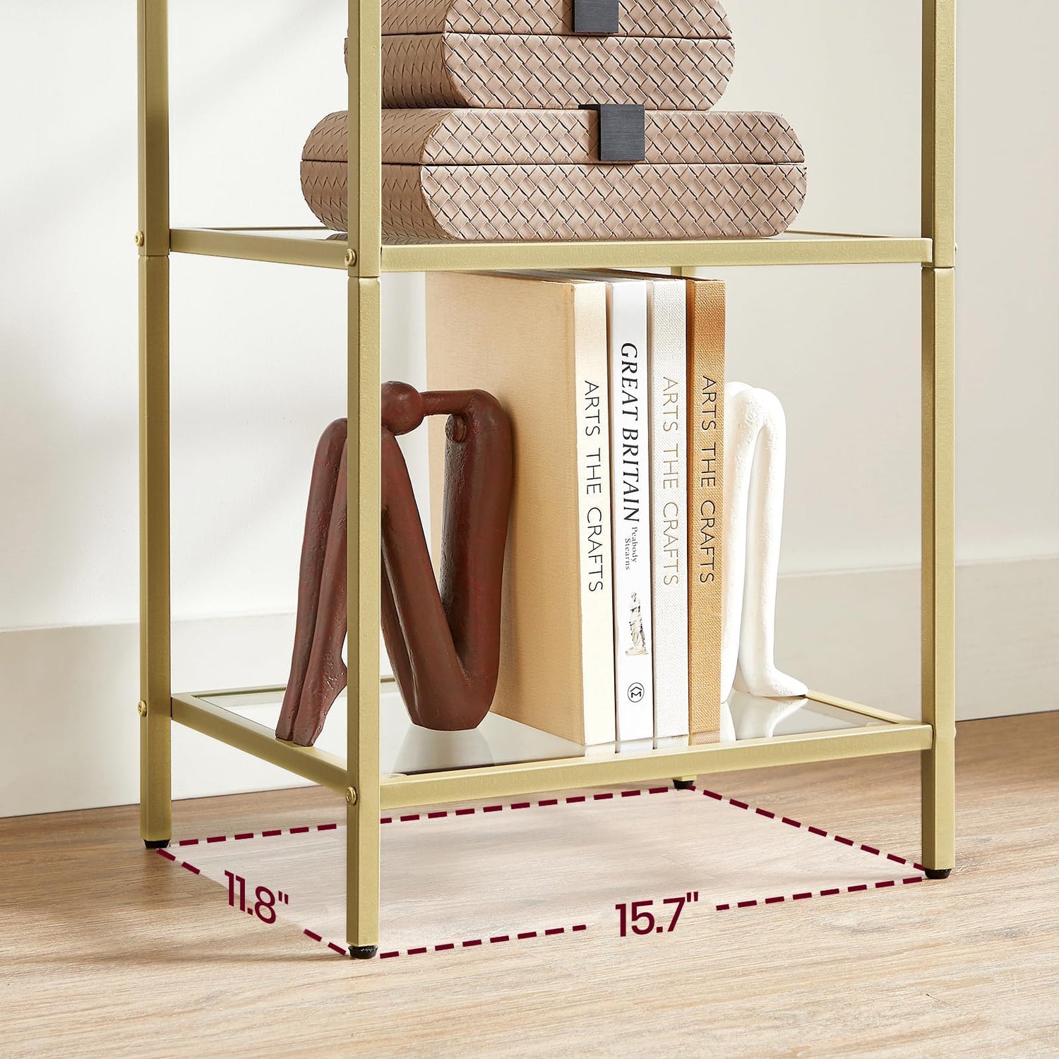 - [Display Your Faves] With transparent glass shelves and a gold-colored frame, this 5-tier shelf boasts stunning modern minimalism. This small shelf allows you to display your greenery, books, and collectibles while elevating the look of your space