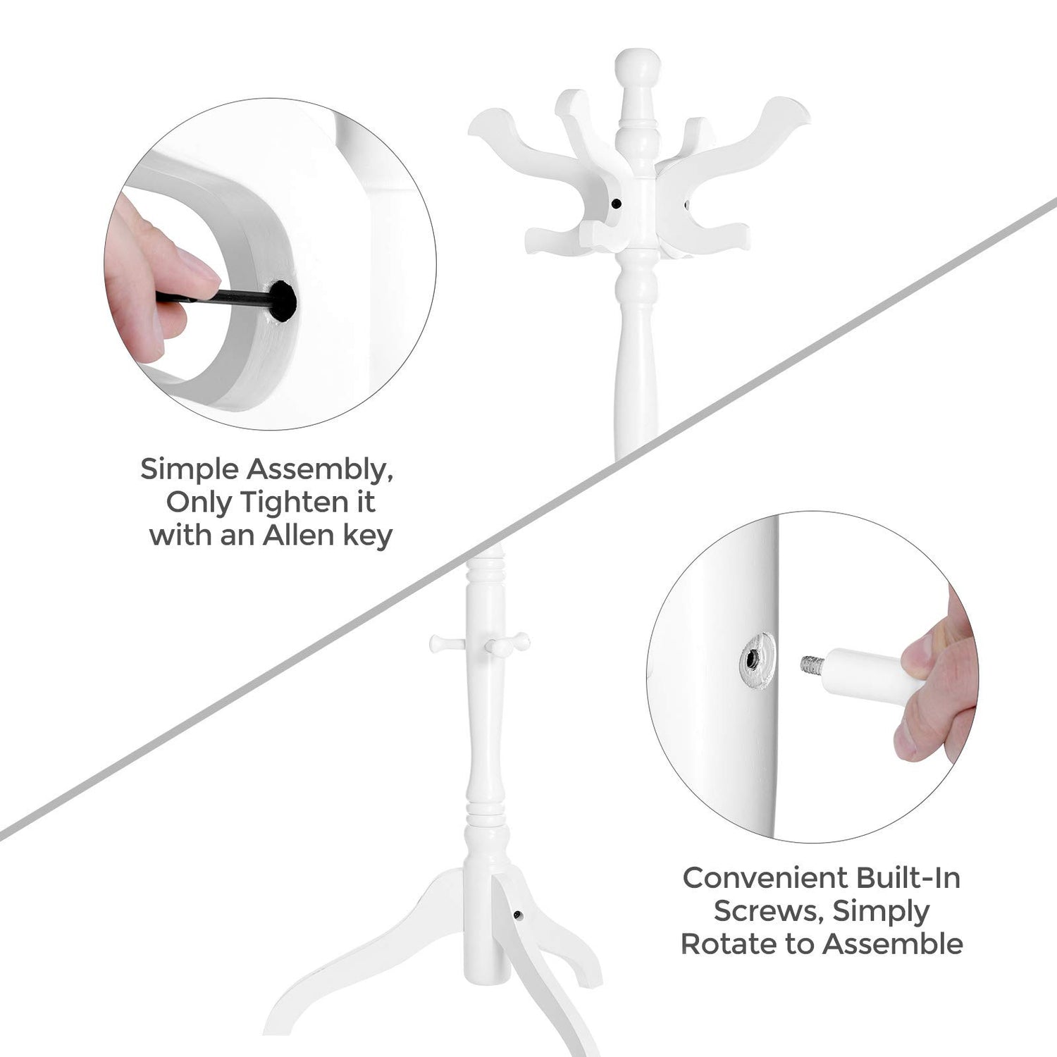 VASAGLE Coat Rack Free Standing with 11 Hooks, Wooden Hall Tree Coat Hat Tree Coat Holder with Solid Rubberwood Base for Coat, Hat, Clothes, Scarves, Handbags, Umbrella, White URCR005W02