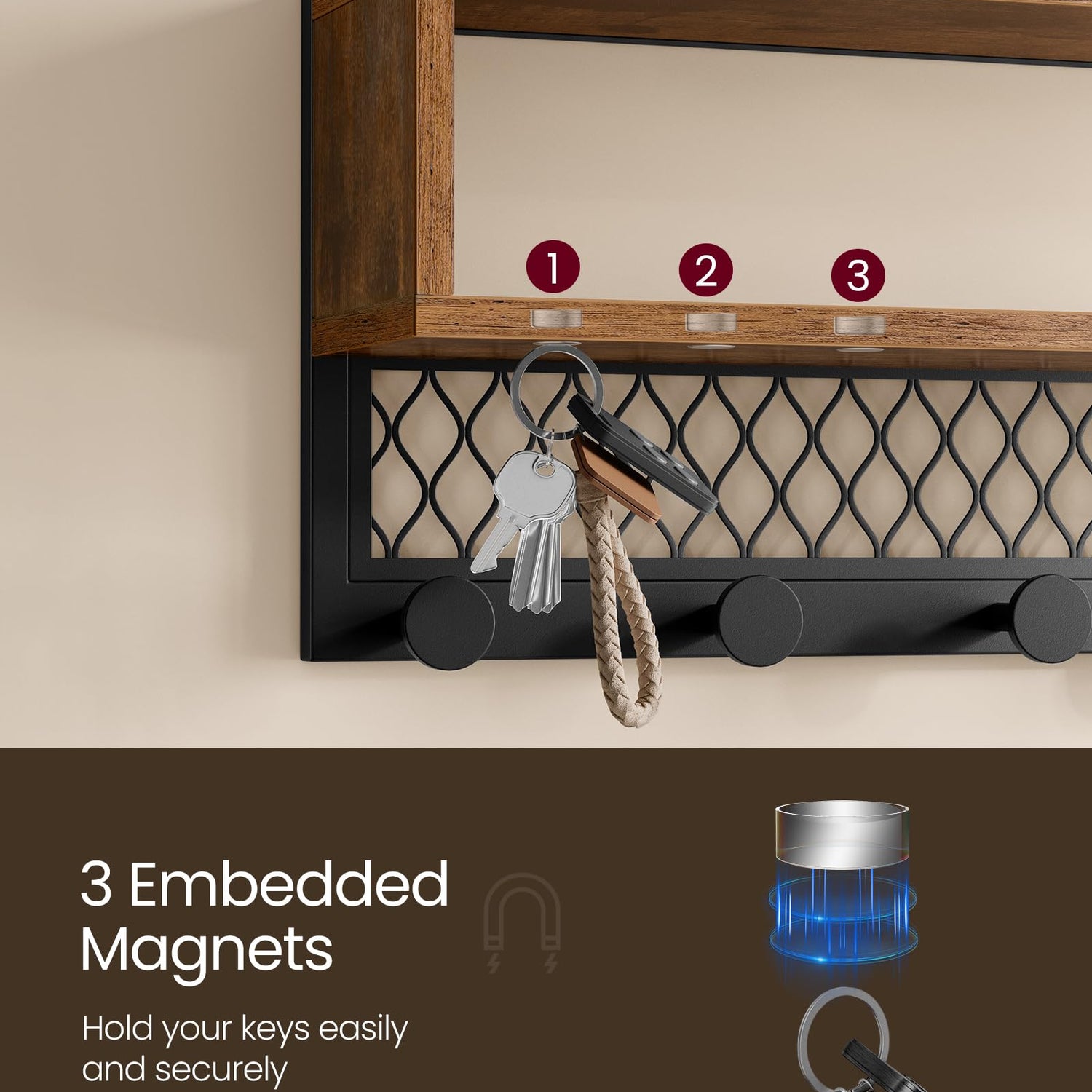 - [5-in-1 Hall Tree with Bench] With a double-layer shelf for decorations, 7 coat hooks for bags and clothes, 3 embedded magnets for keys, and a 2-tier shoe rack, this multifunctional piece has you covered!