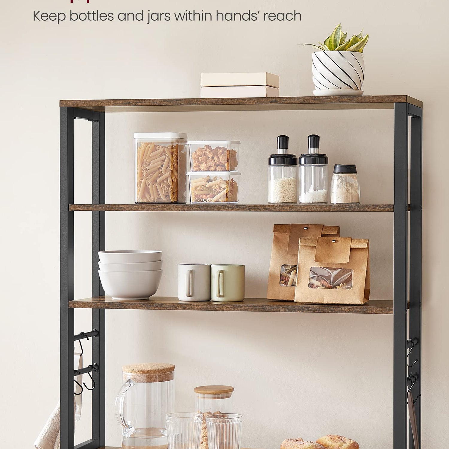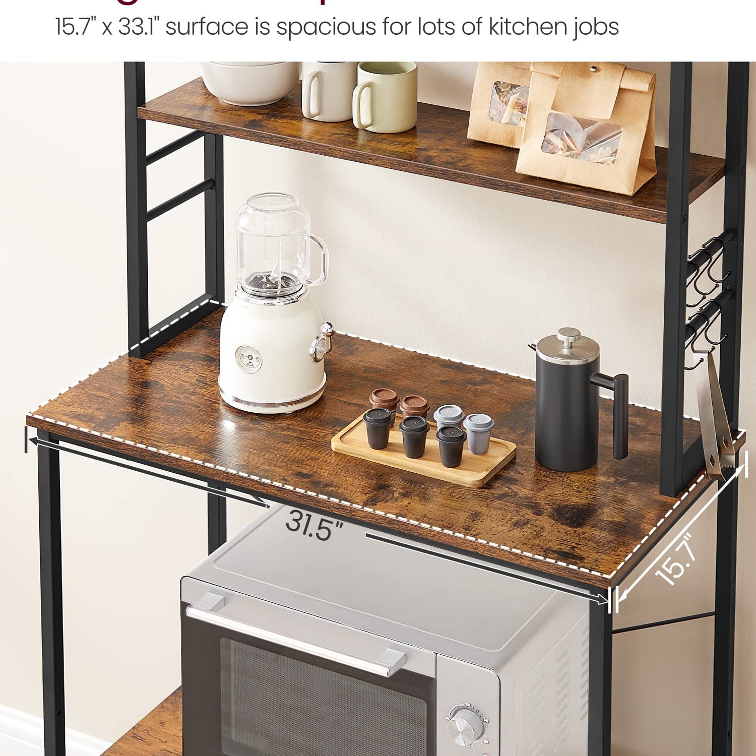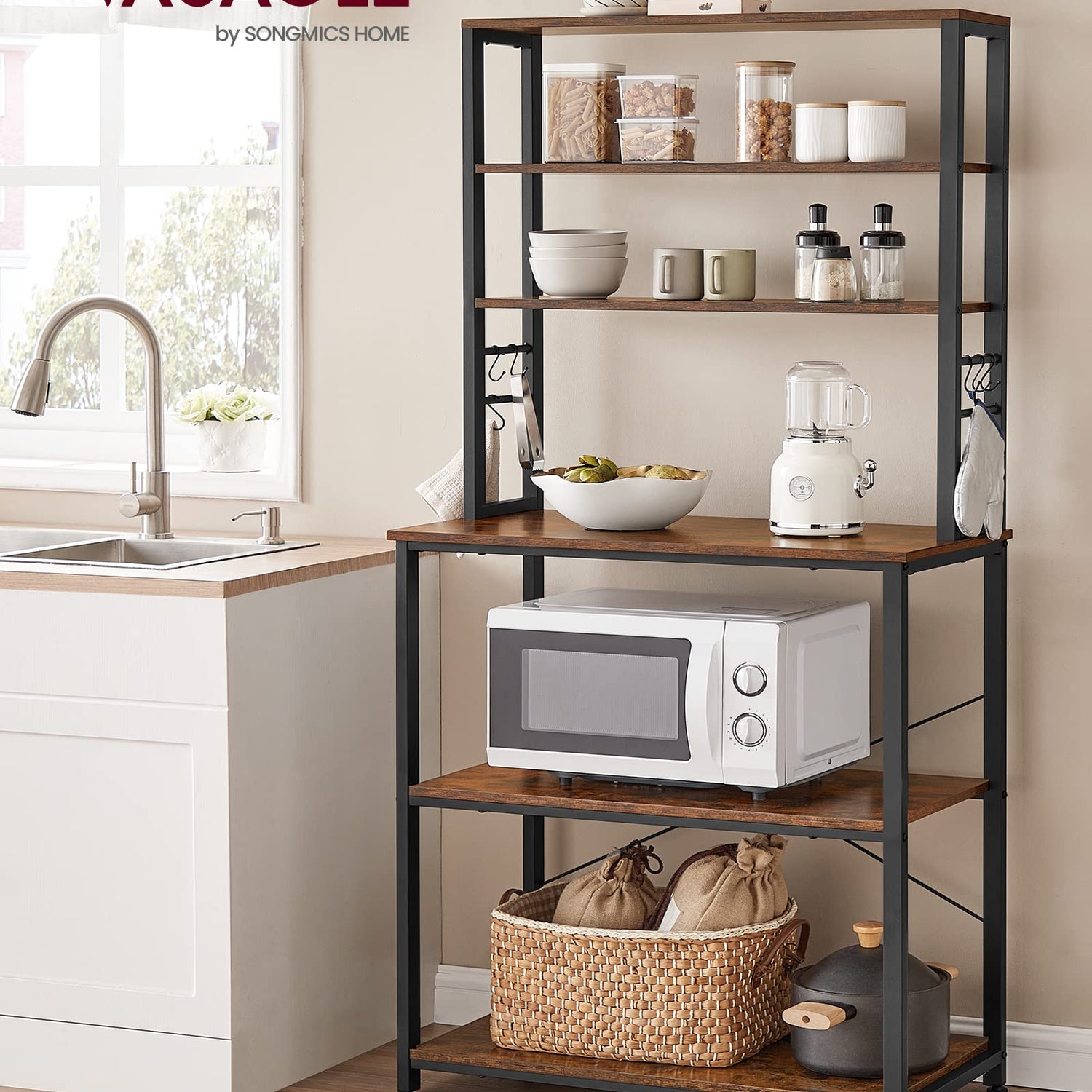 VASAGLE Coffee Bar, 31.5 Inches Baker's Rack for Kitchen with Storage, 6-Tier Kitchen Shelves with 6 Hooks, Microwave Stand, Industrial, Rustic Brown and Black UKKS019B01