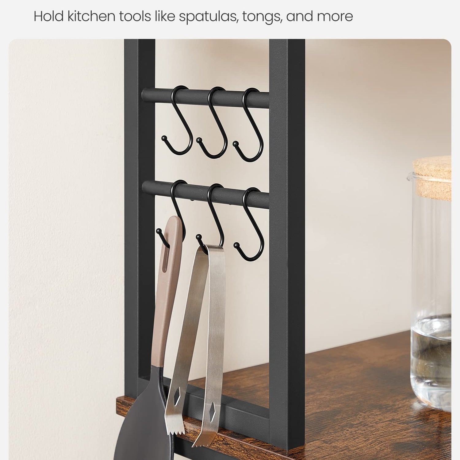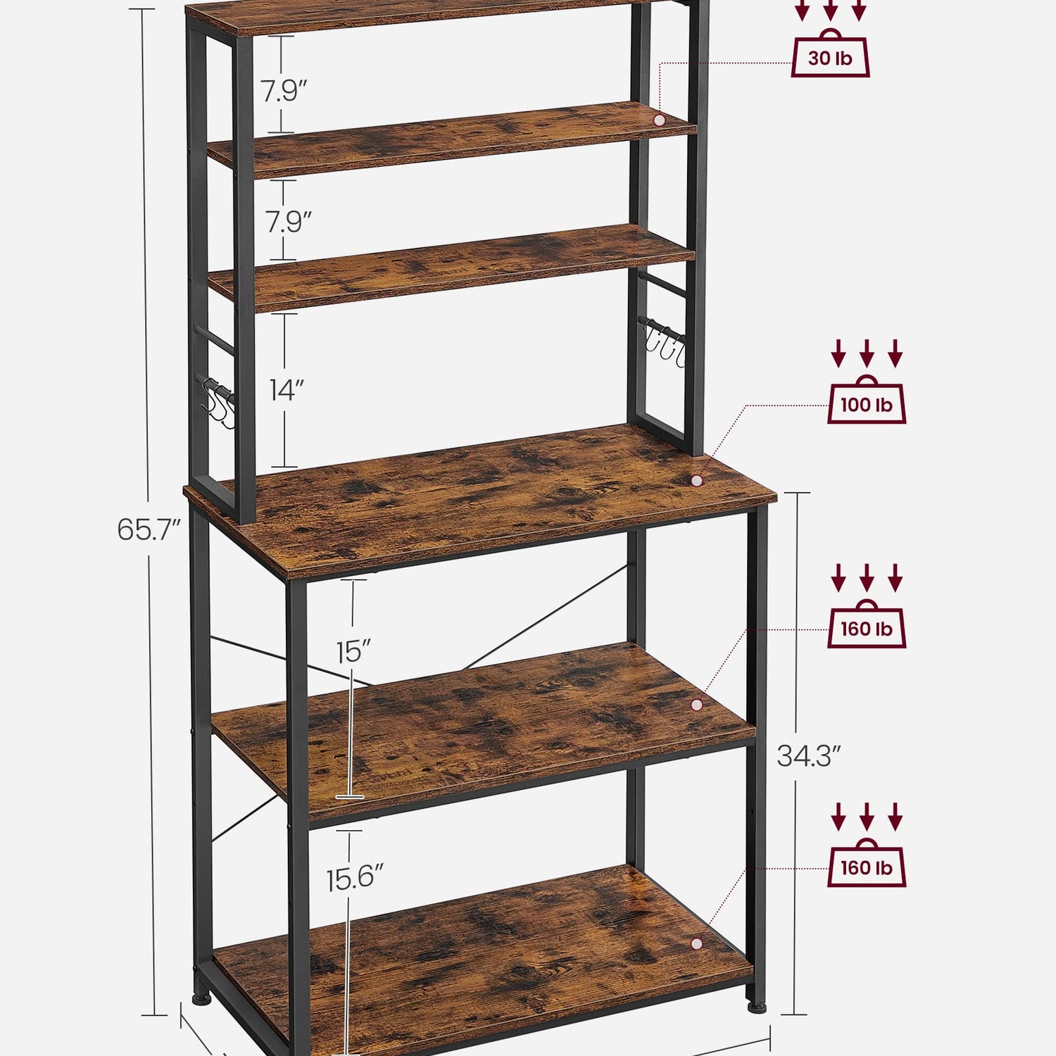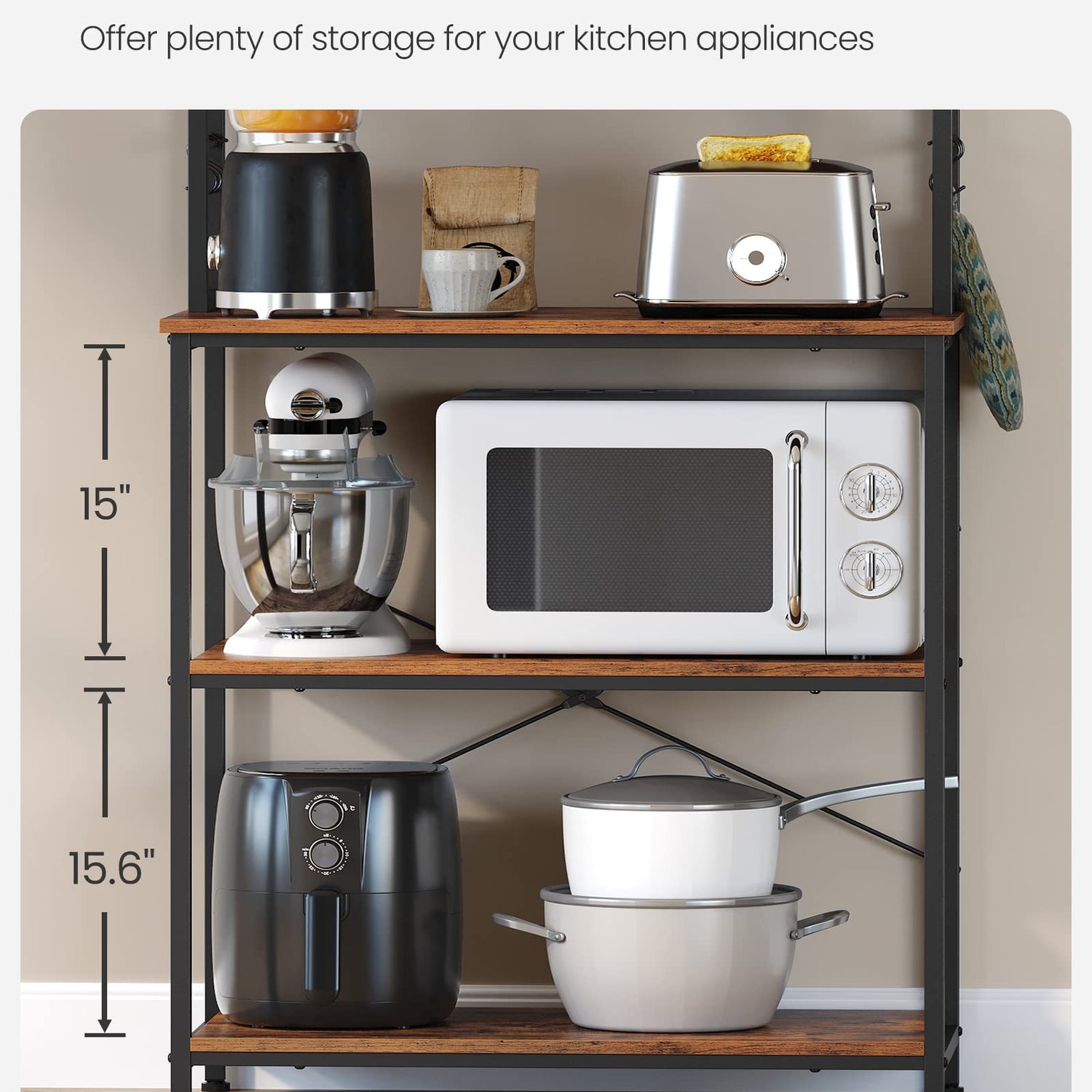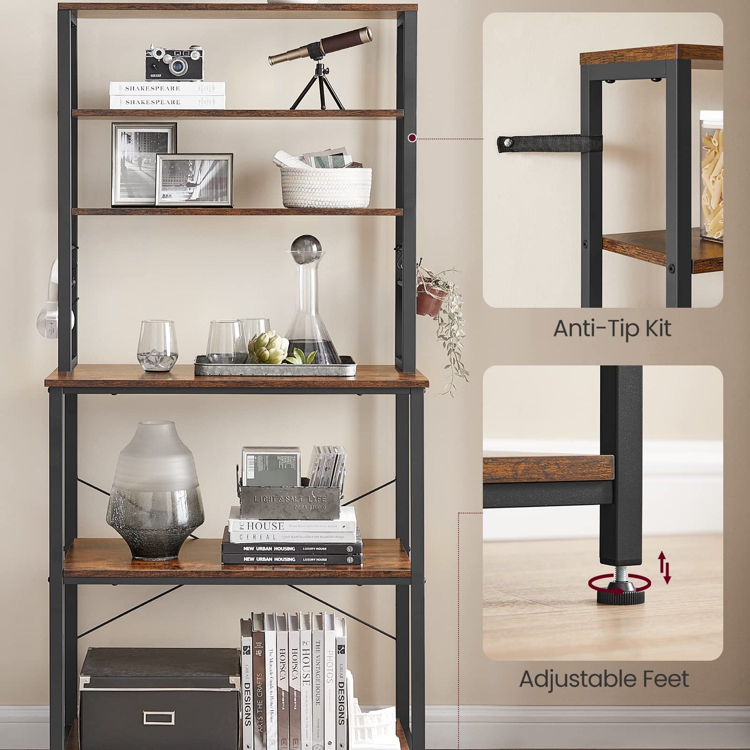 VASAGLE Coffee Bar, 31.5 Inches Baker's Rack for Kitchen with Storage, 6-Tier Kitchen Shelves with 6 Hooks, Microwave Stand, Industrial, Rustic Brown and Black UKKS019B01