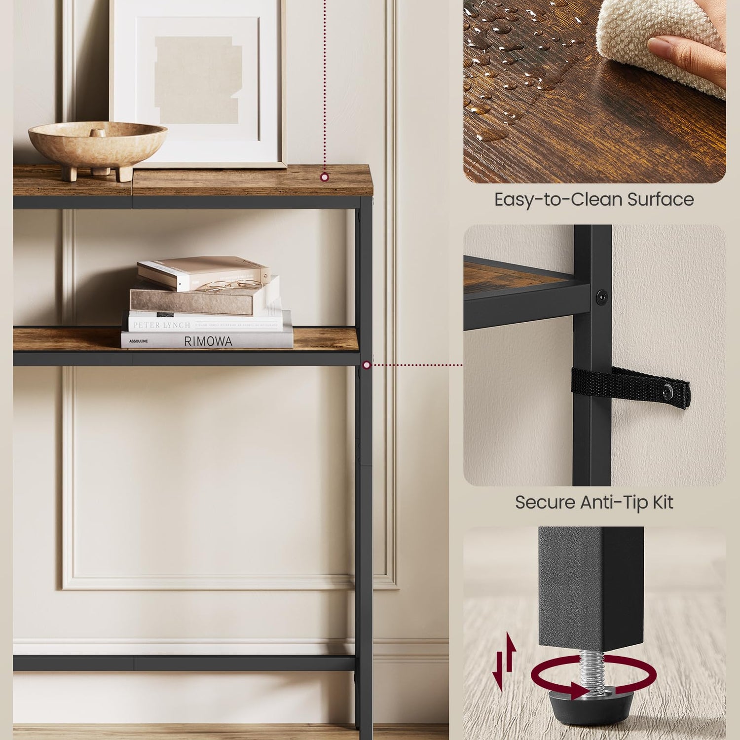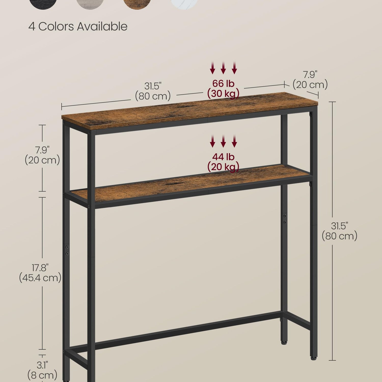 - 【STURDY AND STABLE】Crafted from robust particleboard and a steel frame, this entry table can hold up to 66 lb on the top shelf and 44 lb on the lower shelf. Adjustable feet ensure stability on uneven floors, preventing unwanted wobbling
