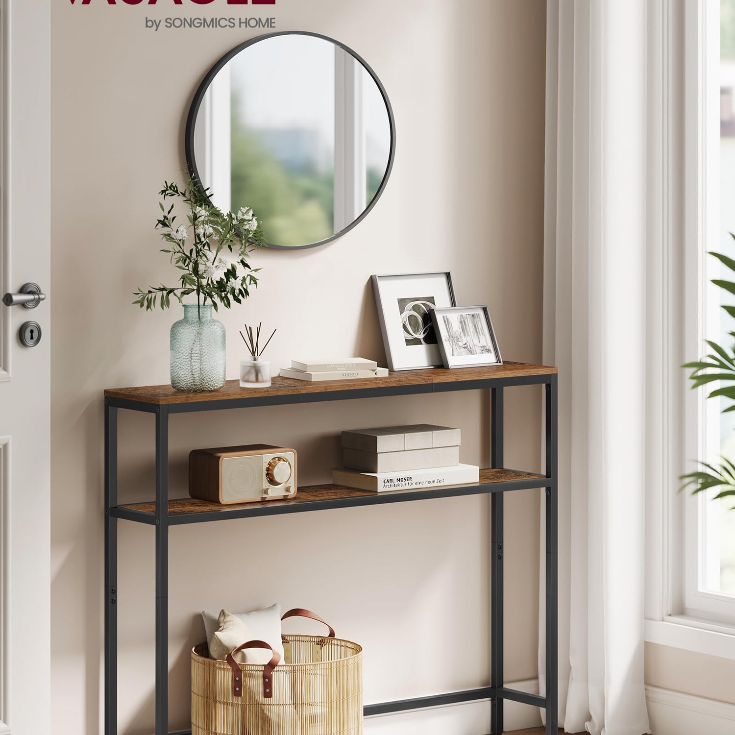- 【MODERN STYLE】Featuring a black frame paired with particleboard panels in a rustic brown finish, this narrow entryway table blends seamlessly with modern decor and enhances the visual appeal of your home