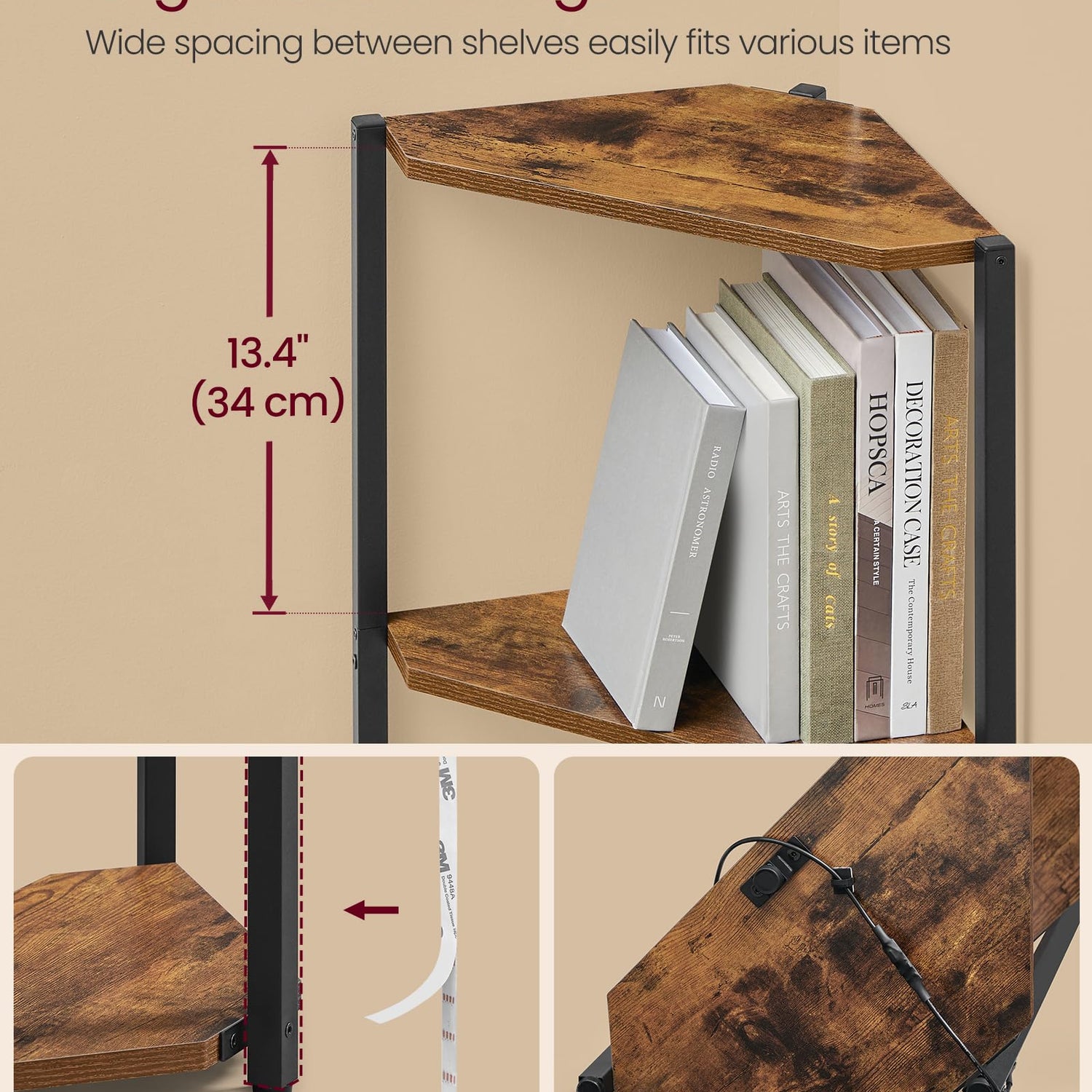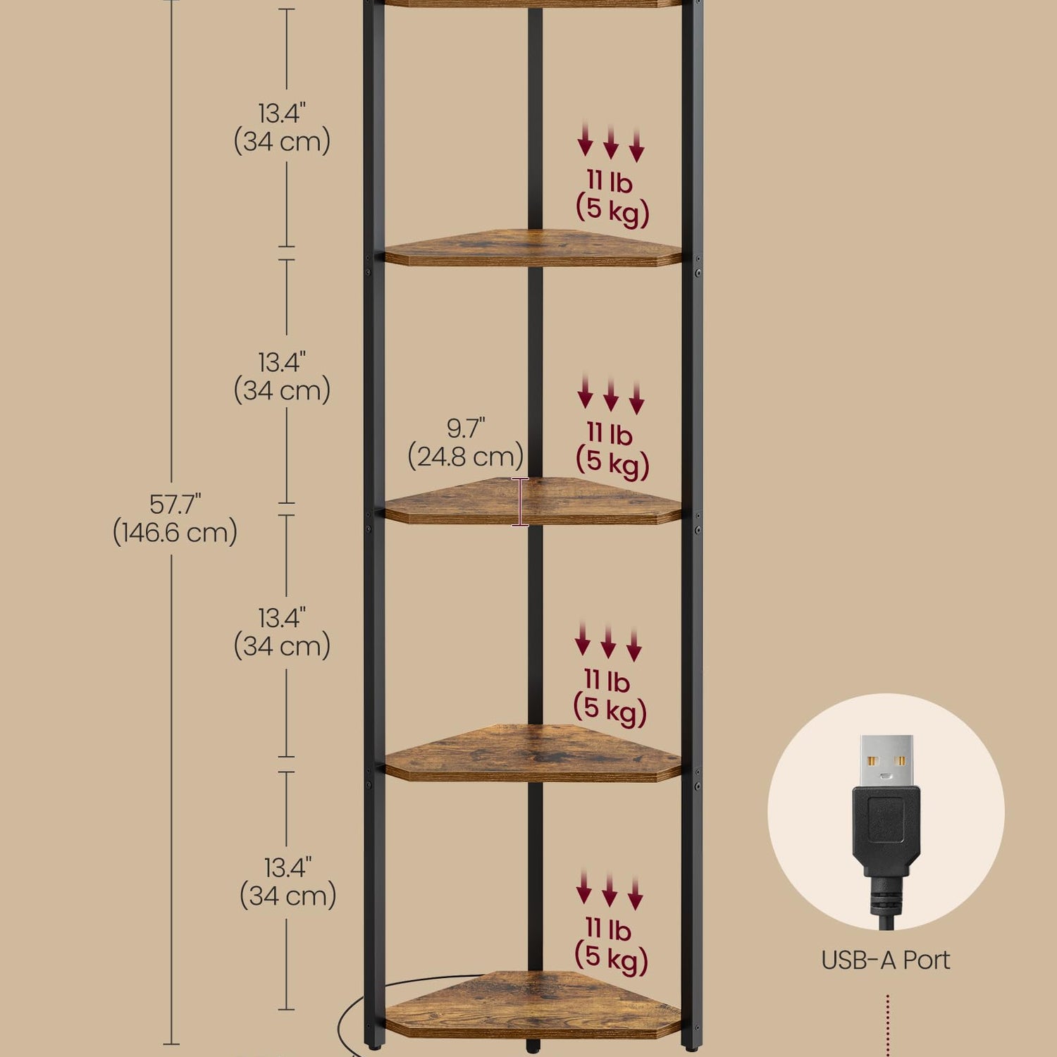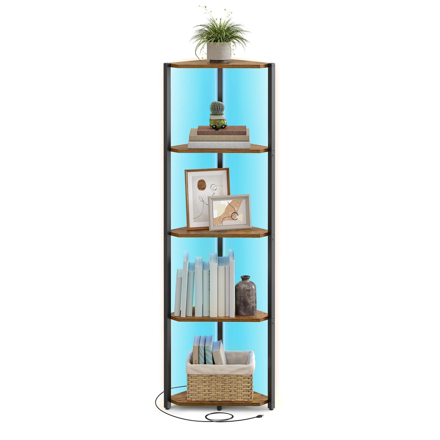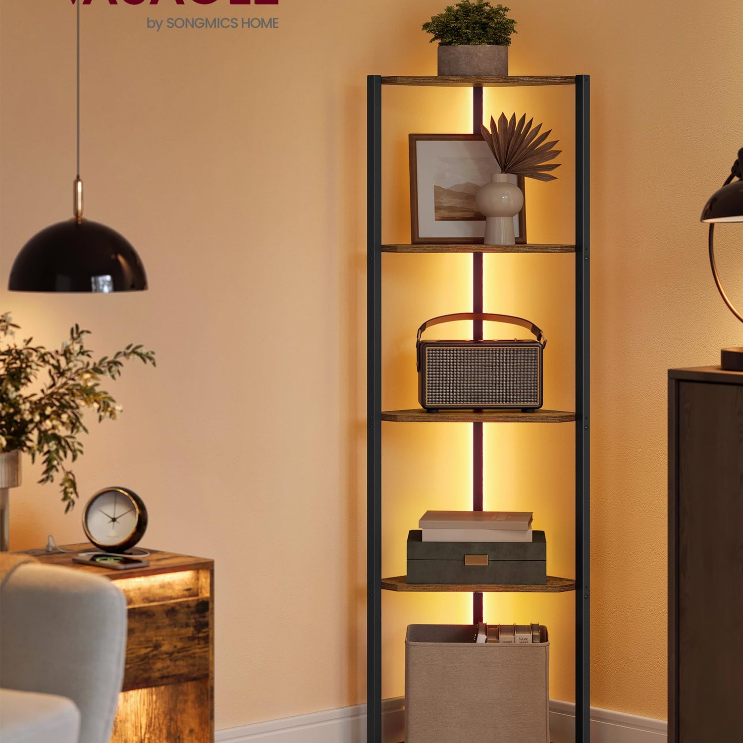VASAGLE Corner Shelf Stand with LED Lights, 5-Tier Corner Bookshelf, Storage Shelf with Steel Frame, 9.8 x 18.9 x 57.7 Inches, for Living Room, Bedroom, Study, Rustic Brown ULBC590K01