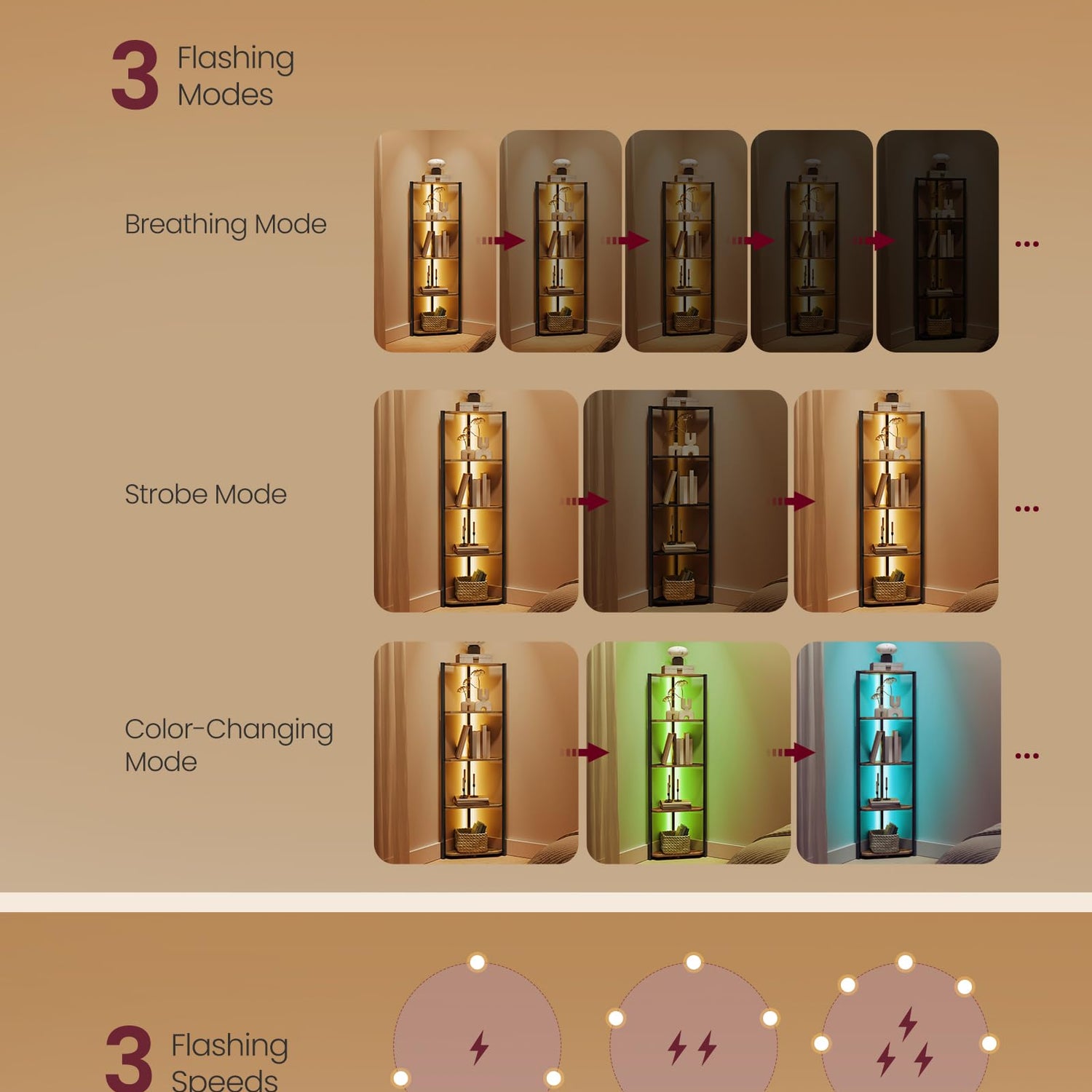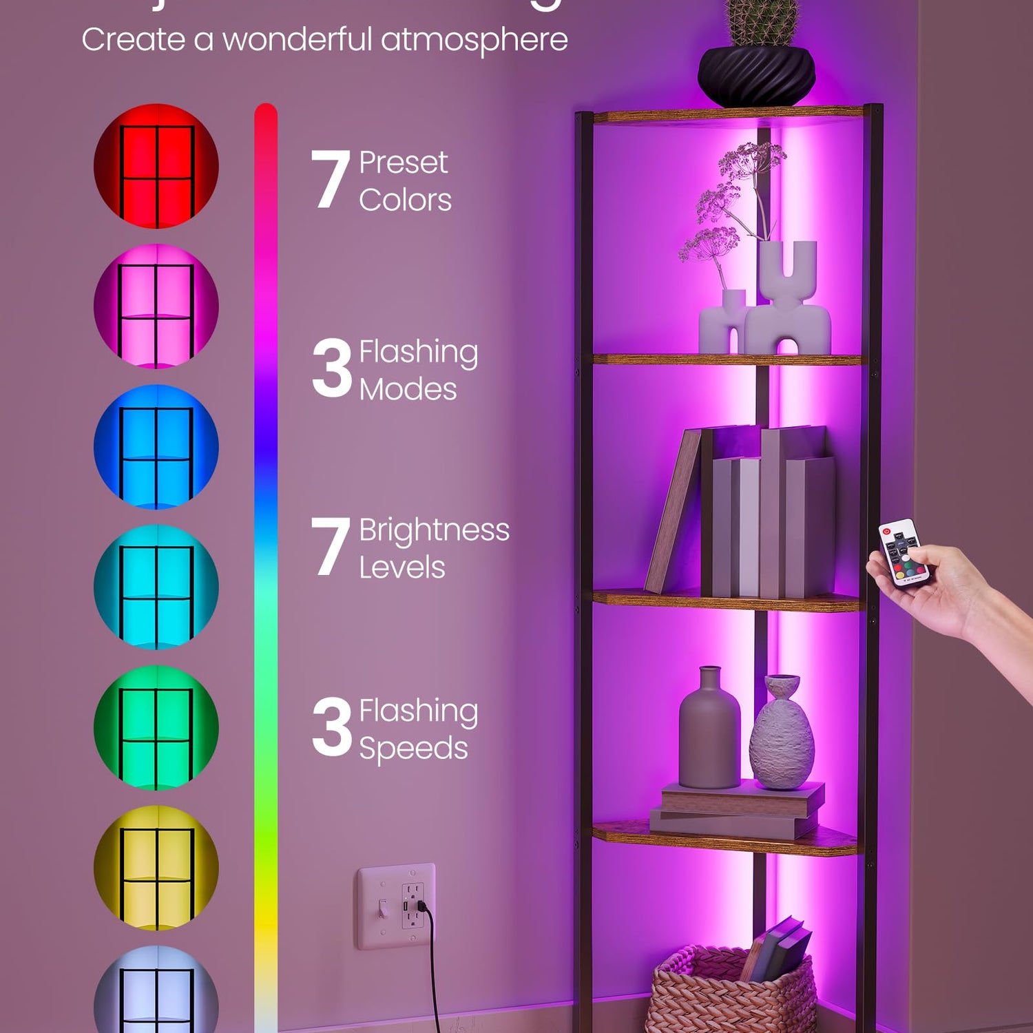 - 【ADJUSTABLE LED LIGHTING】This corner shelf stand features LED lights with 7 colors, 7 brightness levels, 3 flashing modes, and 3 flashing speeds, and an included remote control to create a unique atmosphere