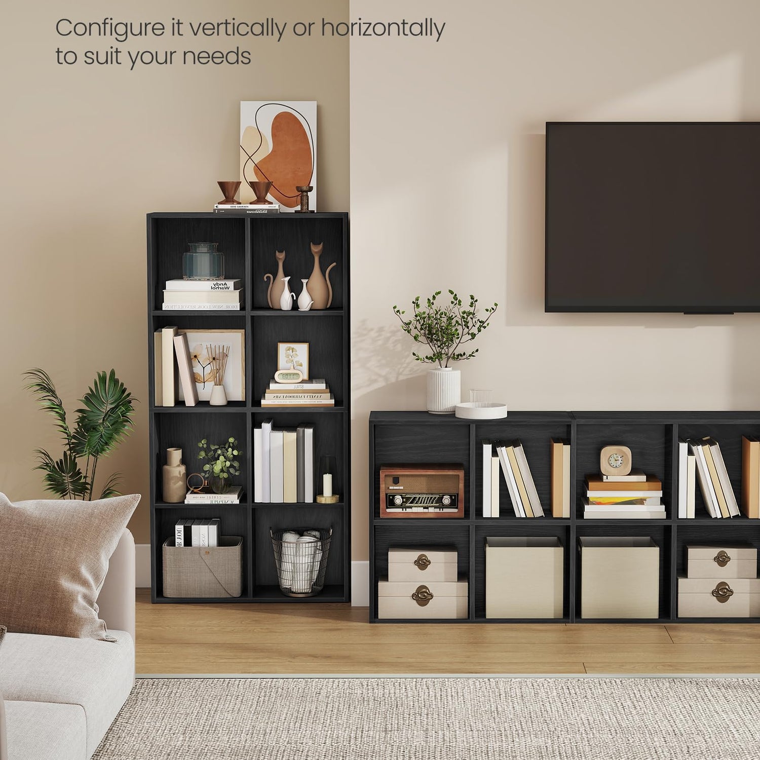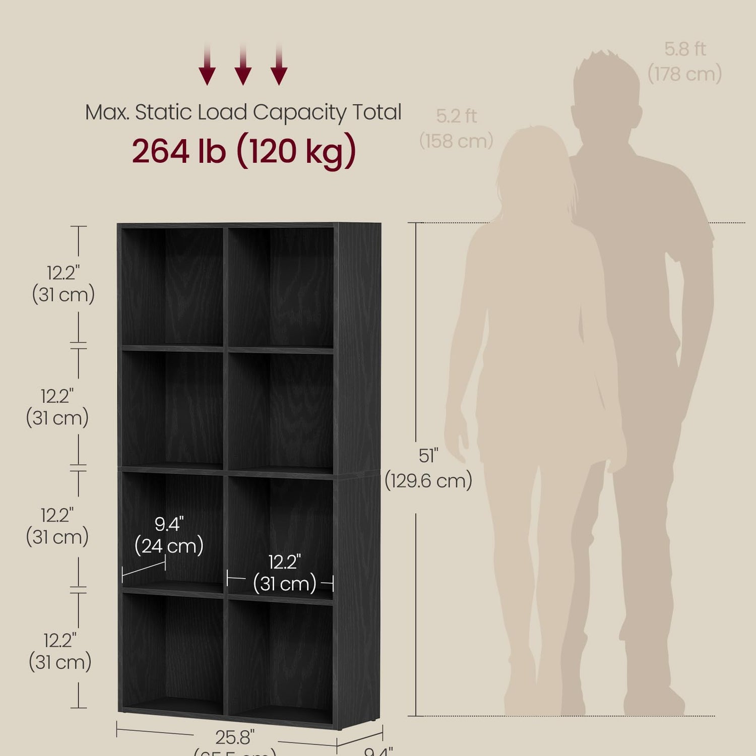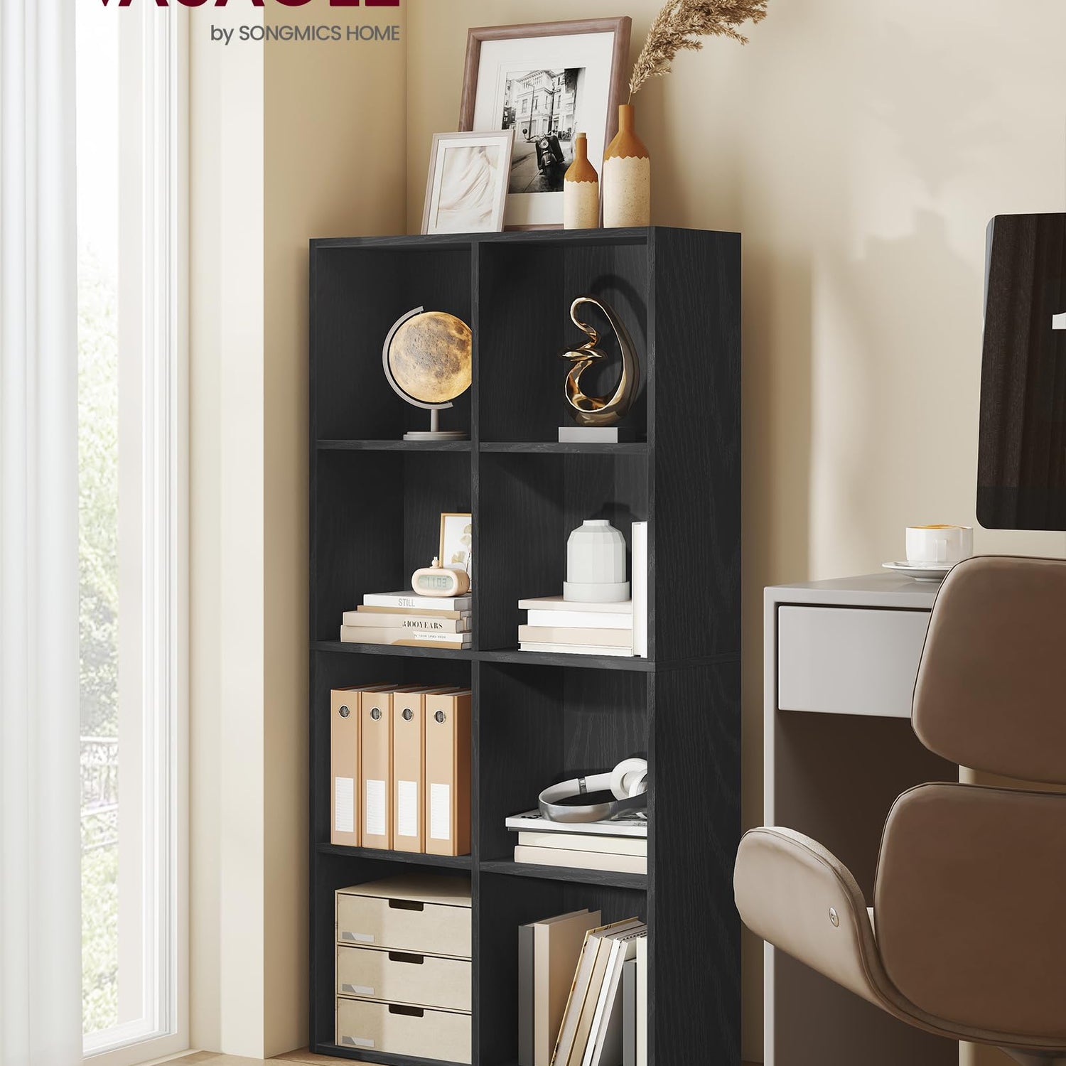 VASAGLE Custos Collection - Bookshelf, Bookcase, Cube Shelf with 8 Compartments, 9.4 x 25.8 x 51 Inches, Storage Shelf, for Living Room, Home Office, Dining Room, Ebony Black ULBC424B01