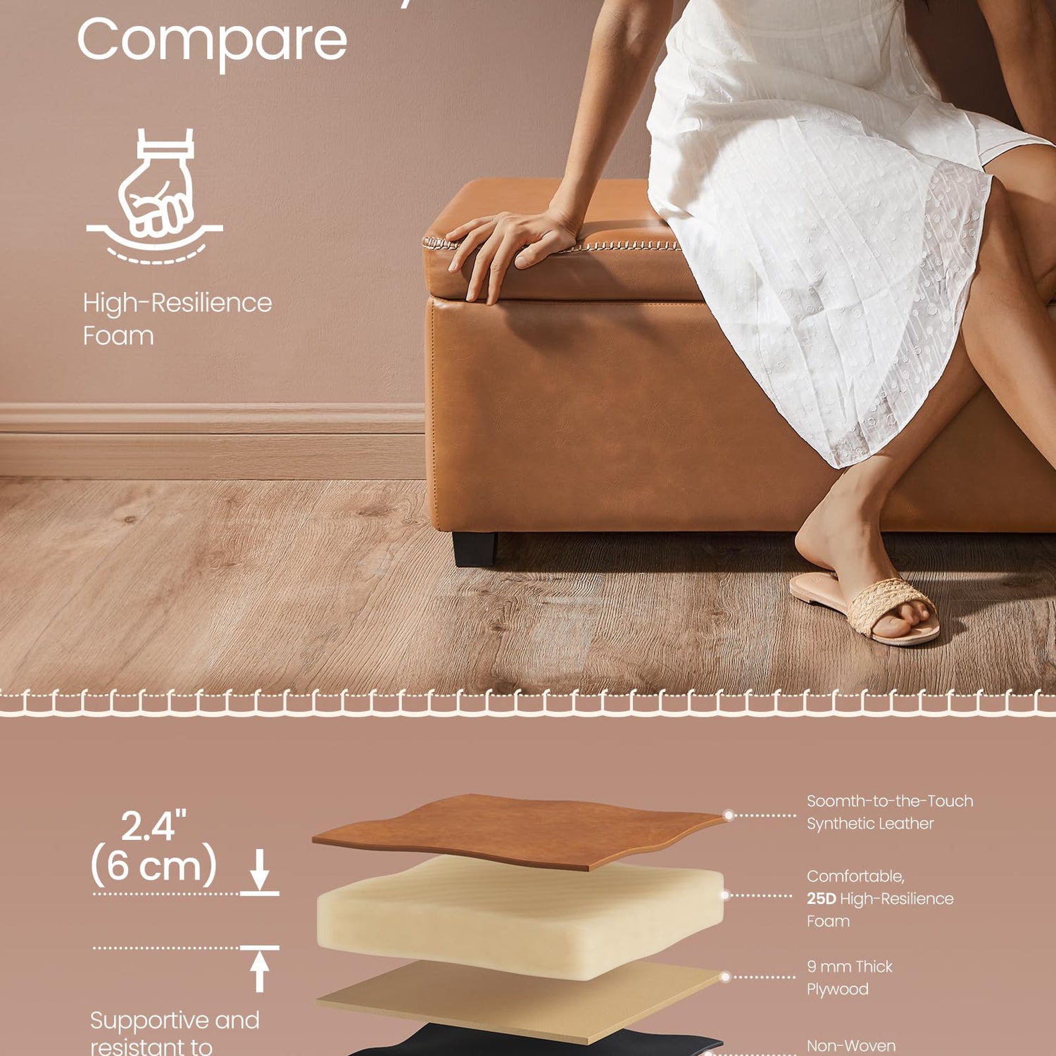 - [Comfort Meets Convenience] Glide your hand over the smooth, easy-to-clean cover, then sink into the 2.4" (6 cm) thick, supportive 25D high-resilience foam that resists deformation. This storage bench offers both a cozy seat and effortless upkeep