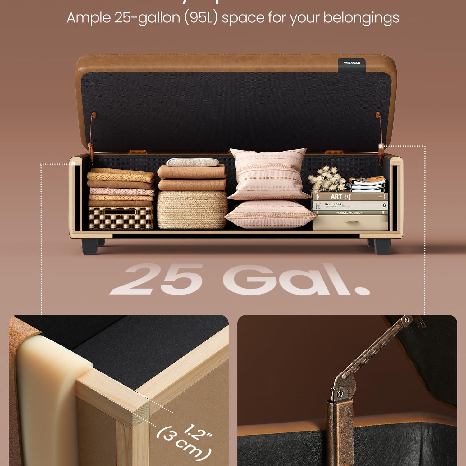 - [Spacious with Safety Hinges] With a 25 gal. (95L) capacity, our ottoman bench neatly stows everything from your blankets and pillows to clothes. The dual safety hinges on the lid promise smooth, safe operation and efficient access to your items