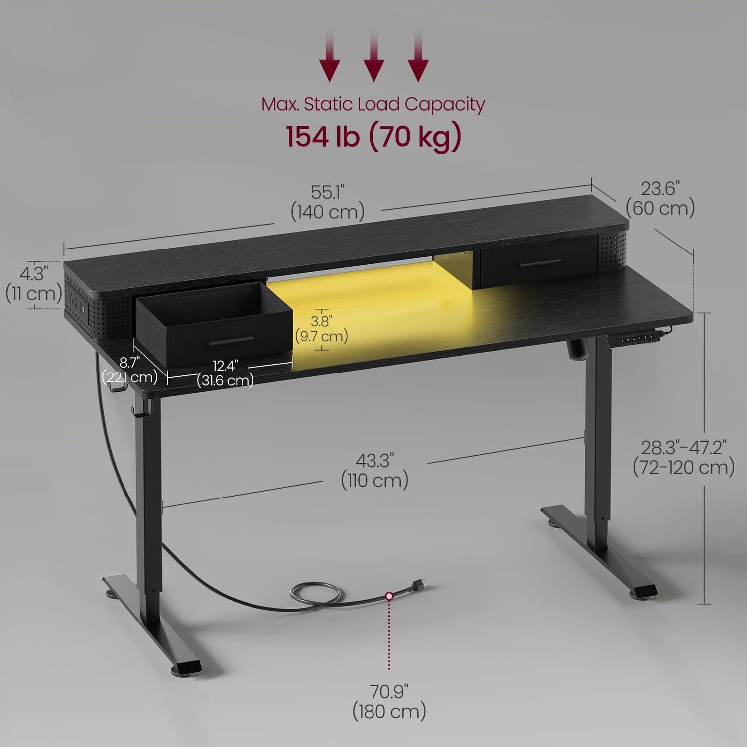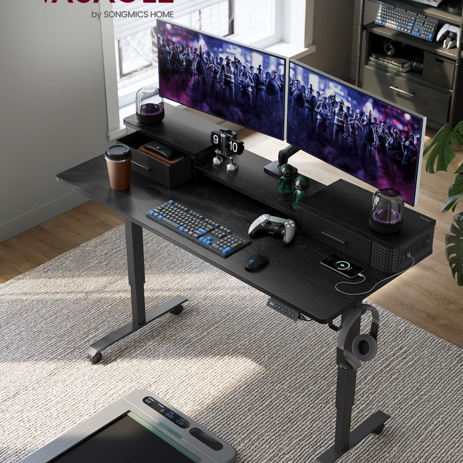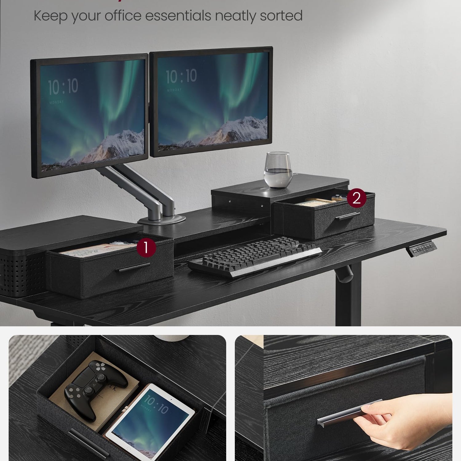 VASAGLE Electric Standing Desk with Drawers, 55.1 x 23.6 Inches, Sit Stand Desk with Power Outlet and LED Lights, Adjustable Height, Storage Shelf, 3 Memory Buttons, for Home Office, Ink Black