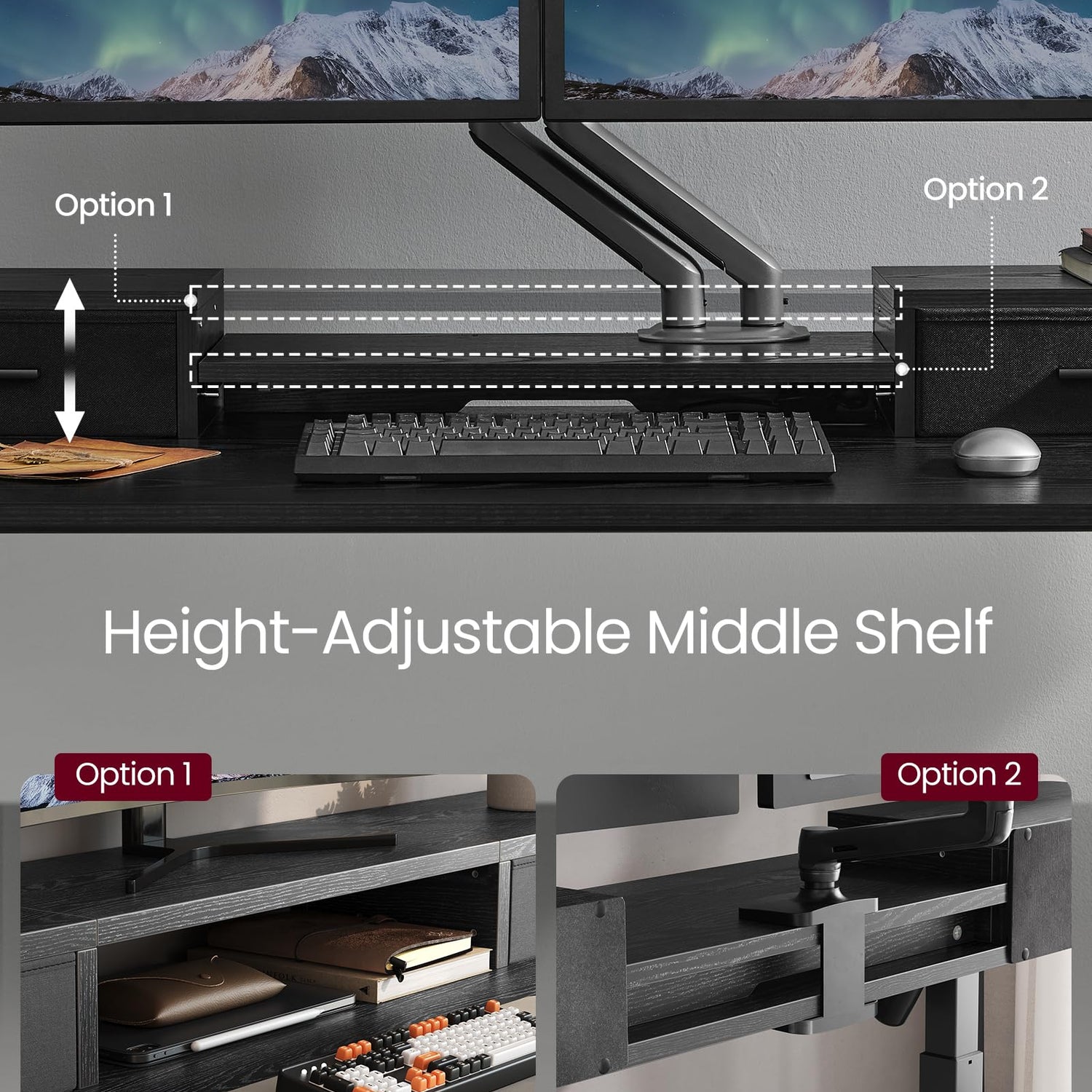 - 【ADJUSTABLE MIDDLE SHELF】Adjust the height of the electric standing desk's middle shelf to raise your screen to eye level, promoting proper posture and reducing neck and shoulder strain