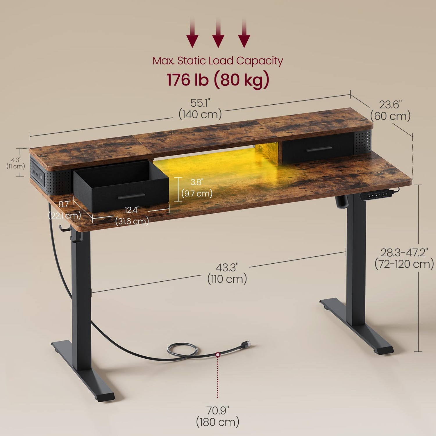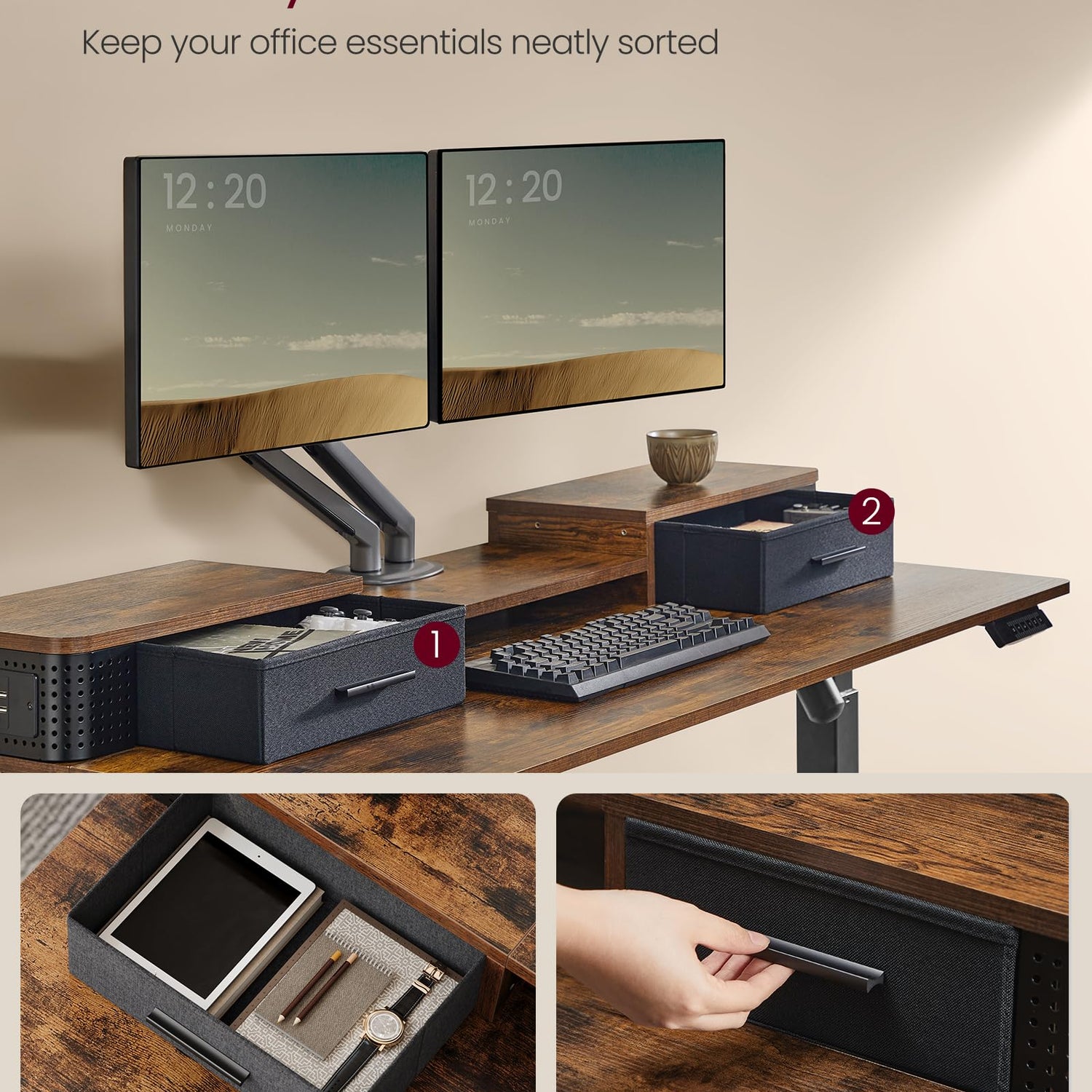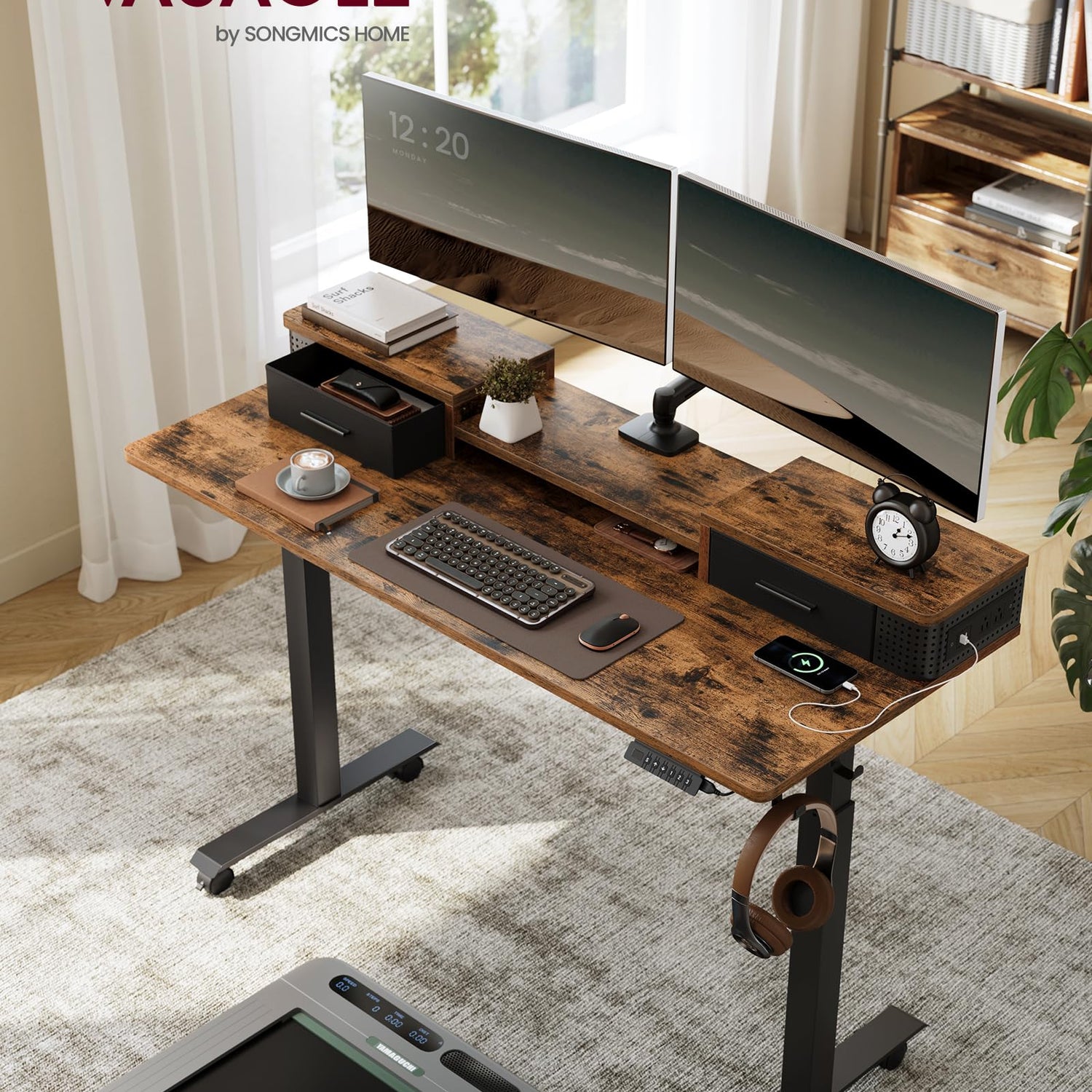 VASAGLE Electric Standing Desk with Drawers, Sit Stand Desk with Built-in Power Strip, Adjustable Height, 23.6 x 55.1 Inches, 2 Hooks, Memory Function, for Home Office, Rustic Brown ULSD184X21