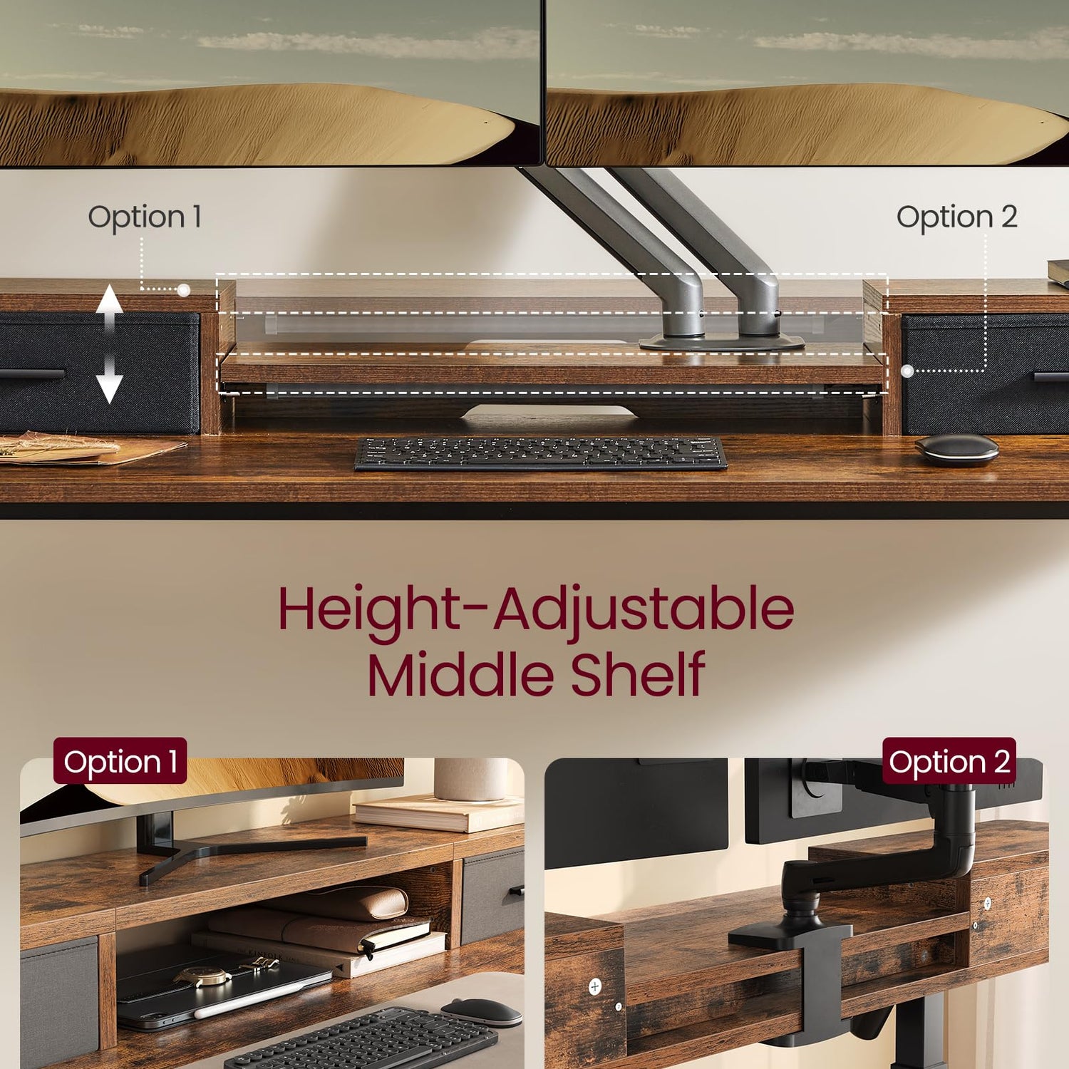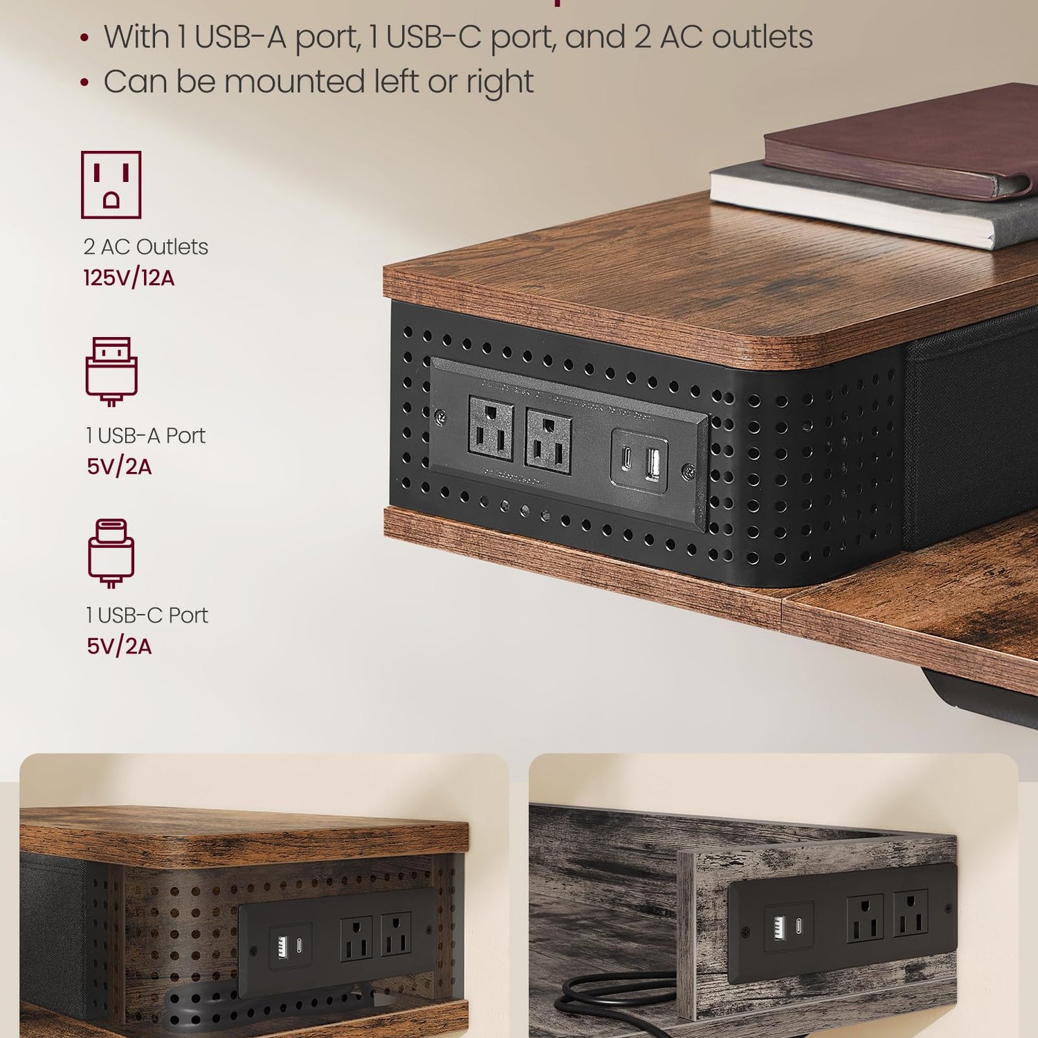 - [Adjust. Store. Charge.] The middle shelf can be adjusted in height as needed. 2 drawers provide space for small items, while the perforated panels keep cables organized. 2 AC outlets, 1 USB-A port, and 1 USB-C port conveniently charge your devices