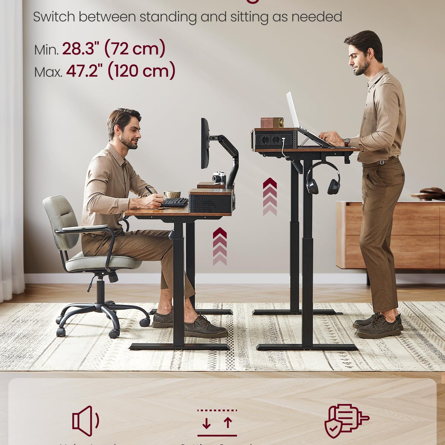 - [Premium Motor] The electric standing desk is equipped with a high-quality motor that offers smooth adjustment with a noise level below 50 dB. The height adjustment stops and retracts slightly when it encounters obstacles to protect your desktop