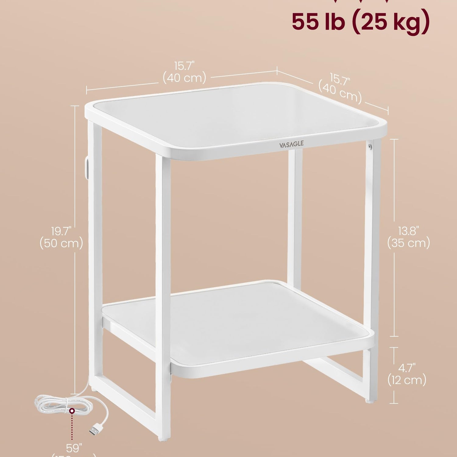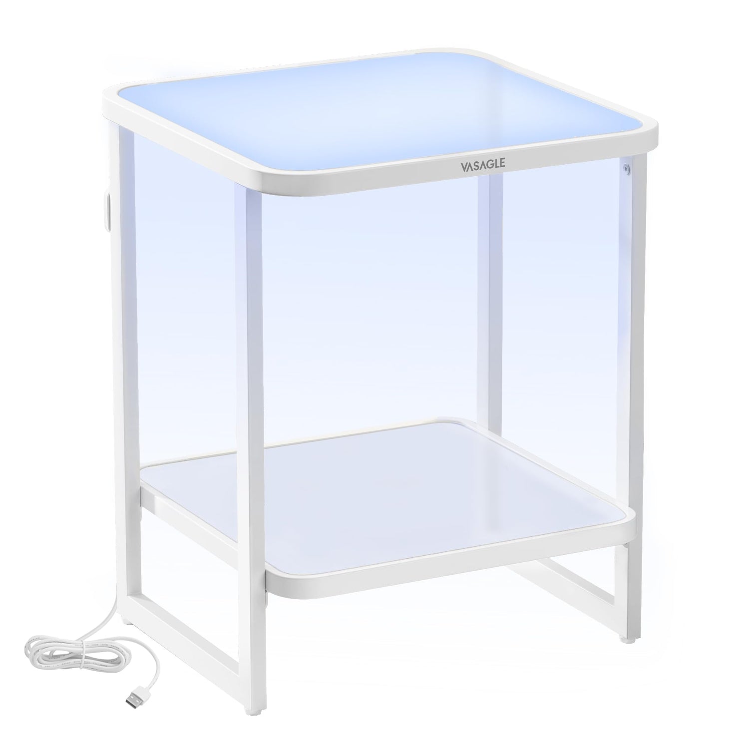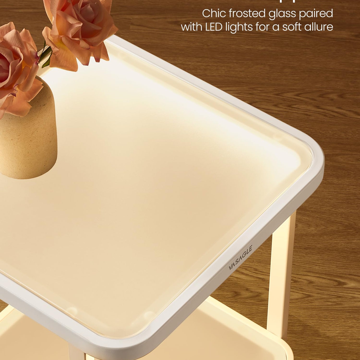 VASAGLE End Table, 2-Tier Side Table with LED Lights, Modern Nightstand, Square Bedside Table, Frosted Glass, Bottom Shelf, for Bedroom, Cloud White and Pearl White ULET232W01