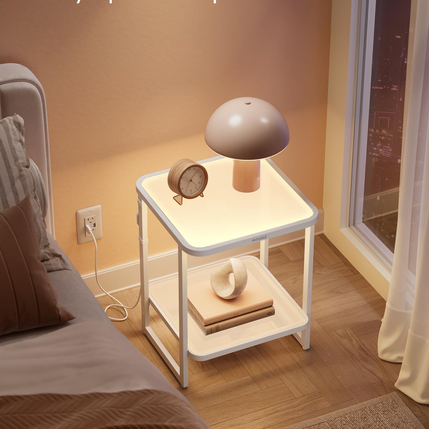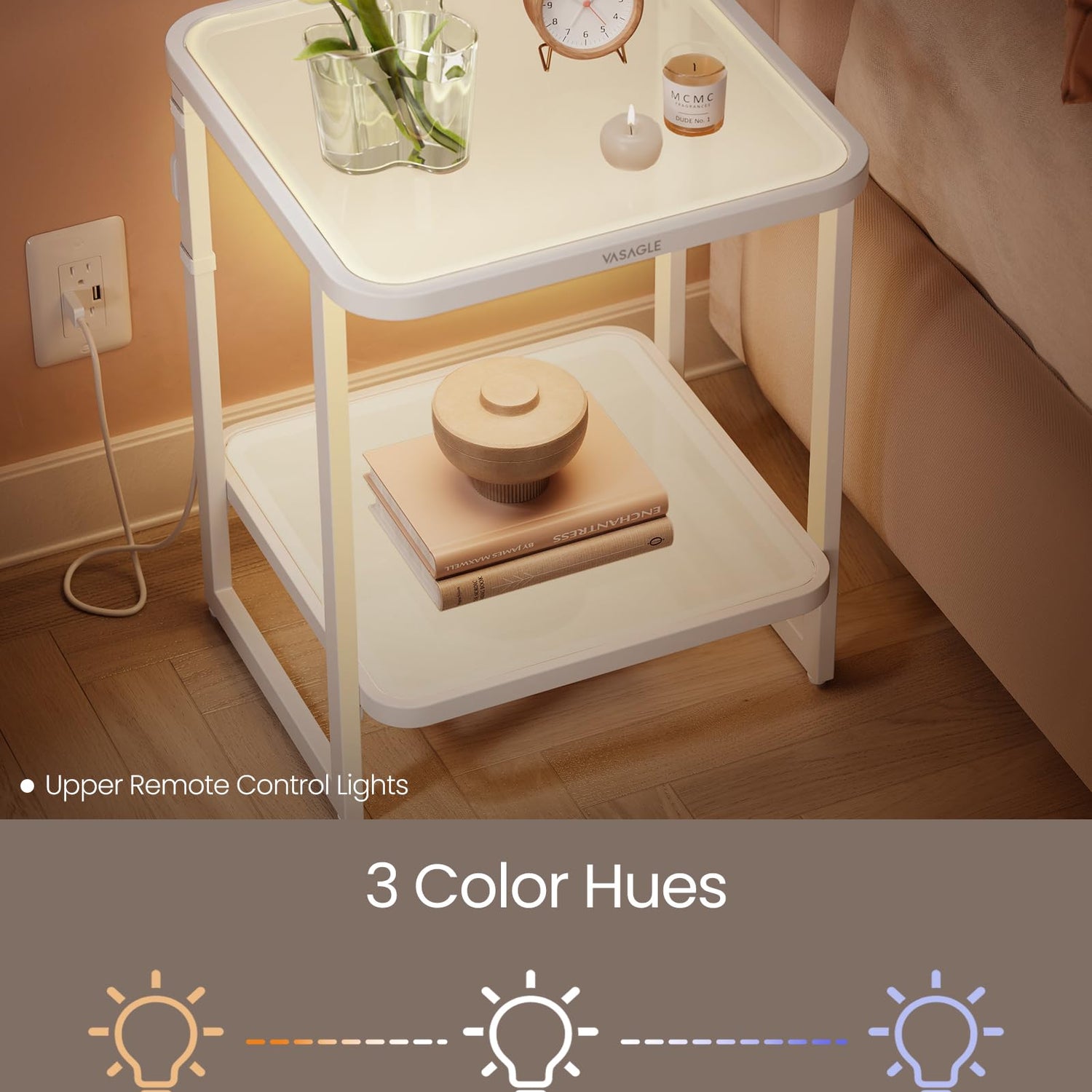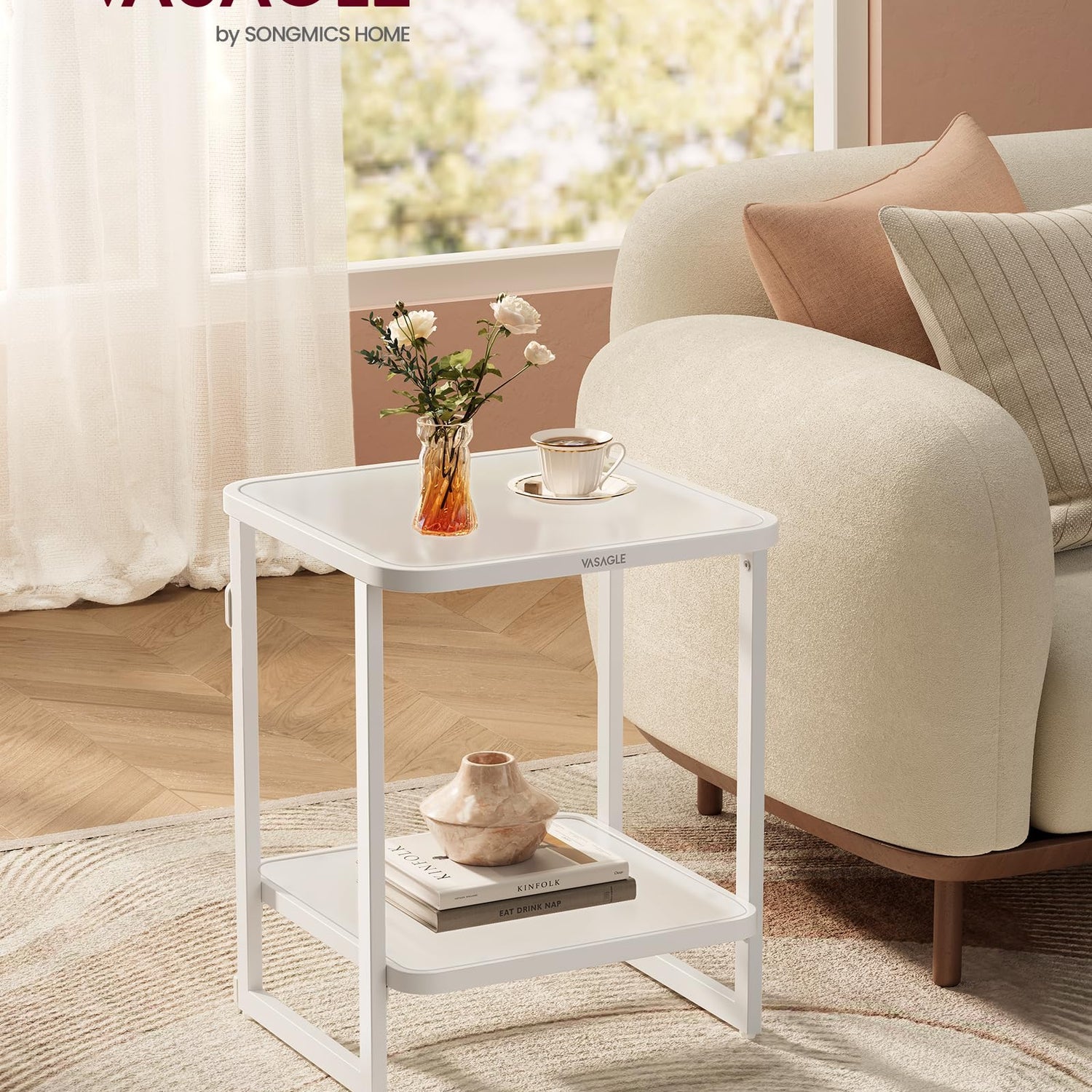 VASAGLE End Table, 2-Tier Side Table with LED Lights, Modern Nightstand, Square Bedside Table, Frosted Glass, Bottom Shelf, for Bedroom, Cloud White and Pearl White ULET232W01