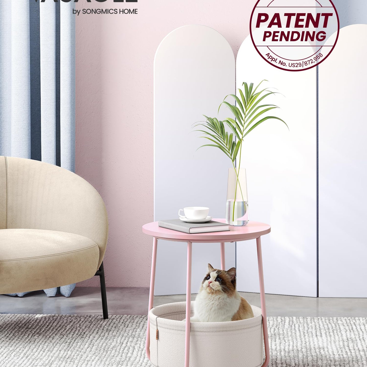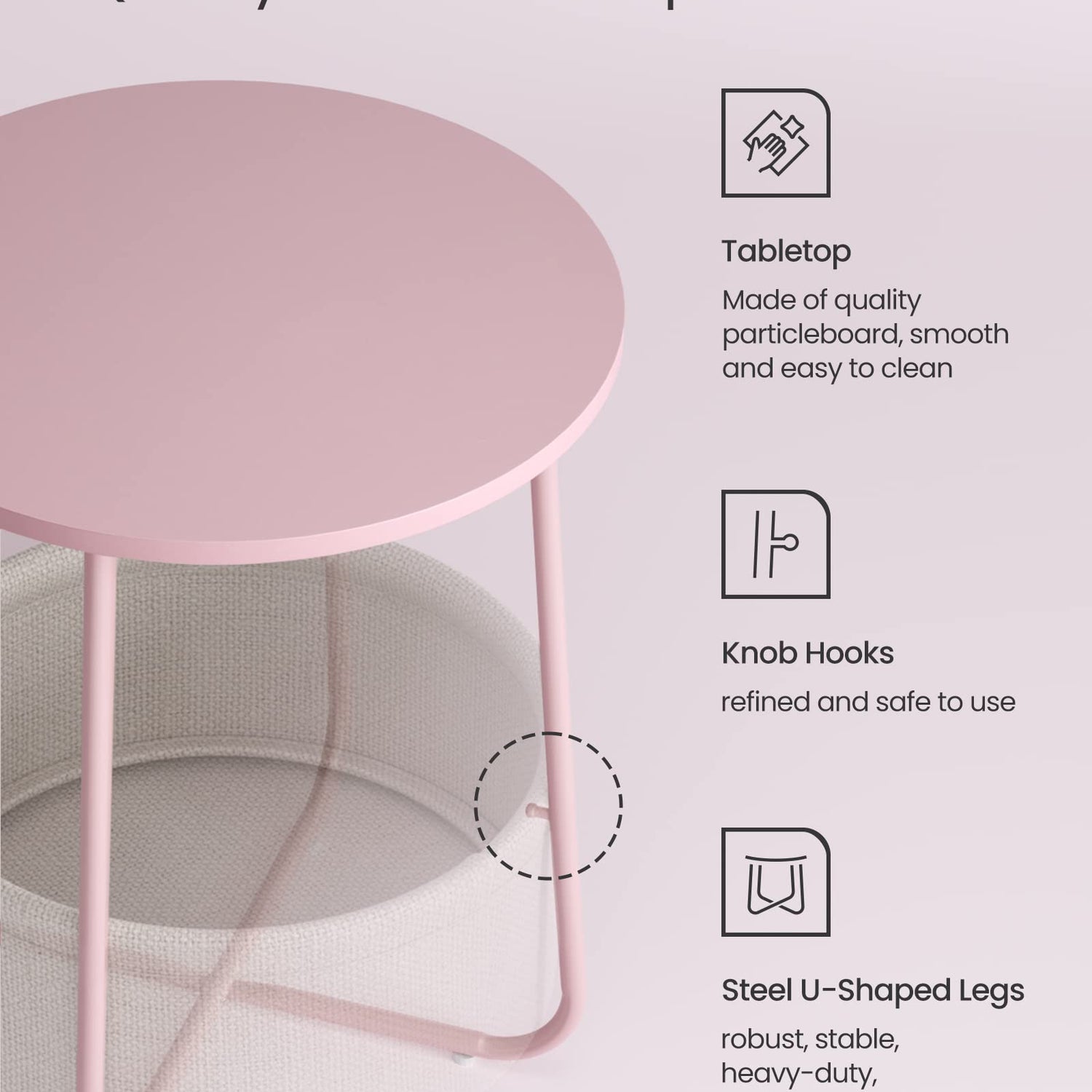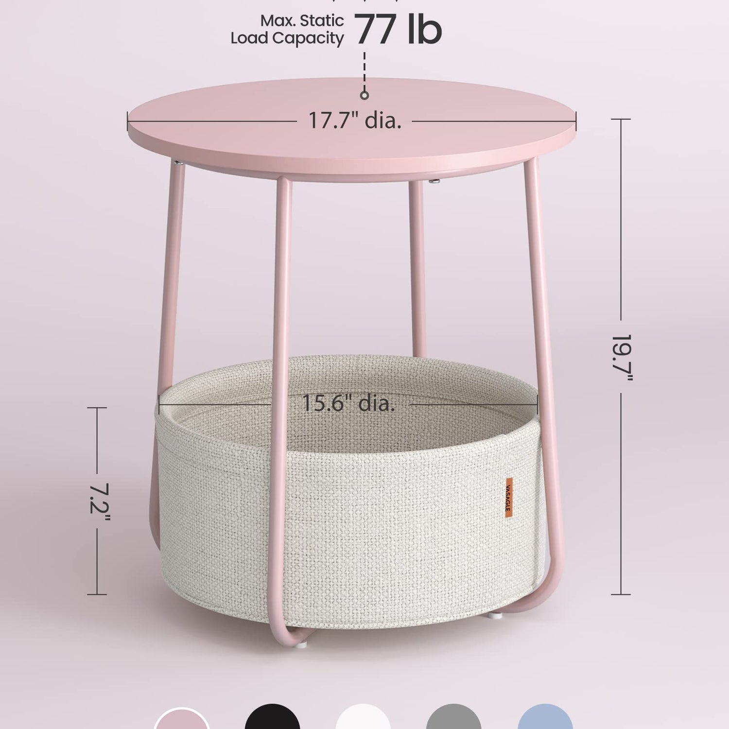 VASAGLE End Table, Small Bedside Table with Fabric Basket, Modern Nightstand, Round Side Table, for Living Room, Bedroom, Jelly Pink and Cream White ULET223R61
