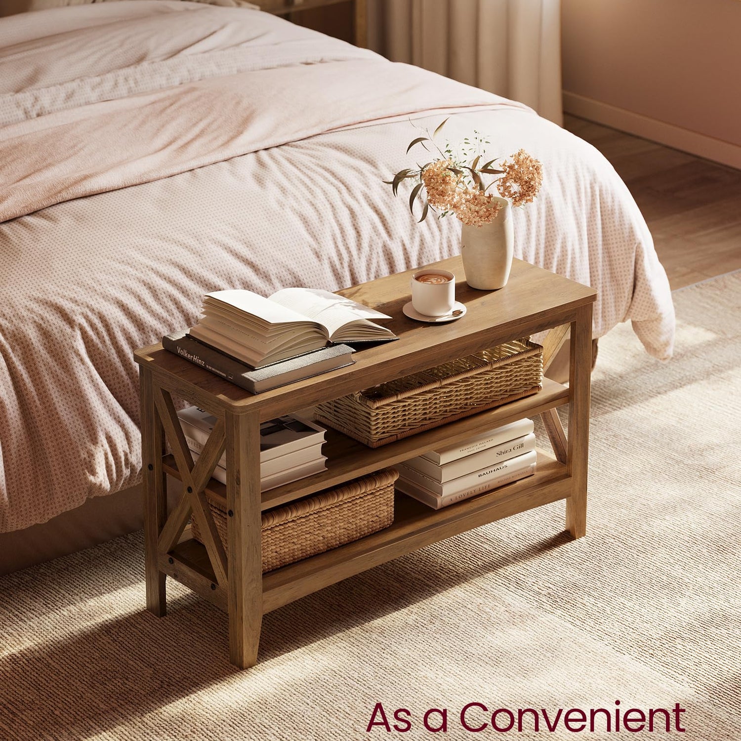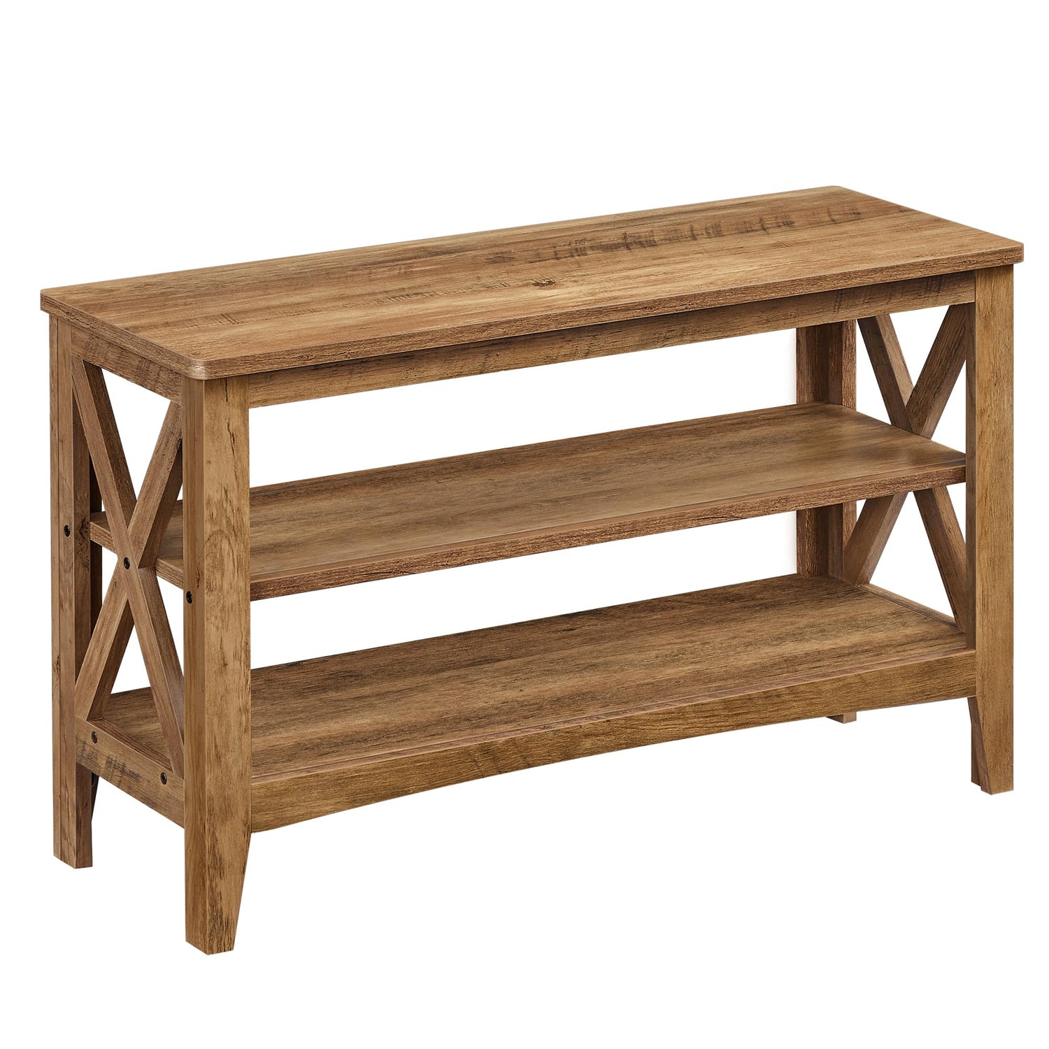 - [Farmhouse Style] Change shoes on this remarkable shoe bench with storage! The 2-tier honey brown shoe bench adds a farmhouse flair to your home while offering ample storage space for your shoes