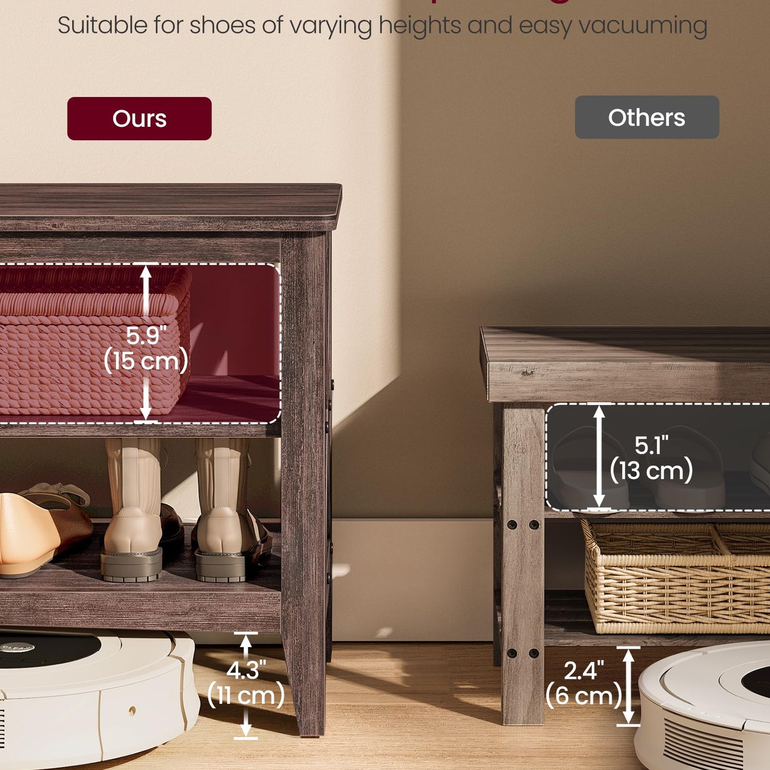 - [Increased Spacing] The shoe storage bench has two 5.9" high middle shelves for versatile shoe storage. The bottom shelf, positioned 4.3" above the floor, is perfect for placing slippers or for easy vacuuming
