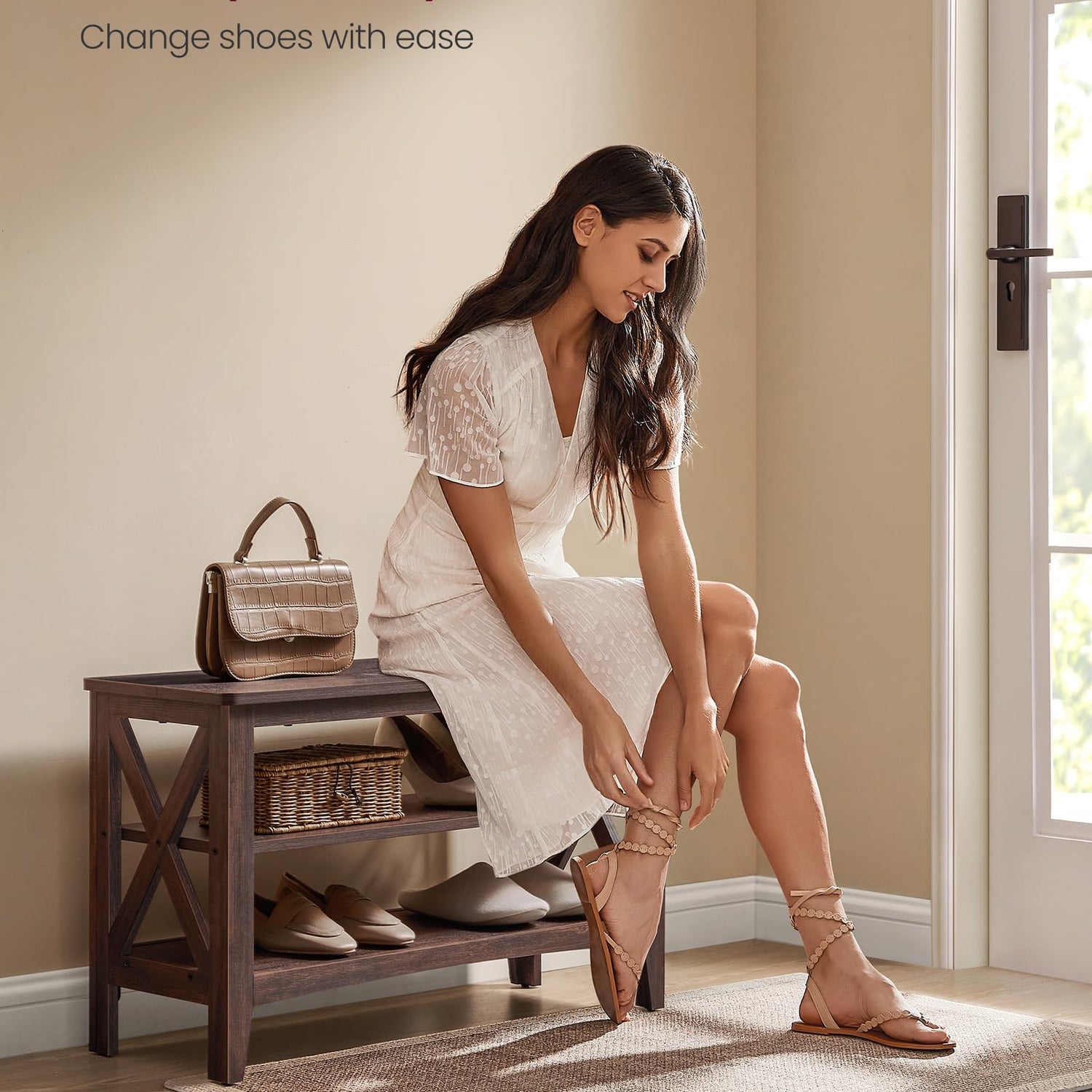- [Farmhouse Style] Change shoes on this remarkable shoe bench with storage! The 2-tier maroon brown shoe bench adds a farmhouse flair to your home while offering ample storage space for your shoes