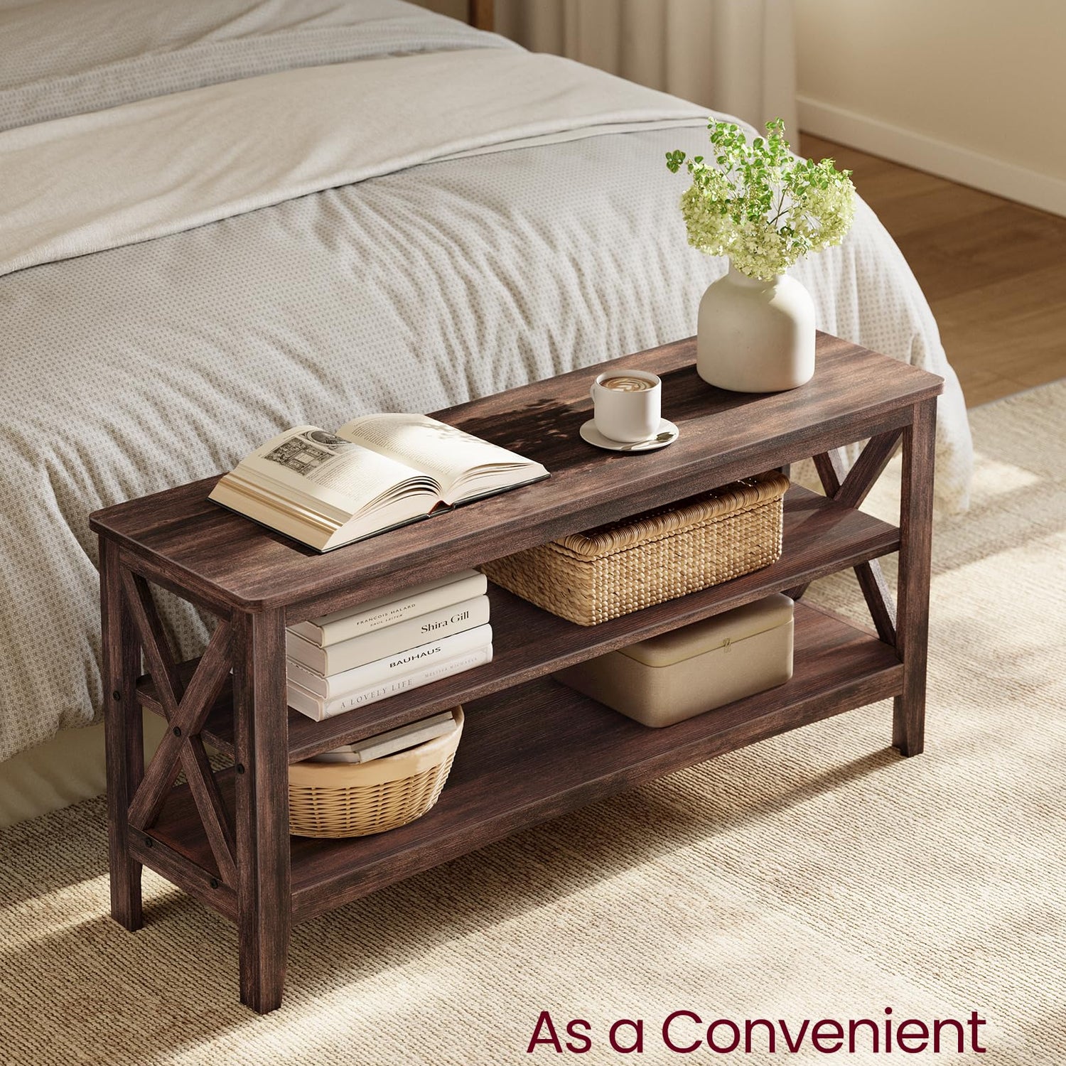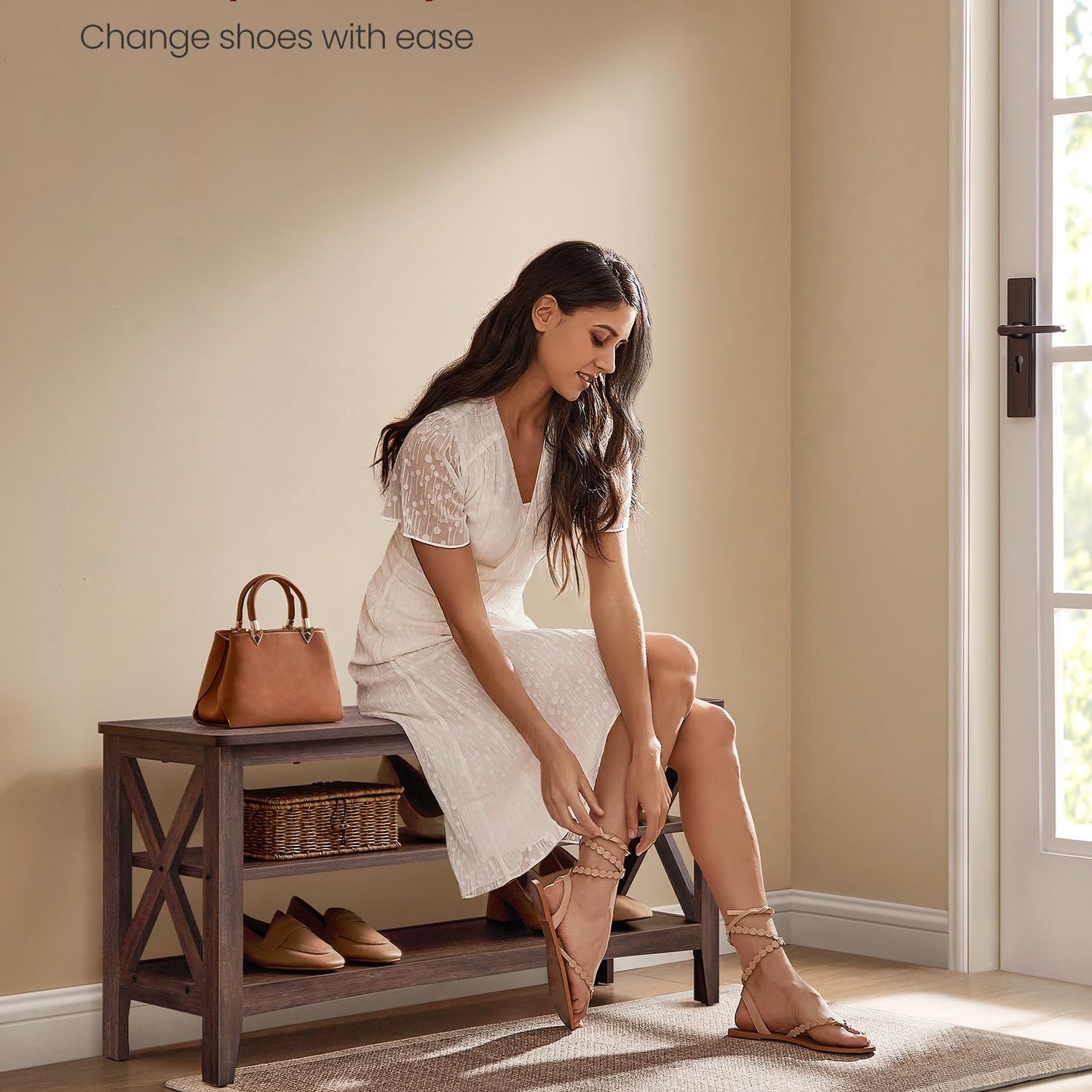 - [Farmhouse Style] Change shoes on this remarkable shoe bench with storage! The 2-tier maroon brown shoe bench adds a farmhouse flair to your home while offering ample storage space for your shoes