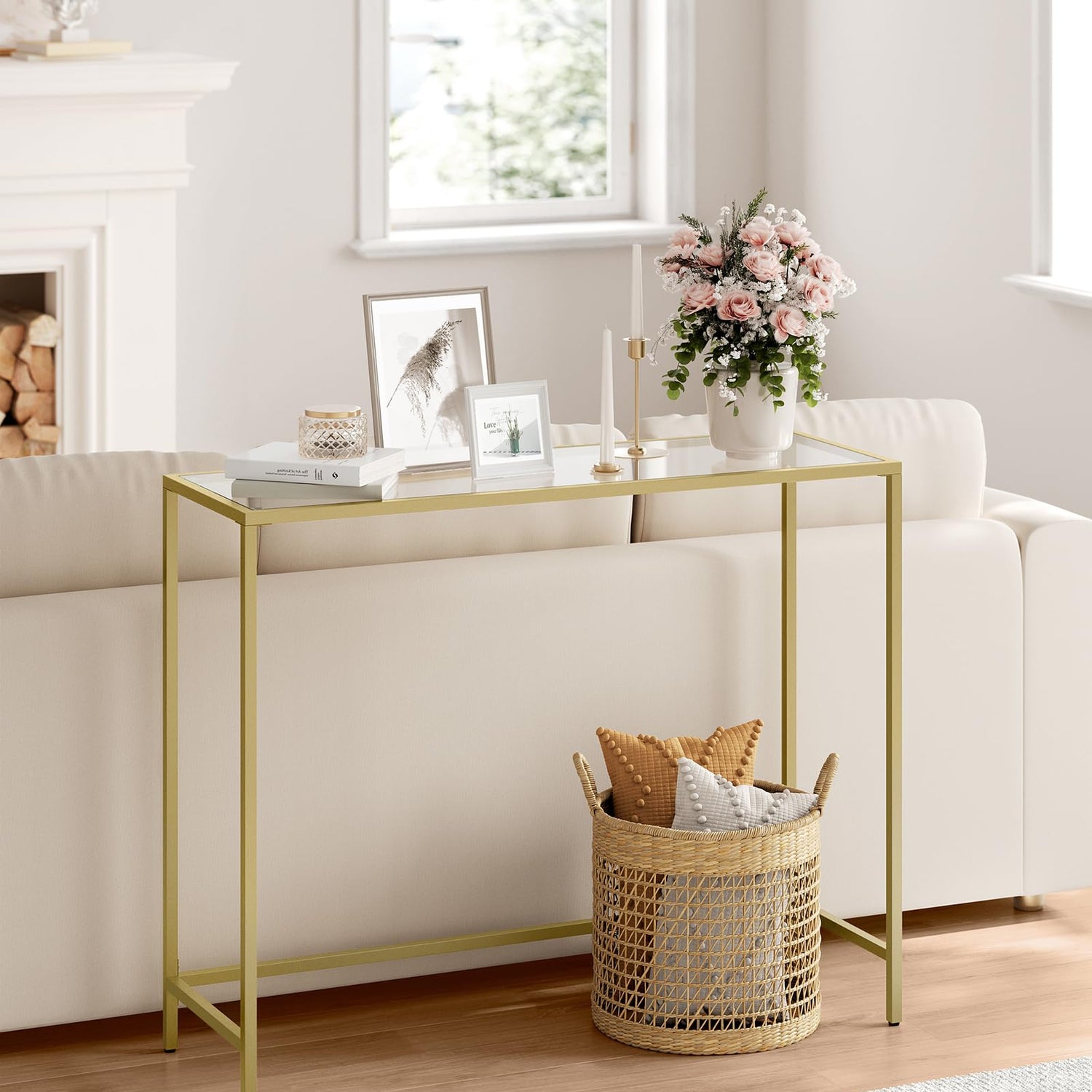 - [Stunning Minimalism] Take your home to the next level with a modern console table that unites sleek, pale gold steel and a tempered glass top into one minimalist-yet-functional piece