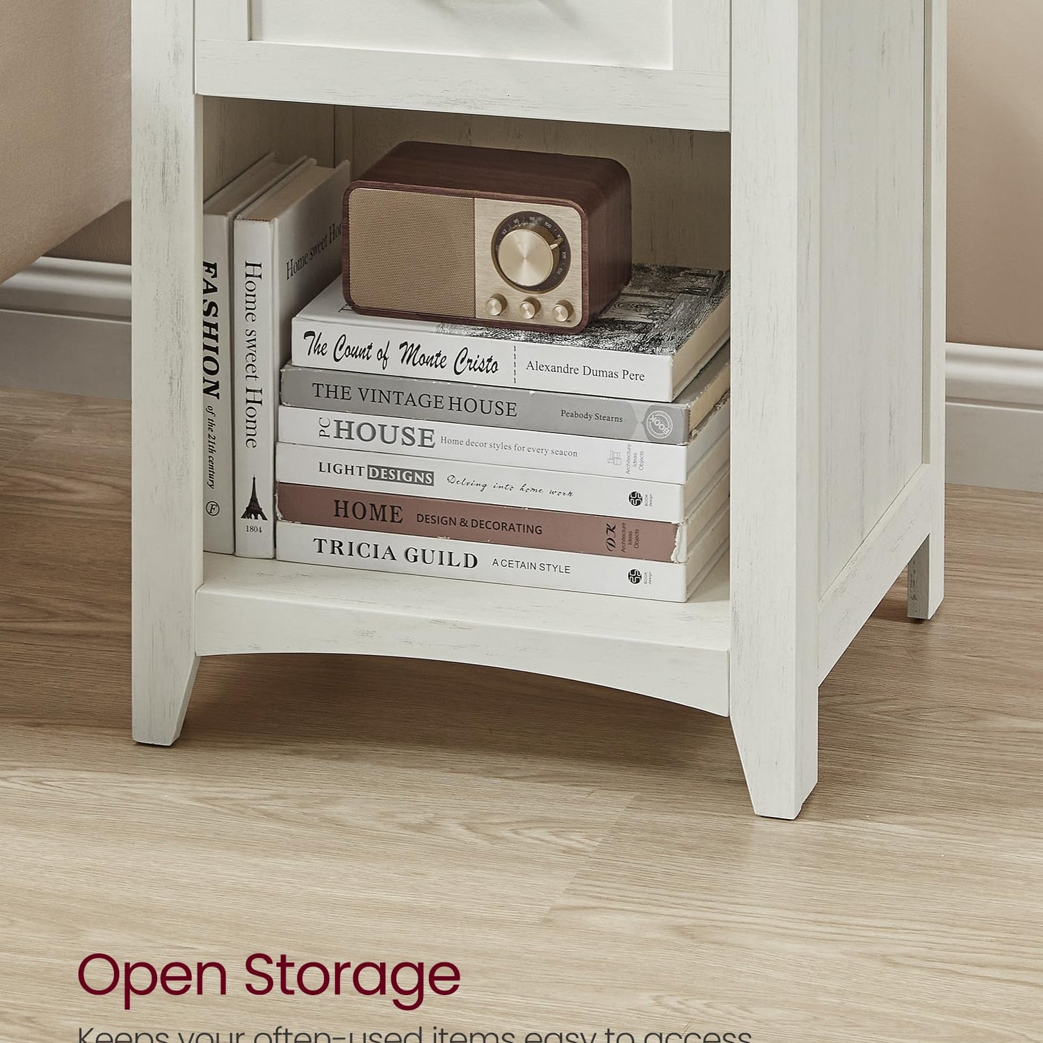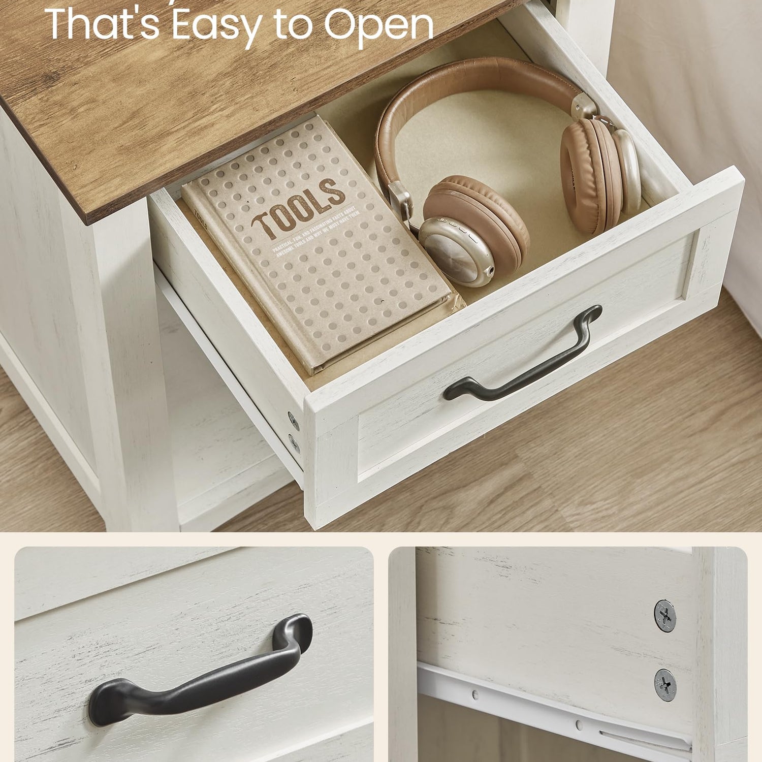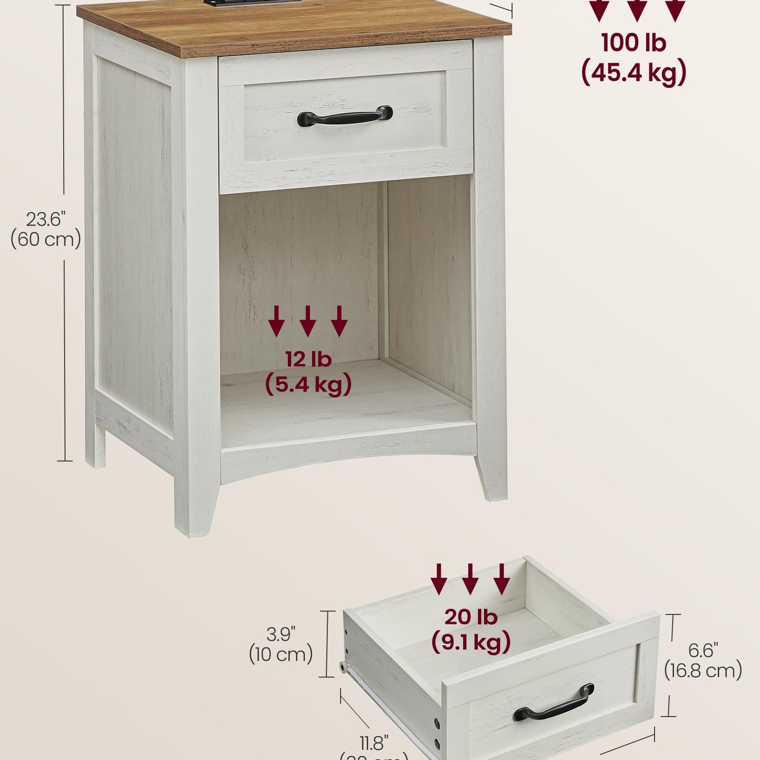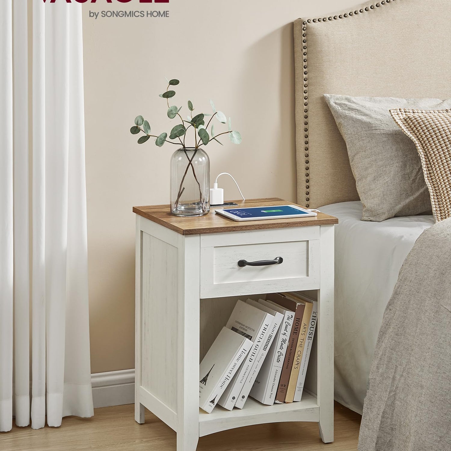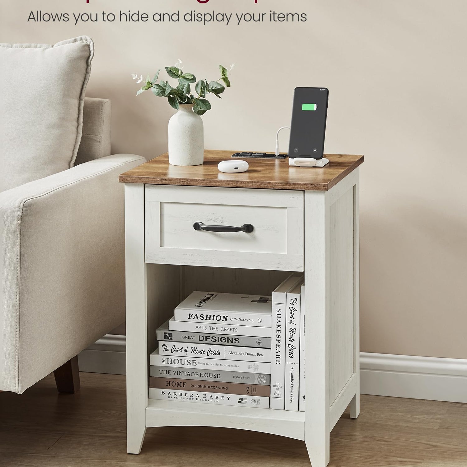 VASAGLE Farmhouse Nightstand with Charging Station, Bedside Table with Drawer, Open Compartment, Side Table with Storage, for Bedroom, Rustic White