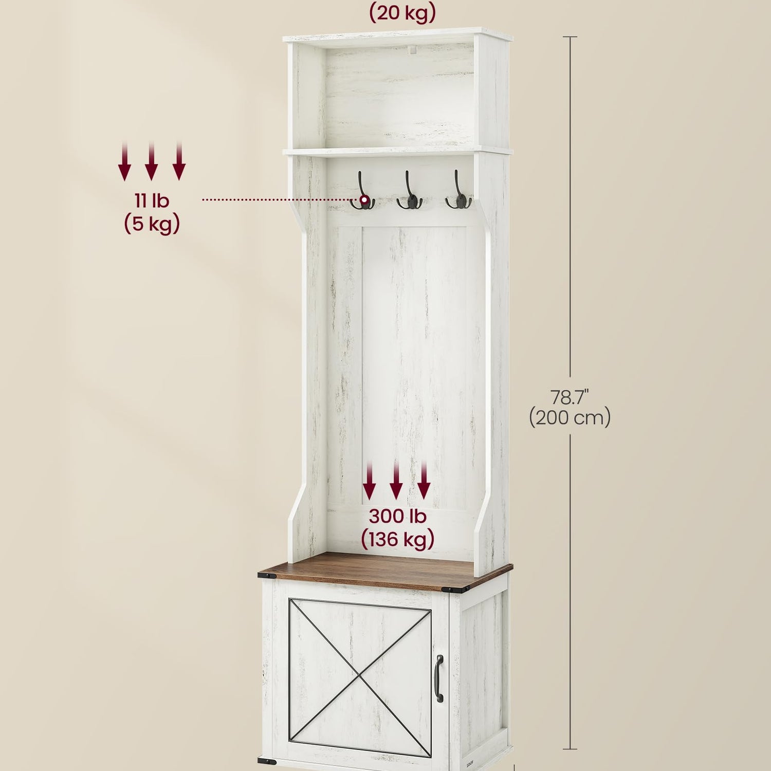 - 【STURDY AND DURABLE】Made from premium particleboard and reinforced steel, this hall tree with bench is designed for lasting use. The bench supports up to 300 lb, offering a reliable place to sit while changing shoes