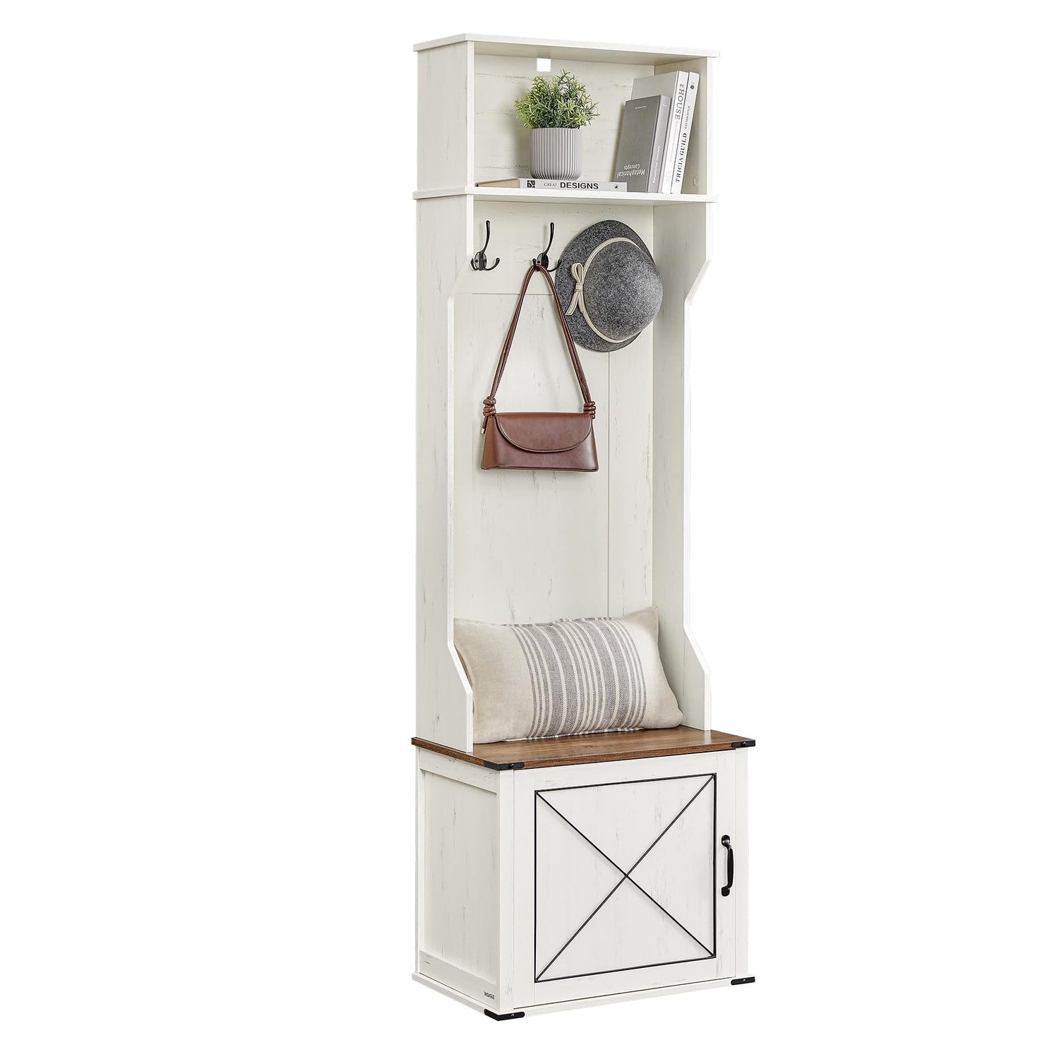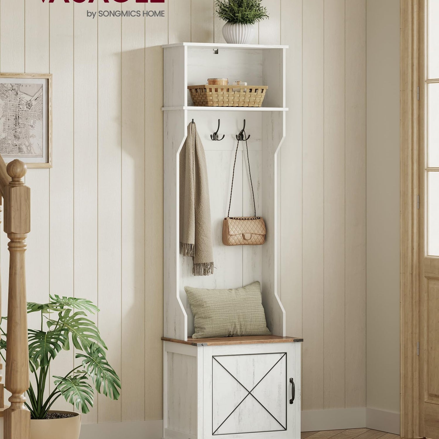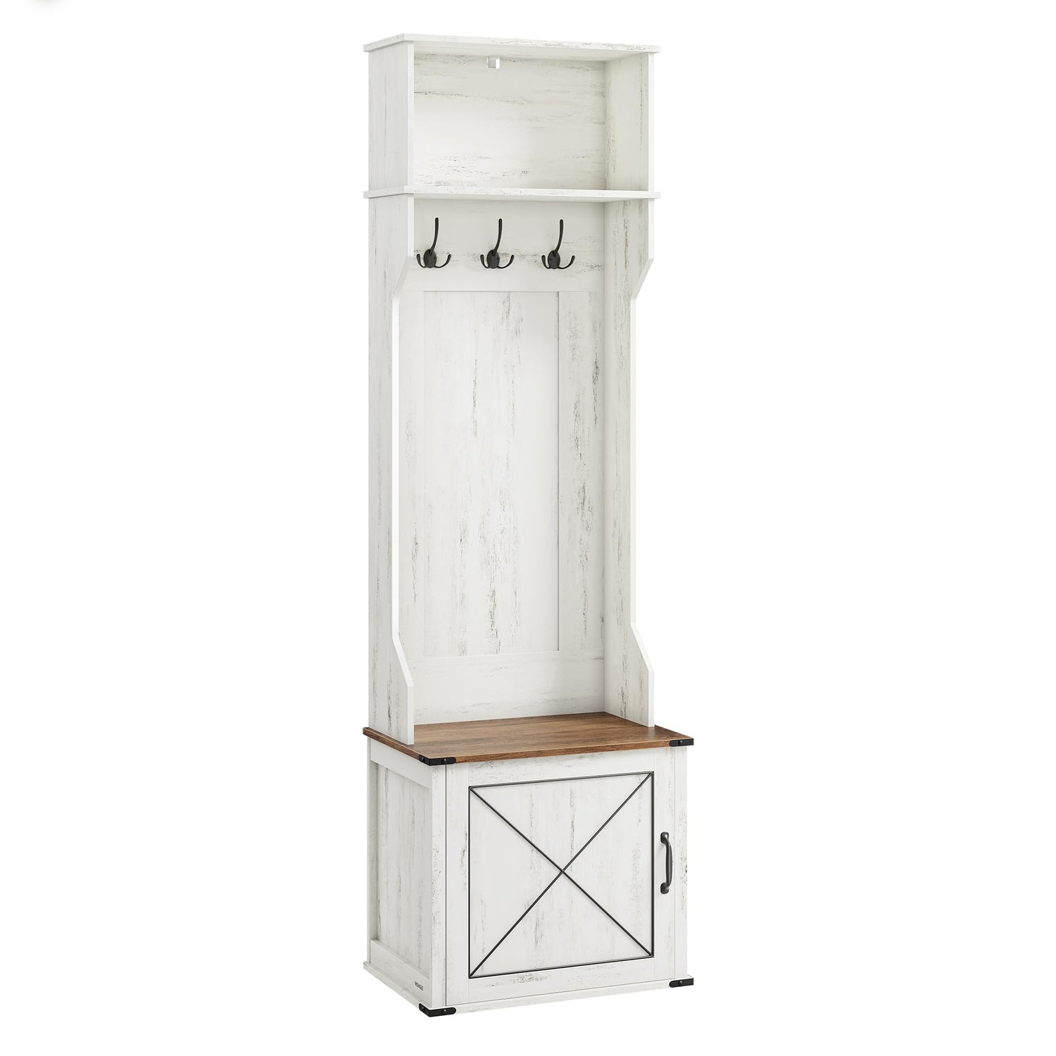 VASAGLE Hall Tree with Bench and Shoe Storage, Coat Rack with Shoe Bench, Entryway Furniture, 3 Tri-Hooks, Door with Handle, Farmfouse Style, Space Saving, Rustic White and Honey Brown UHSR441W01