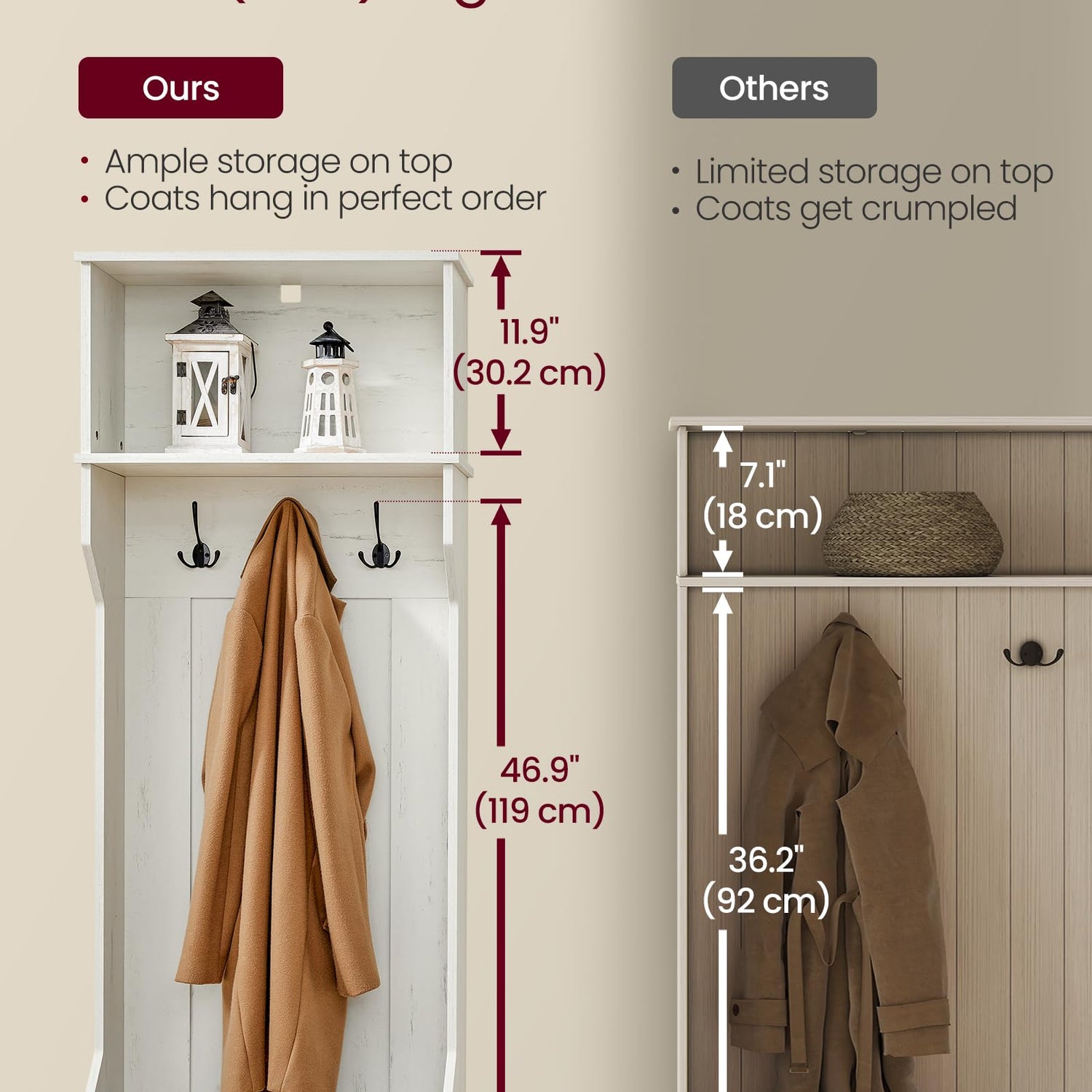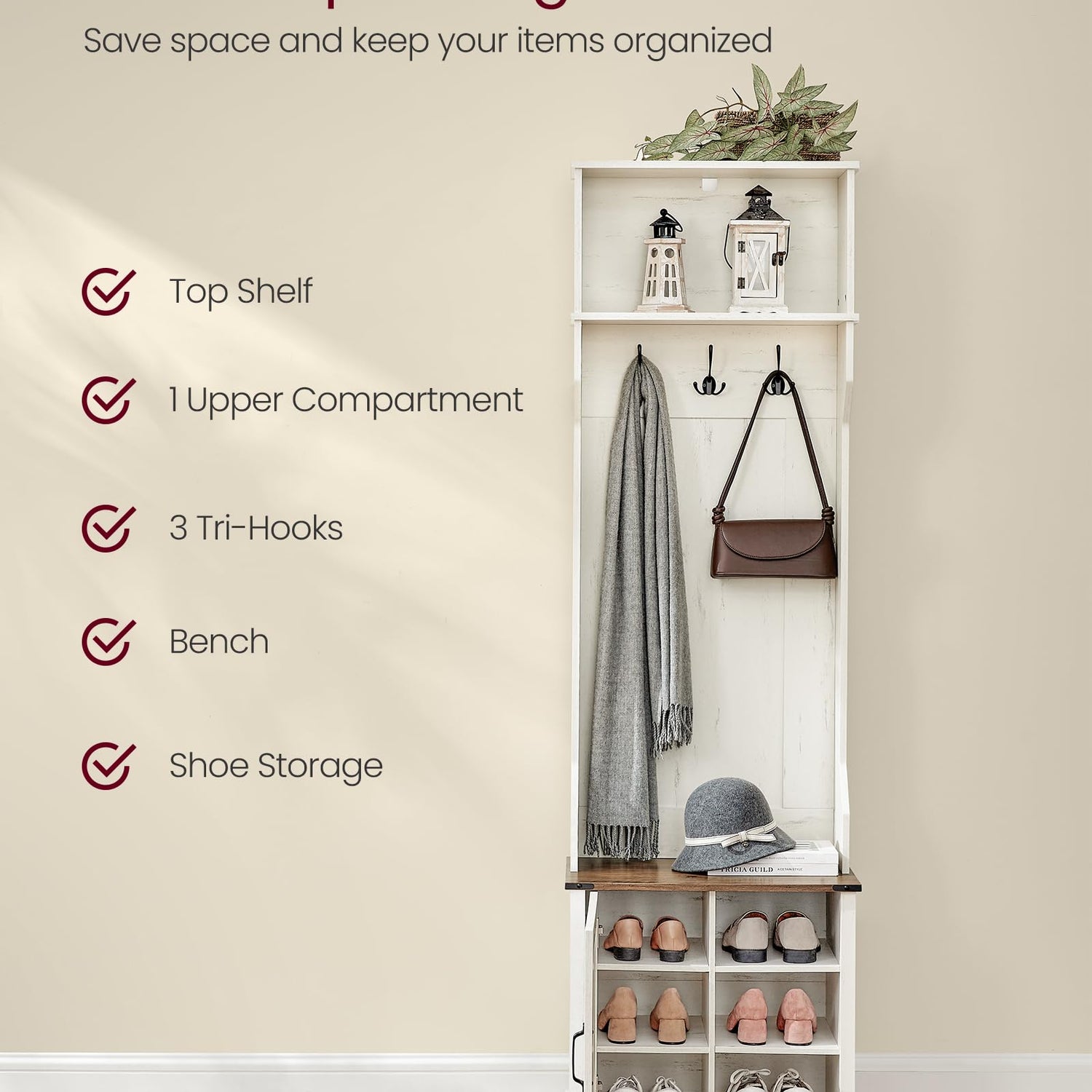 - 【MULTIFUNCTIONAL 4-IN-1-DESIGN】This versatile hall tree features a spacious top compartment, 3 tri-hooks, a comfortable bench, and a convenient shoe shelf, all designed to optimize your space and create an organized, functional entryway