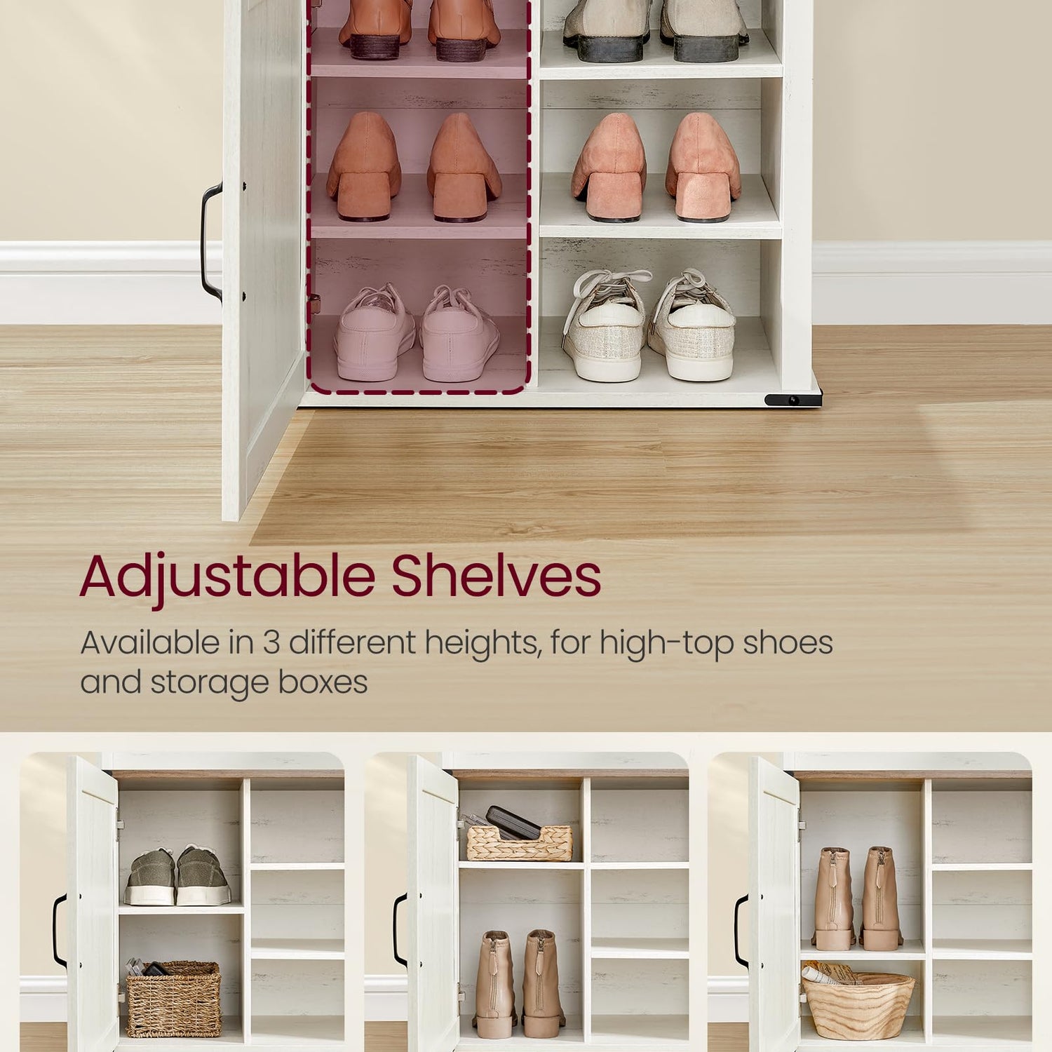 - 【ADAPTABLE SHOE STORAGE】Each shelf inside the bottom of the shoe cabinet is adjustable, with 3 height options and the ability to be removed, making it easy to store various types of footwear