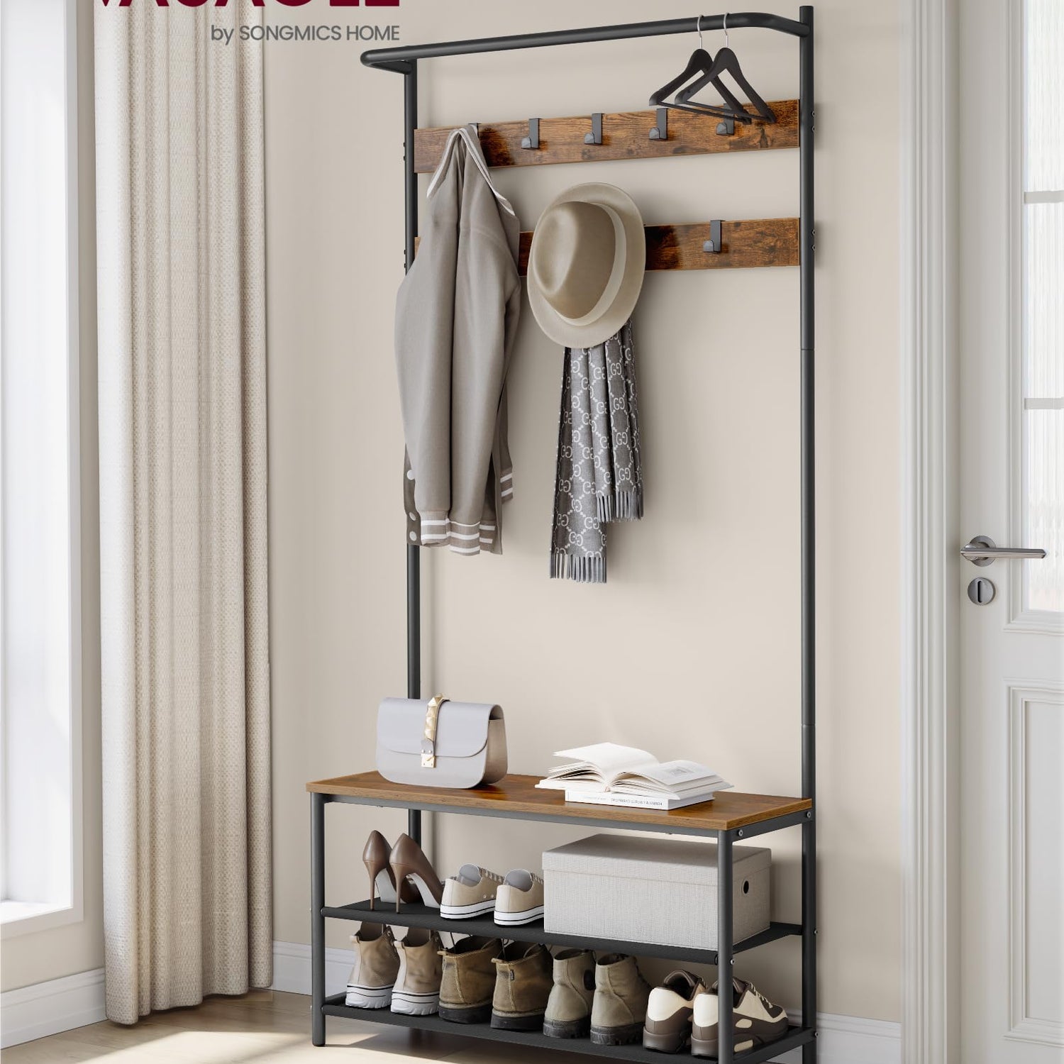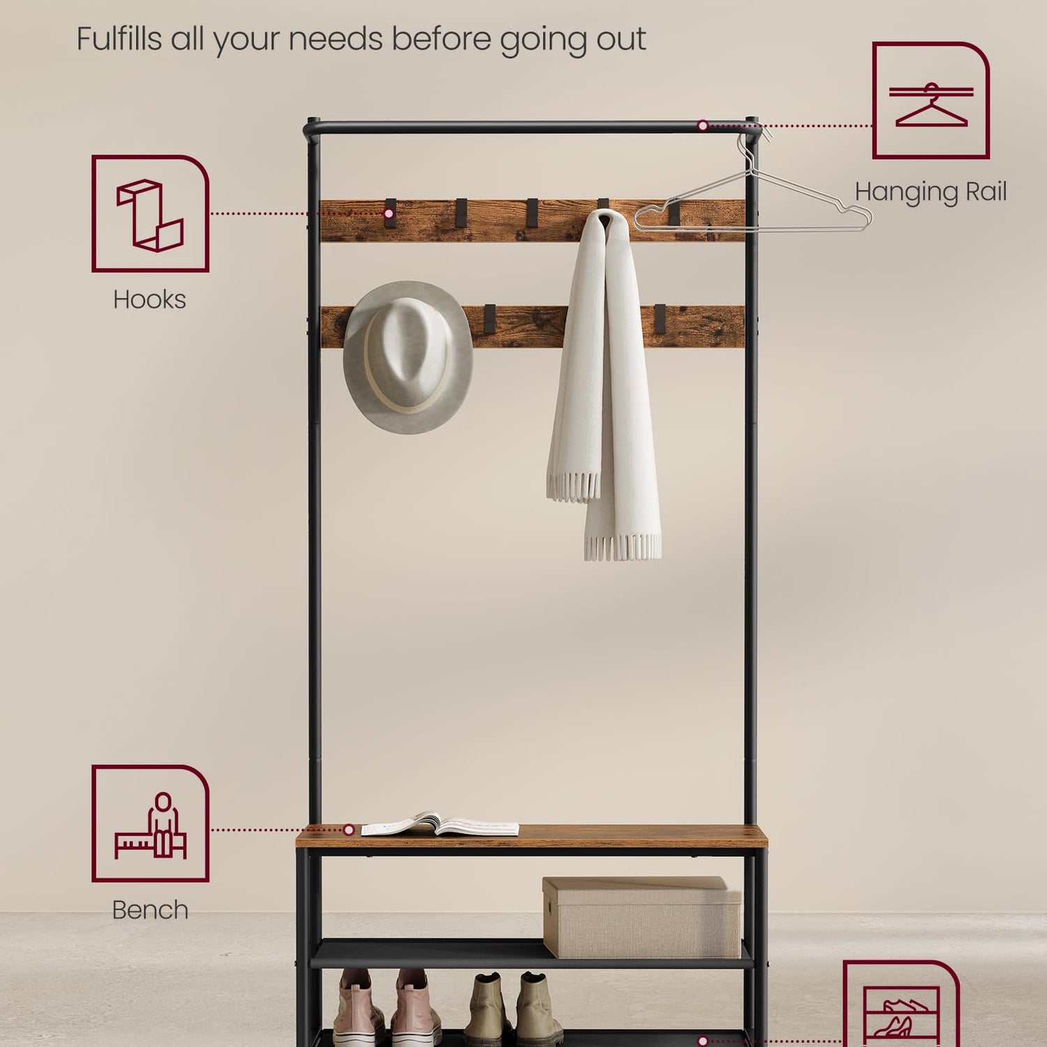 - [4-in-1 Hall Tree] This multi-functional hallway coat rack boasts a top hanging rail, 9 hooks, 2 shoe shelves, and a shoe bench, allowing you to hang clothes, store shoes, and sit down to comfortably change your shoes at the same time