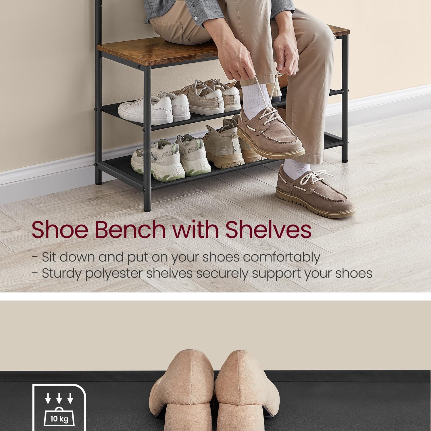 - [Sturdy and Stable] The sturdy steel frame and adjustable feet keep the shoe rack balanced, the firm particleboard shoe bench supports up to 198 lb, and we include an anti-tip kit for extra safety